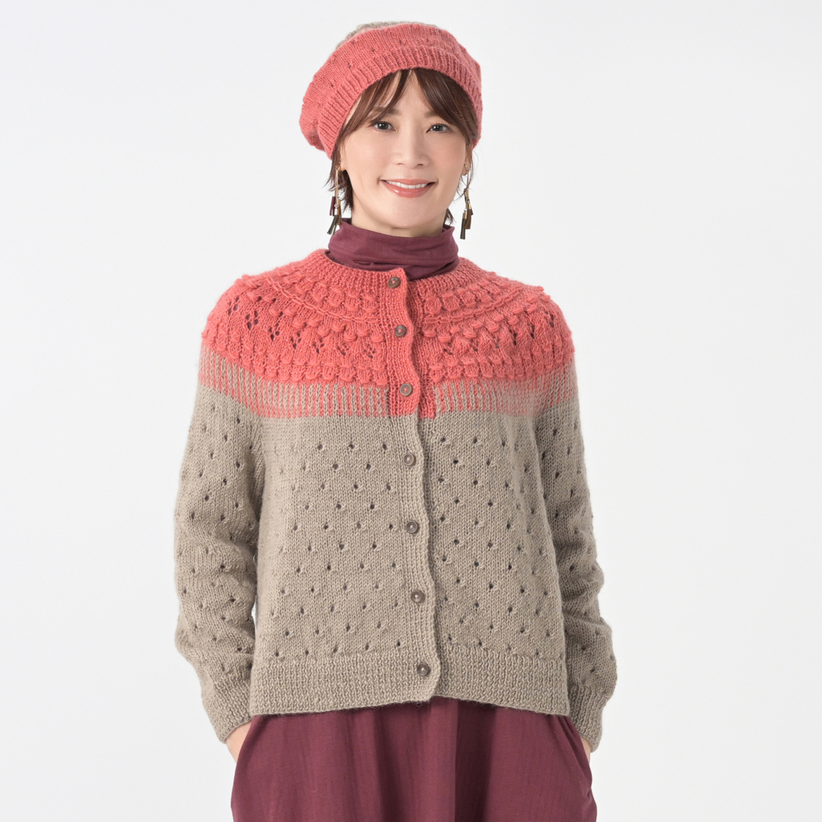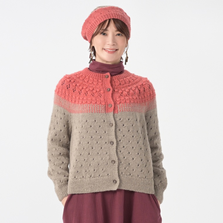 ニュージーランドの羊毛を使った、ウール100%のカーディガン。アイレットの透かしとフェアアイルを組合せた、表情豊かな手編みカーディガンです。ほんのりグラデーションをかけたように、首まわりからヨークにかけてフェアアイル柄でアクセントをつけています