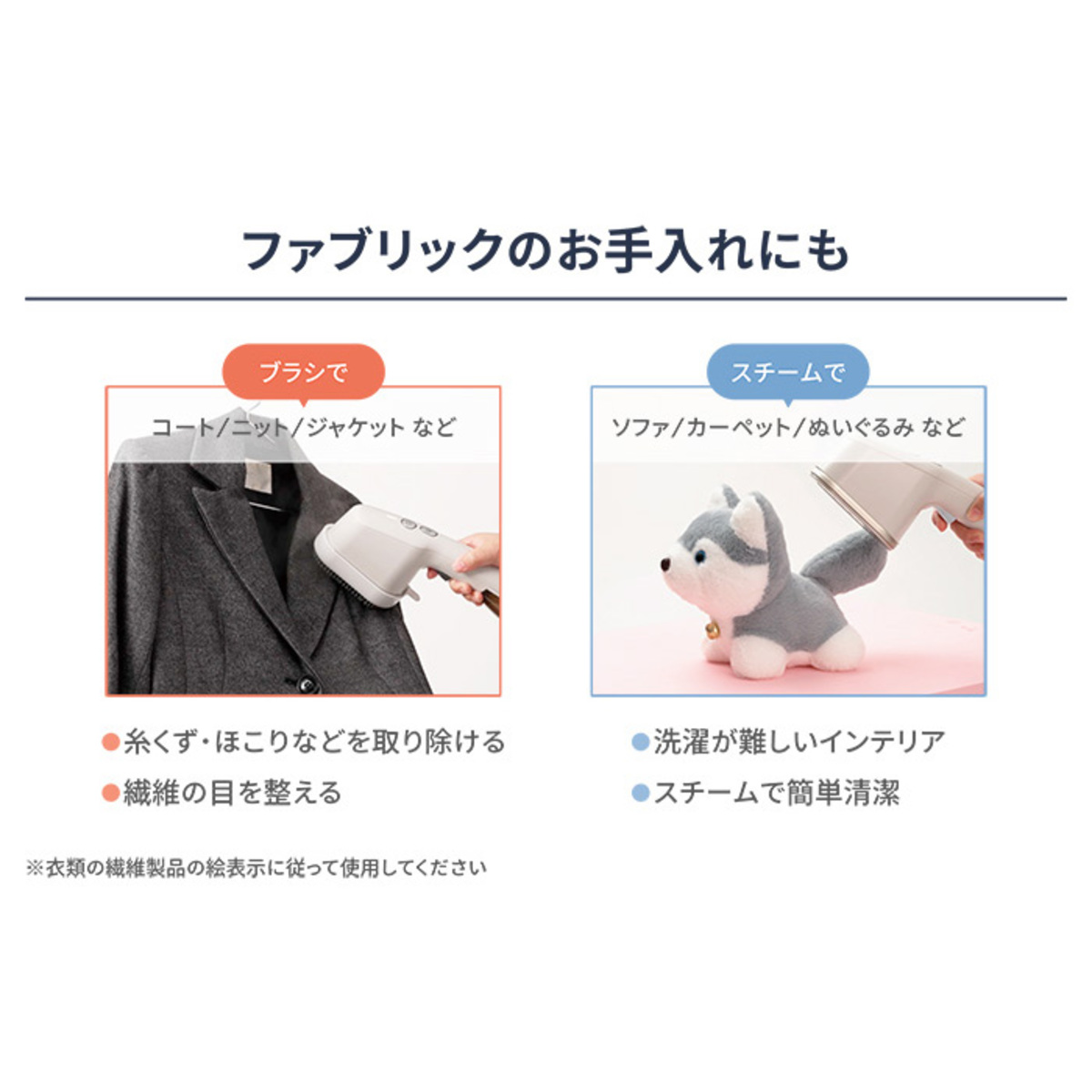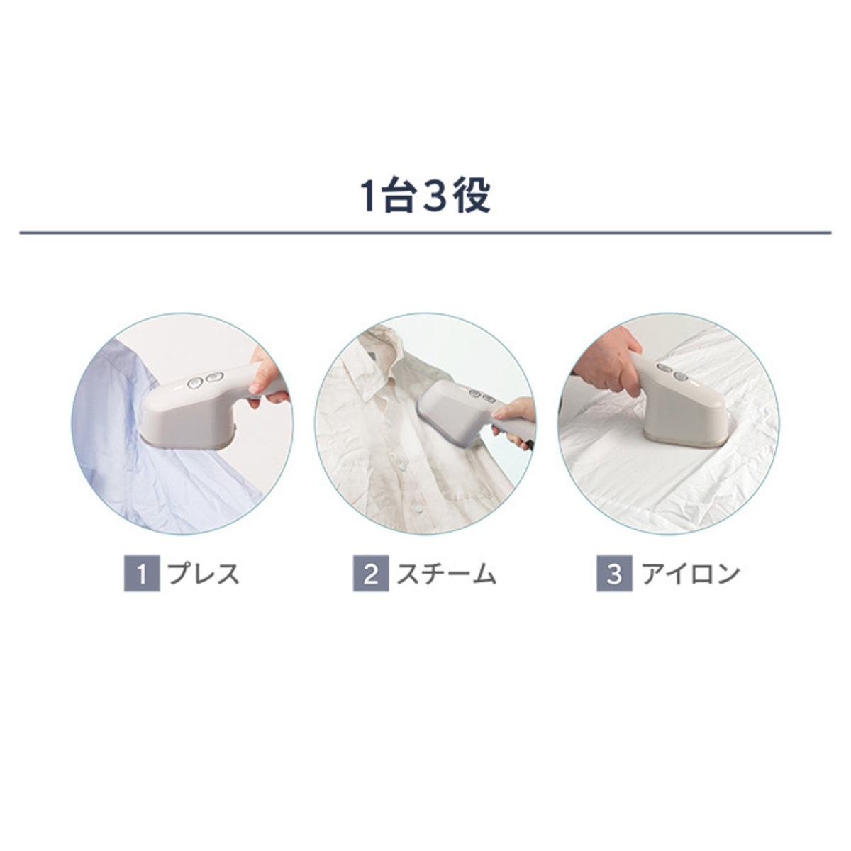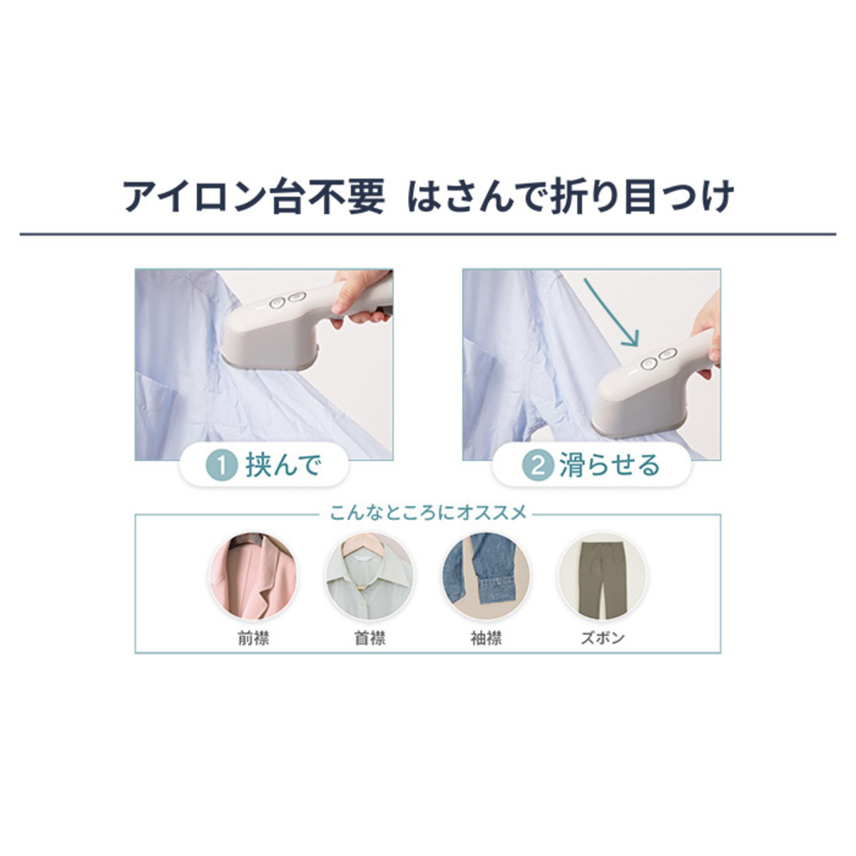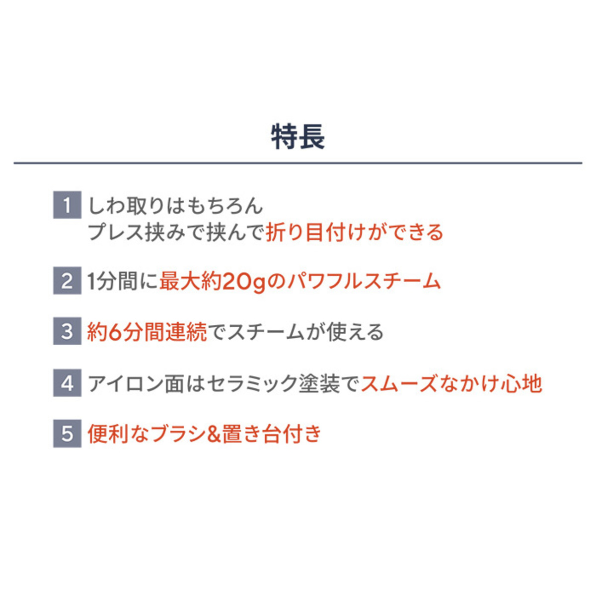 [商品内容] ・本体 ・アイロンスタンド ・アタッチメント毛ブラシ [サイズ] 約幅35×奥行6.5×高さ12cm [重量] 約850g [タンク容量] 120ml [コード長さ] 約2.5m [消費電力] 1200W [使用方法] ・水タンクに水を入れる、水タンクを本体にセットする、本体をアイロンスタンドにセットする ・電源プラグをコンセントに差し込む、電源ボタンを押す ・アイロンを使う 電源ランプが点滅から点灯に変わってからお使い下さい ・スチームを使う 電源ランプが点灯してからスチームボタンを押してください。ランプが点滅中はスチームは出ません。もう一度ボタンを押すとスチーム運転を終了します。スチームは連続して約6分使用できます。本体は立てても横にしてもスチーム出来ます ・プレス挟みを使う プレス挟み開閉ボタンを押してください。衣類のプレスする部分を挟み、開閉ボタンを離します、そのまま本体を滑らすように動かしプレスをつけてください ・使用後は電源ボタンを押して電源を切りアイロンスタンドに戻す。電源ランプが消灯してから電源プラグをコンセントから抜く。本体が十分に冷めてからお手入れをする ■取り扱い説明を充分にご確認の上、ご使用下さい 【中国製】 [注意事項] ※皮革製品には使用しないでください ※水タンクには水道水以外を入れないでください ※改造はしない ※修理技術者以外の人は、分解したり修理をしない ※電源コードや電源プラグを破損するようなことはしない ※電源コードや電源プラグが傷んだり、コンセントの差し込みが緩い時は使用しない ※ぬれた手で電源プラグを抜き差ししない ※交流100V以外では使用しない ※水につけたり水をかけたりして濡らさない。また浴室内で使用しない ※本体にピンや針金などの金属物や異物を入れない ※補助を必要とする人や、子どもだけで使わせない ※誤操作による危害を認識し安全に操作できない人や子どもだけでは使わせない。必ず大人(安全に責任を負う人)の監督のもと使用する ※幼児の手の届く所で使わない。また、子どもが遊ばないように注意する ※湿った衣類にスチームをあてない ※本体にスタンドを置いた状態でスチームをしない ※電源プラグは根元まで確実に差し込む ※電源プラグをコンセントに差し込んでいる間はその場を離れない ※定格15A以上のコンセントを単独で使う ※アタッチメント毛ブラシはアイロン面が熱い状態で取りつけたり、取り外したりしない。必ず電源を入れる前か、電源を切ってアイロン面が充分に冷めてから行う ※使用後は本体の電源を切り、電源ランプが消灯してから電源プラグをコンセントから抜く ※電源プラグのほこりを定期的にとる ※異常時は電源プラグをコンセントから抜き使用を停止する ※お手入れの際は、電源プラグをコンセントから抜き充分に冷めてから行う ※梱包用ポリ袋は幼児の手の届かない所に保管する ※使用中や使用直後は高温部に触れない ※スチームに触れない、人体や生き物にスチームを向けて使用しない ※着用したままの衣類にスチームをかけない ※ファスナーや金属製のボタンなどの上にはアイロンをかけない ※市販のアタッチメントやアイロン面カバーを使わない ※対応温度の低い衣類には使用しない ※熱やスチームに弱い壁や家具などの近くでは使用しない ※収納時に電源コードを本体に巻き付けない。落としたり衝撃をあたえない ※使用中や電源プラグを抜いてしばらくは、アイロン面が非常に熱くなっています。持ち手部分以外には触れないでください。使用中はアイロン面をアイロン台などにそのまま置かず、必ず専用のアイロンスタンドの上に置いて下さい。 ※衣類の繊維製品の絵表示に従って下さい。高級品や特殊加工品、熱に弱い布地、色の濃い布地は衣類を傷める場合があります。目立たない所に試し掛けをする、あて布をする、またはご使用をお控えください ※コートや毛足の長い衣類は、アイロン面を離してスチームをかけてください ※皮革製品には使用しないでください ※あて布表示がある衣類は、必ずアイロン面を離し、あて布をしてご使用してください ※スチーム禁止の表示がある衣類には、スチームは使用出来ません ※アイロン台によってはスチームや湯滴が透過することがありますのでご注意ください