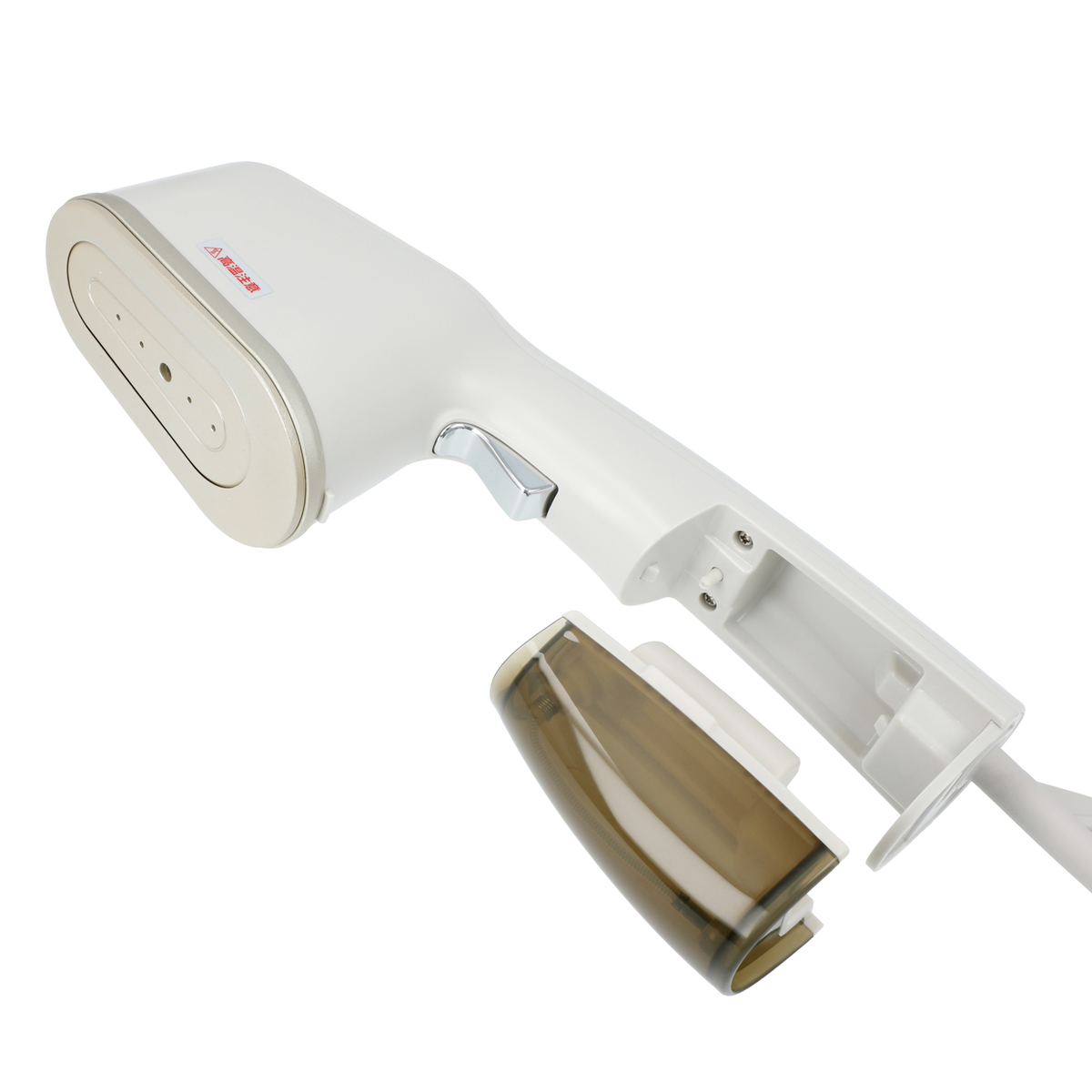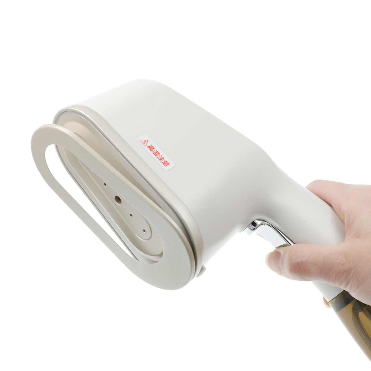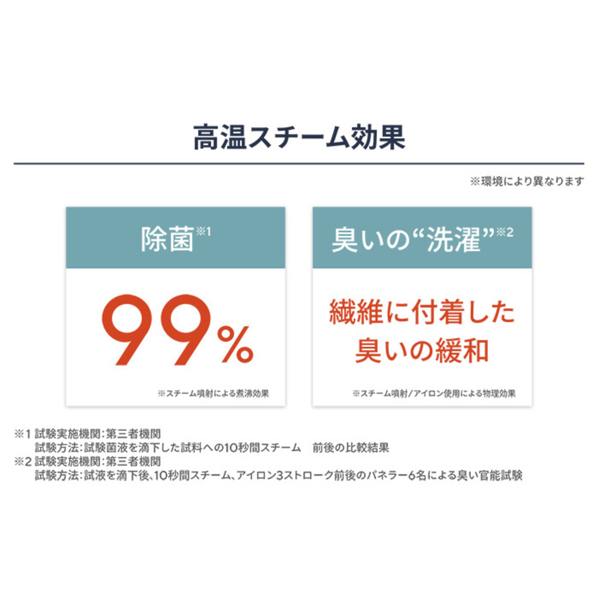 ハンガーにかけたままプレス仕上げができるハンディスチーマー。アイロン面はセラミック塗装で滑りが良い仕様です。また、99%除菌効果の除菌試験結果です*
