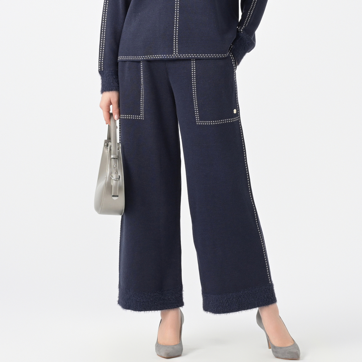ニット素材で仕立てたセミワイドパンツ。脇線・前身頃のポケット、後ろのフェイクポケットに配色のステッチに見えるジャカード柄をあしらいアクセントになっています