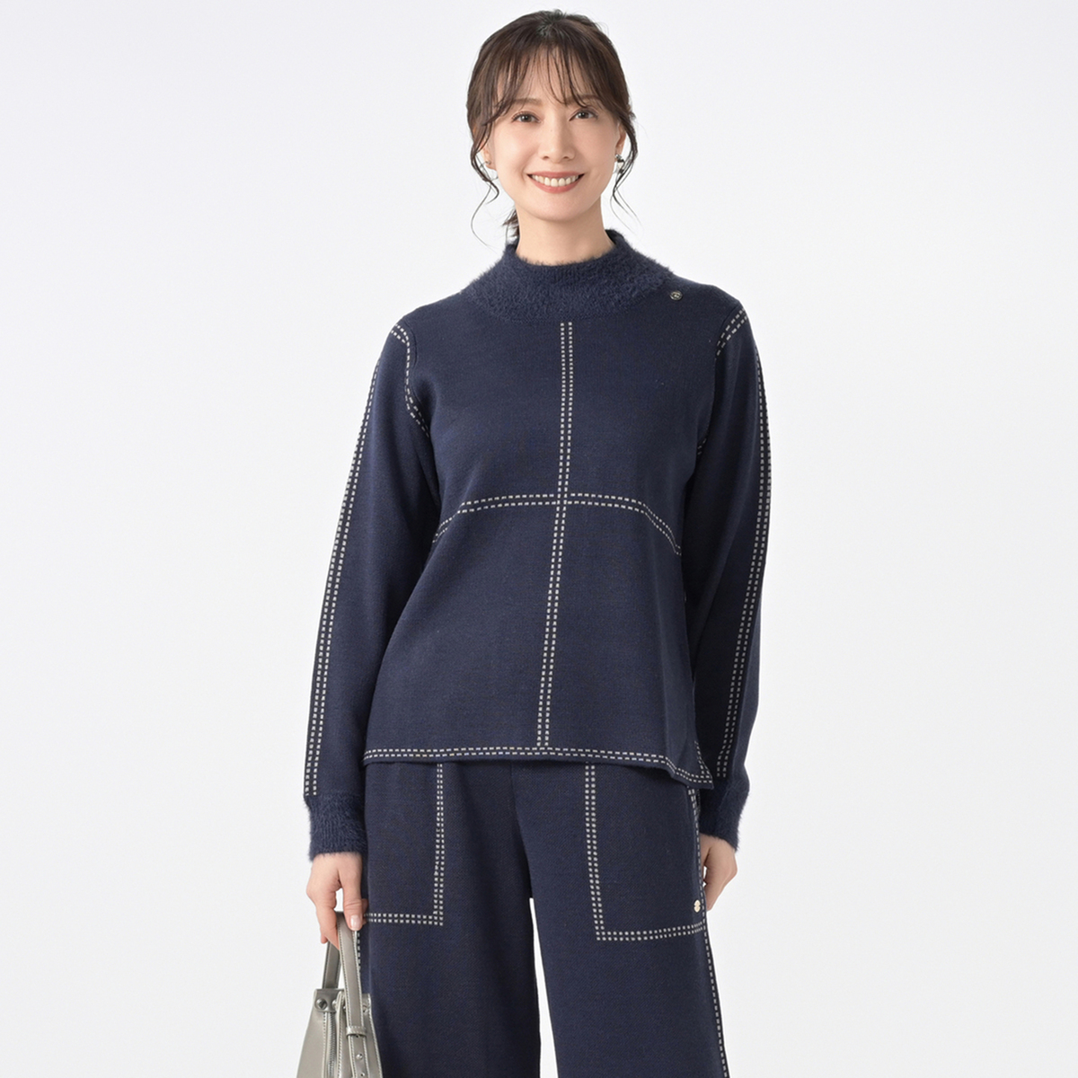 アームホール・裾・袖山・前後身頃に配色のステッチに見えるジャカード柄をあしらったニットプルオーバー。こだわりのテクニックでブランドらしさを表現しました
