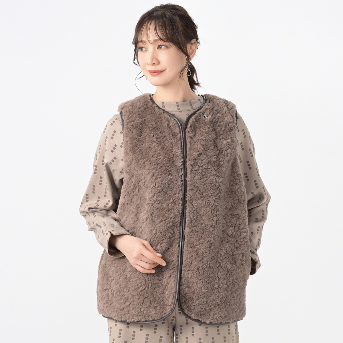 全体はストンと落ちるようなIラインシルエット。着膨れしないよう、肩幅はコンパクトに身頃もすっきりとしたシルエットに。合皮パイピングデザインでエッジが効いたモードな印象で、左衿元にはブランドオリジナルロゴ入りのプレートが付いています。袖がないので動きやすく、車の運転時などに着用するアウターとしてもおすすめ。さっと羽織るだけでコーデをワンランクアップしてくれます