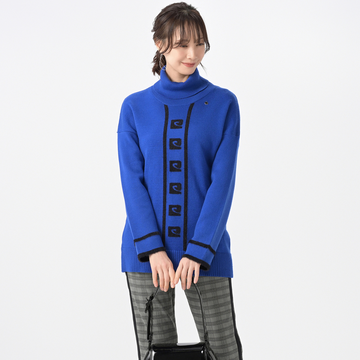 フロントに縦にあしらったロゴデザインが目を惹くタートルニット。こなれ感のあるボックスシルエットで動きやすく、身体のラインもカバーします