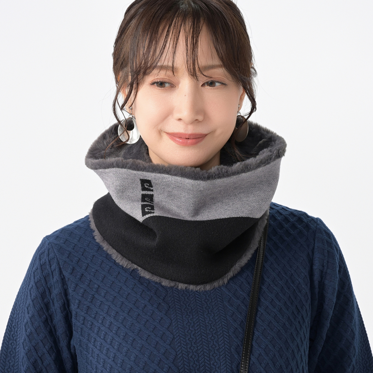表はジャガードニット、裏はふんわりとしたフェイクファー素材を使用。ブランドらしいロゴのジャガード編みと配色デザインでモードな印象に。被るだけで首元をすっぽり包み込み、寒さからしっかりガード。首元に程よいボリューム感もプラスでき、コーディネートのアクセントになります