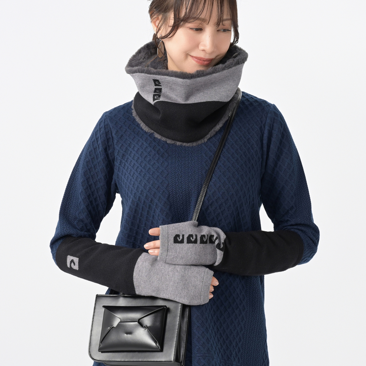 程よい厚みと肌触りの良いジャガード編みがキレイ見えするハンドウォーマー。ブランドらしいロゴのジャガード編みと配色デザインでモードな印象に。優しく手元を包み込んでくれて、暖かみがあります
