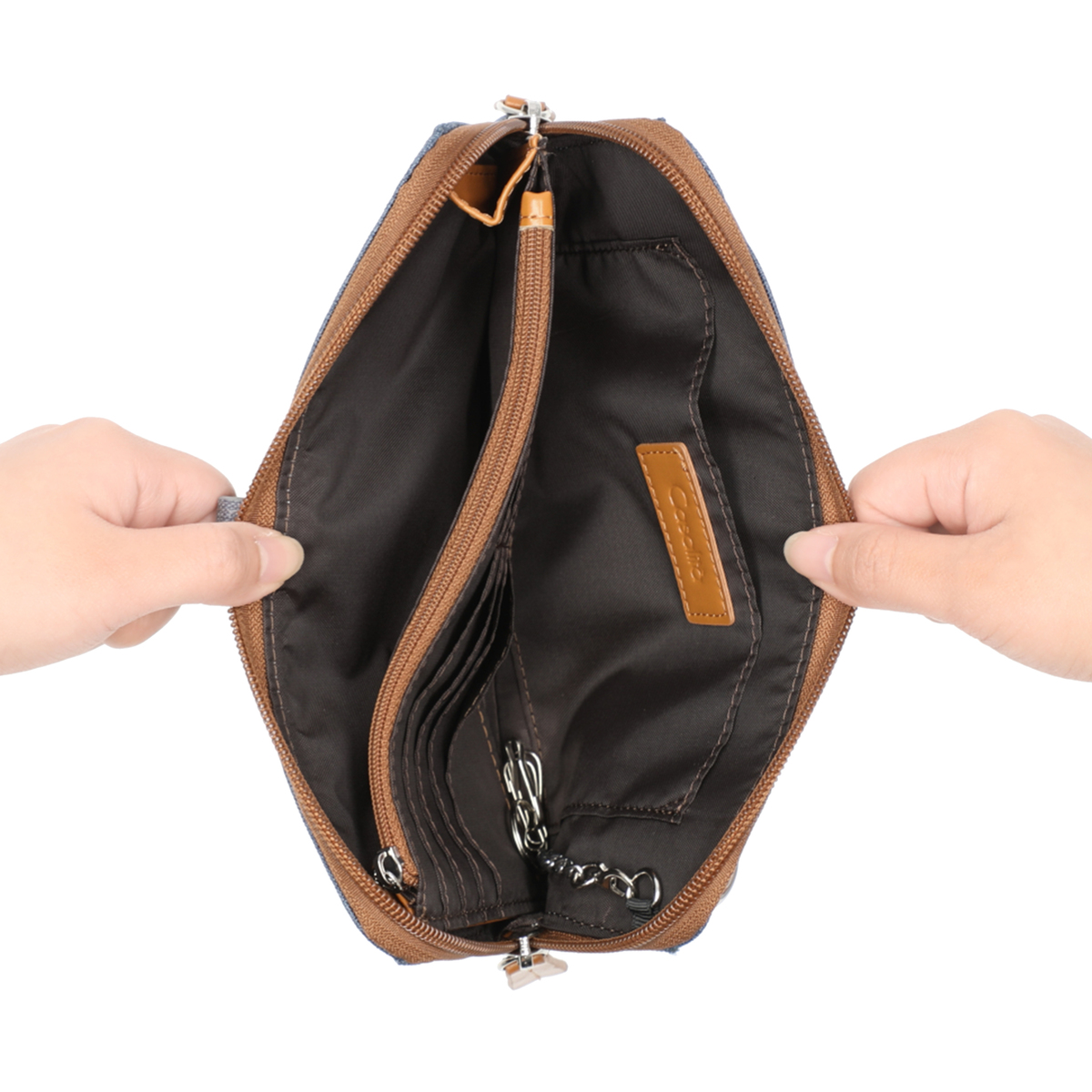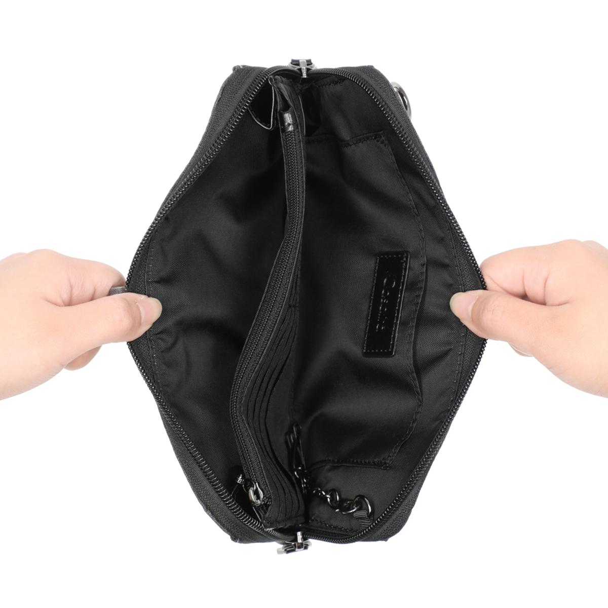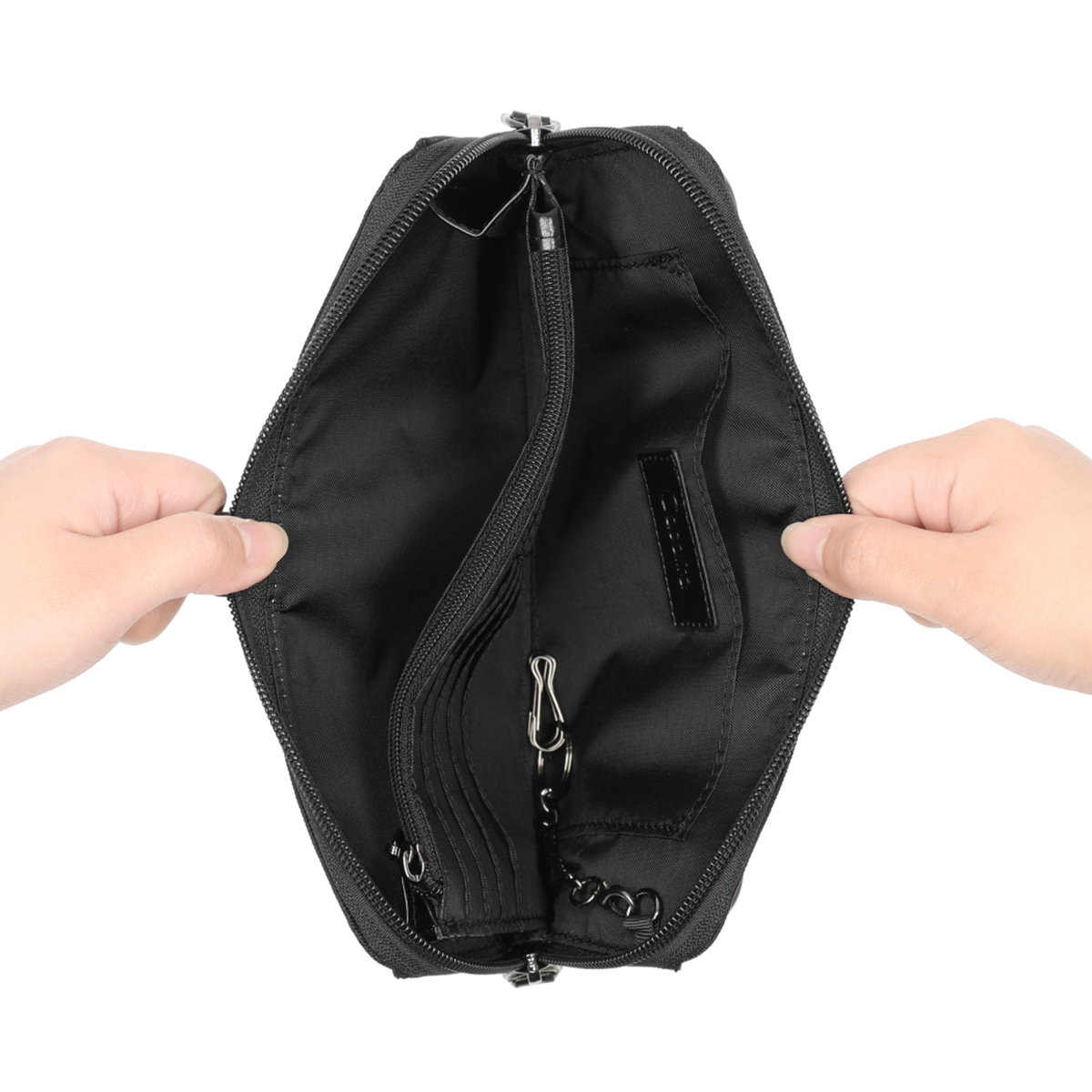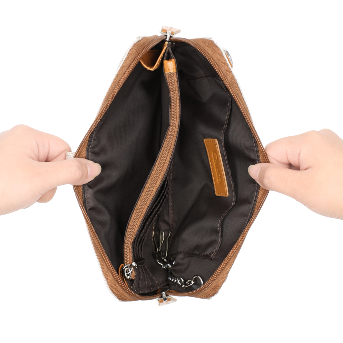 ポーチの中には取り外しができる3連フック付きキーリングが付属。鍵の紛失トラブル対策にも役立ちます。取り外しができるショルダーベルトは長さの調節も可能で、お好みに合わせて斜め掛けや肩掛けも可能です