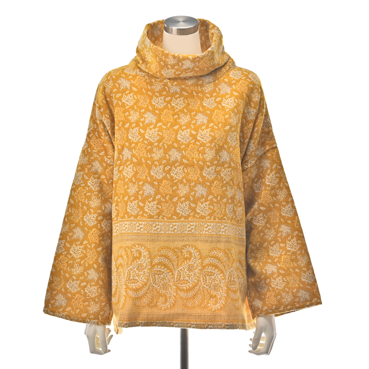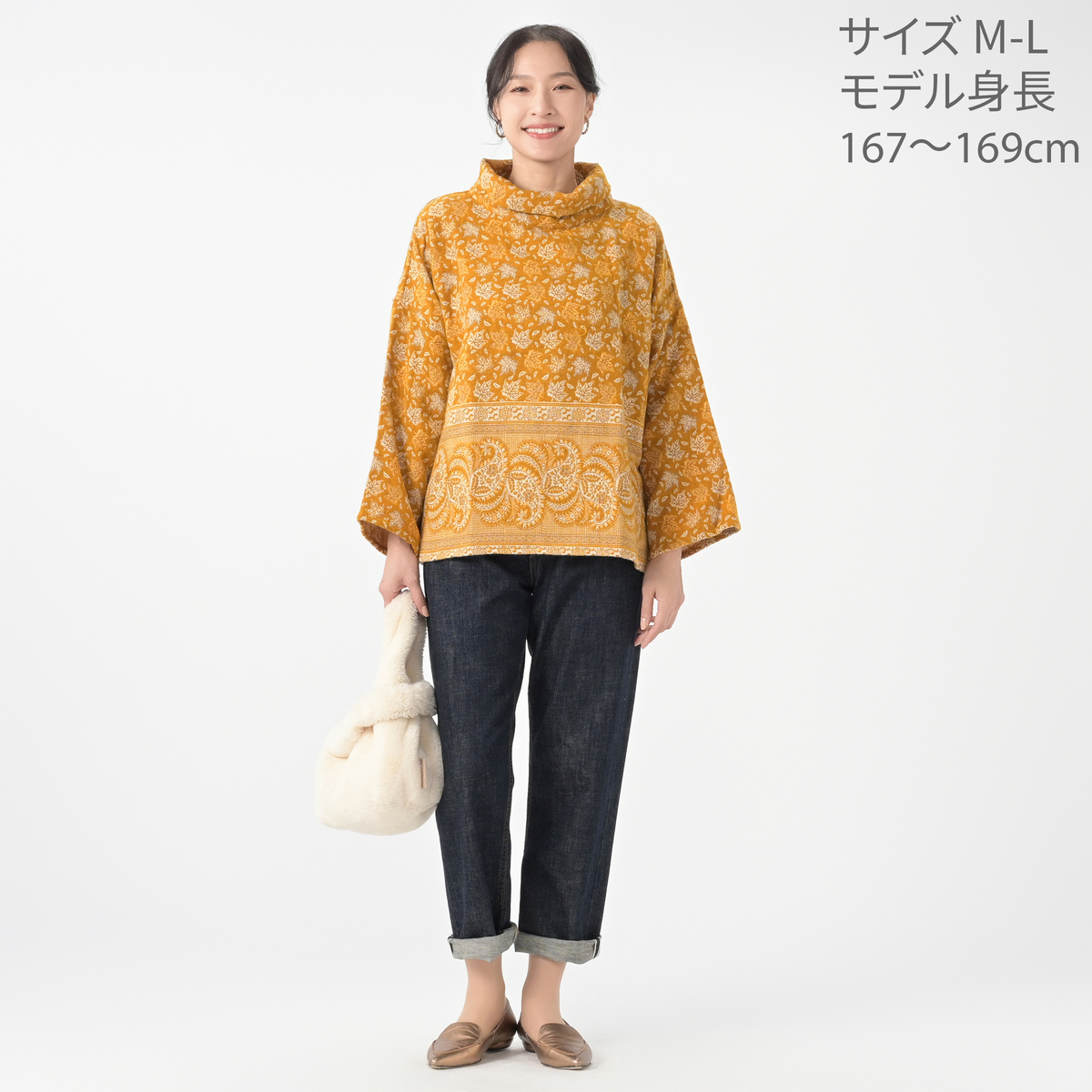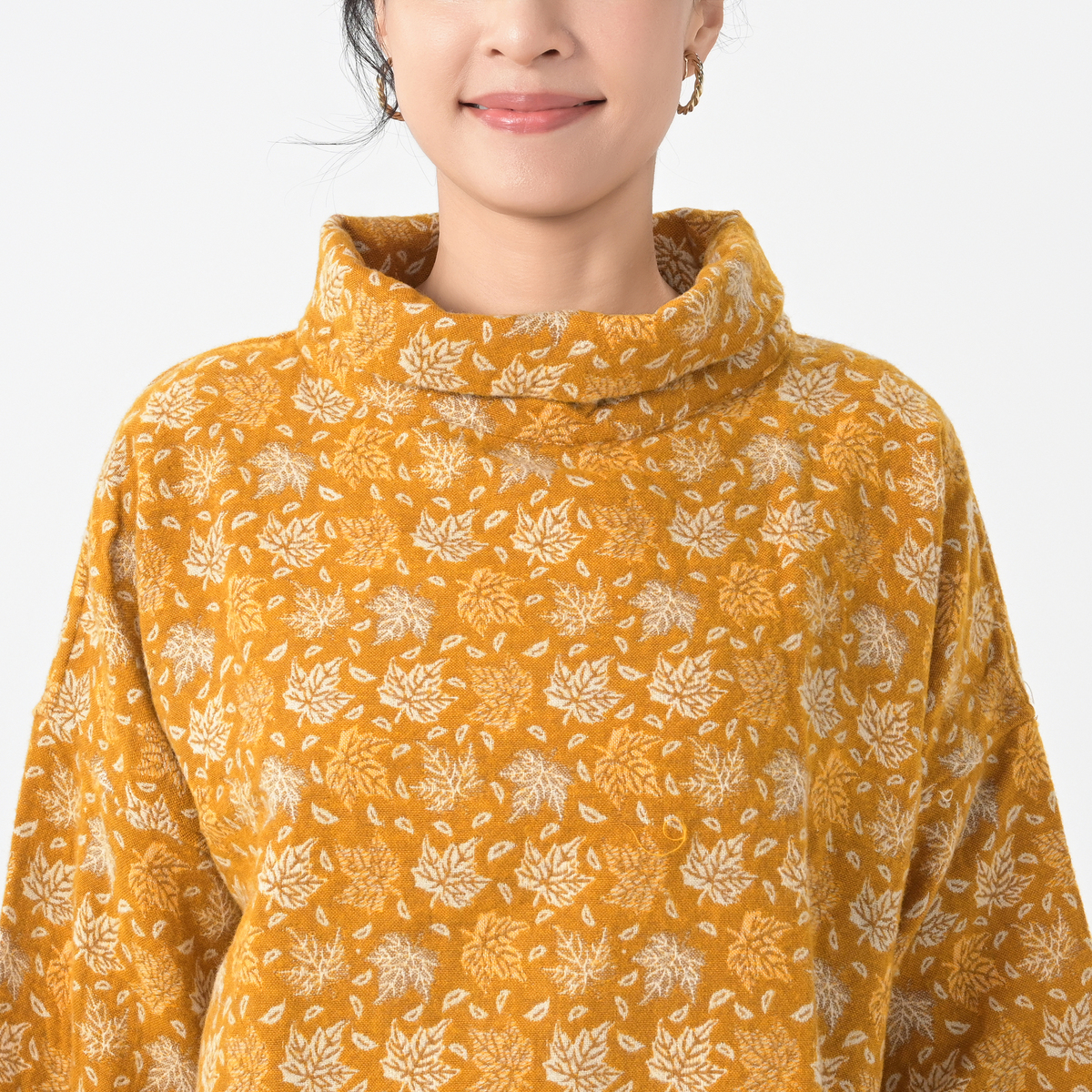 肌触りのよいあたたか素材。1枚着るだけで主役になるチュニック。首元までたっぷり生地で暖かく。折り曲げたりすることで、アレンジもできます