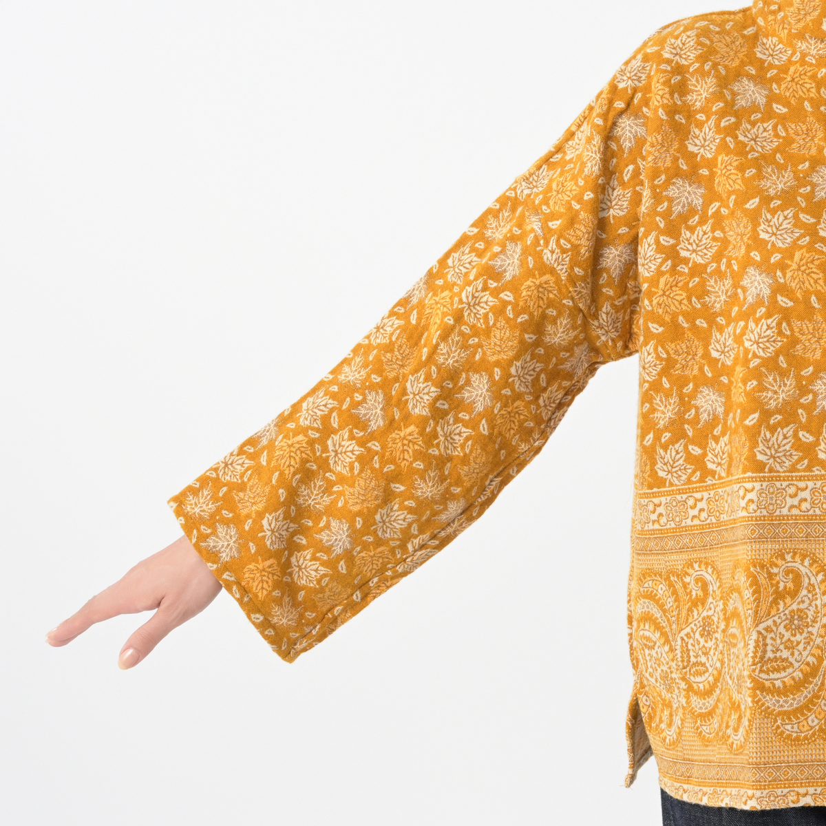 生地が硬くて着心地はあまり良くないです。 これで暖かく着られるかな?と思うと少し疑問に思います。 あと、着こなしによってはおばさんっぽくなりそうで、私には難しいかな? こういう柄は好きですが、部屋着にしては高いしね。