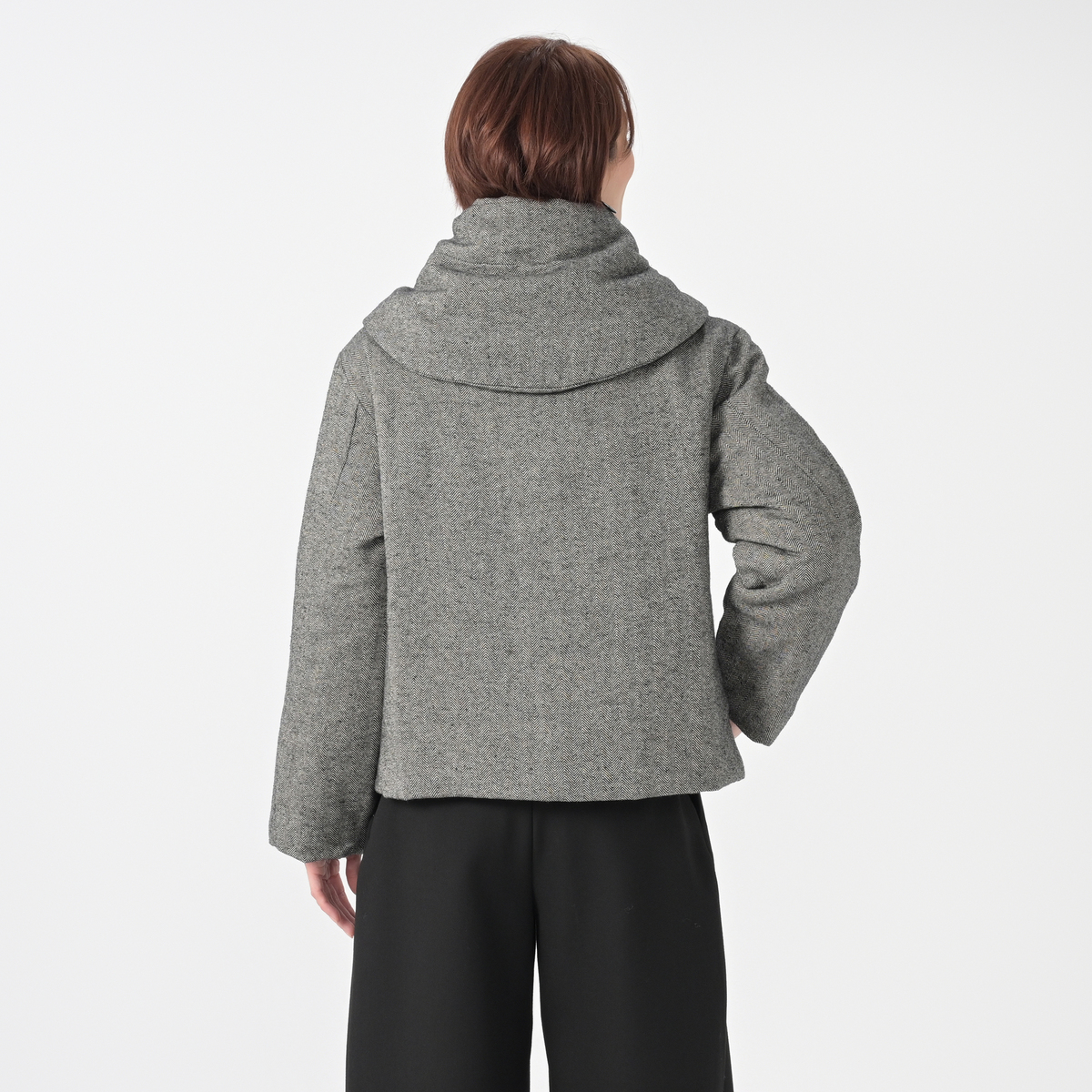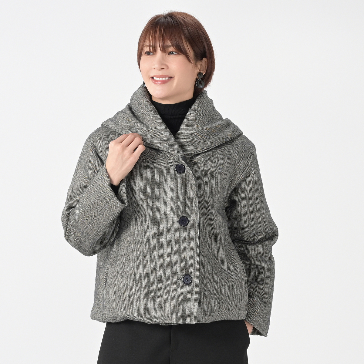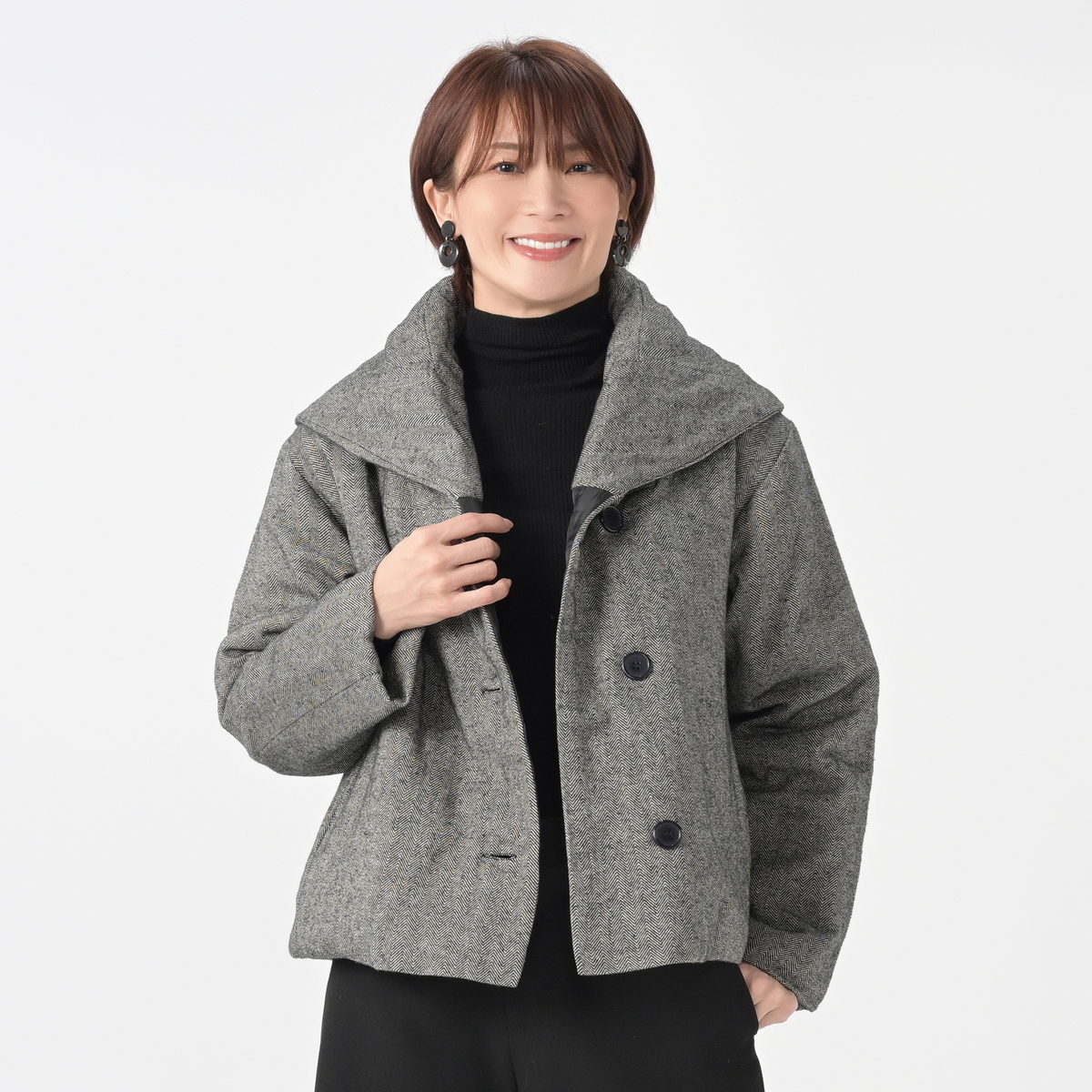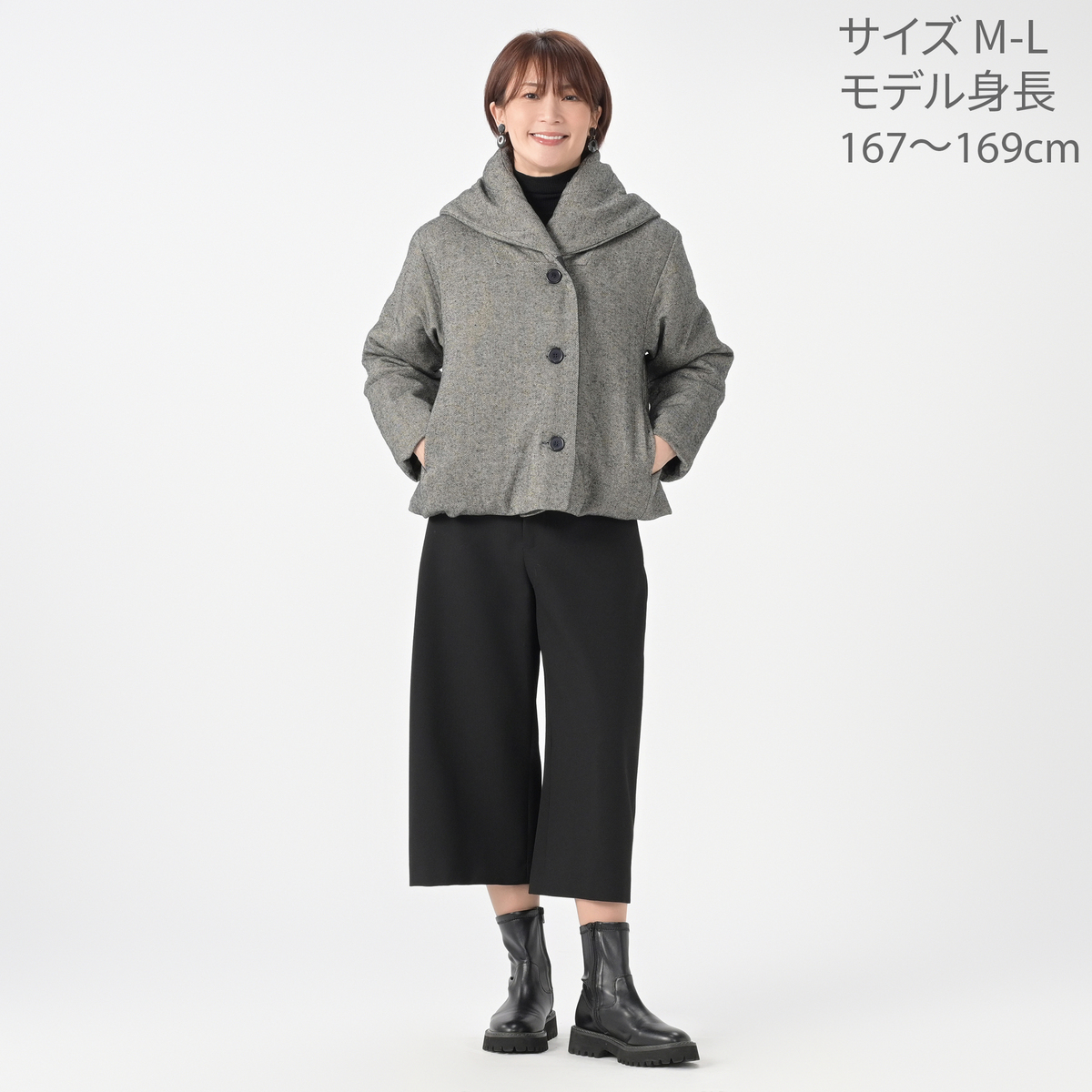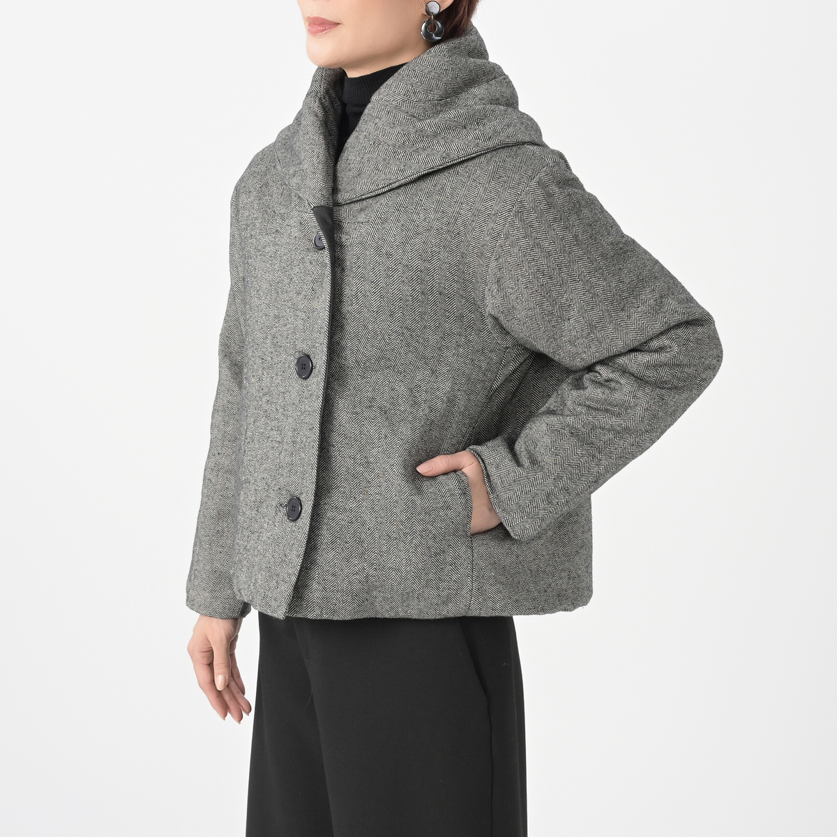 ワイドパンツやフレアースカートなどと相性が良いデザインのハーフコート。薄く中わたが入ったかさばり過ぎない厚みで、暖かく着こなしていただけます