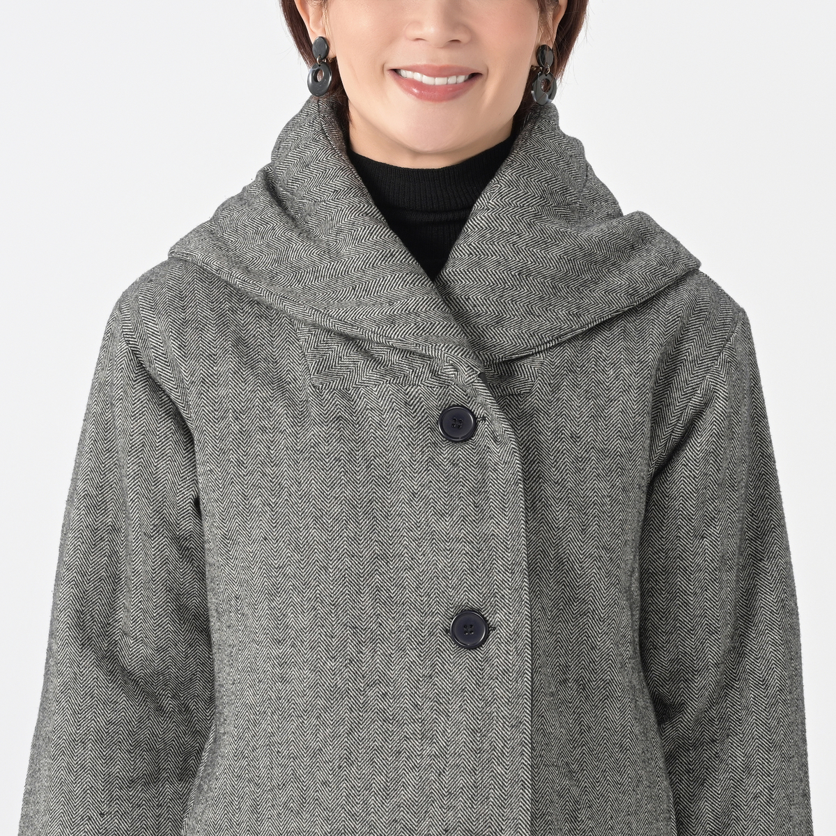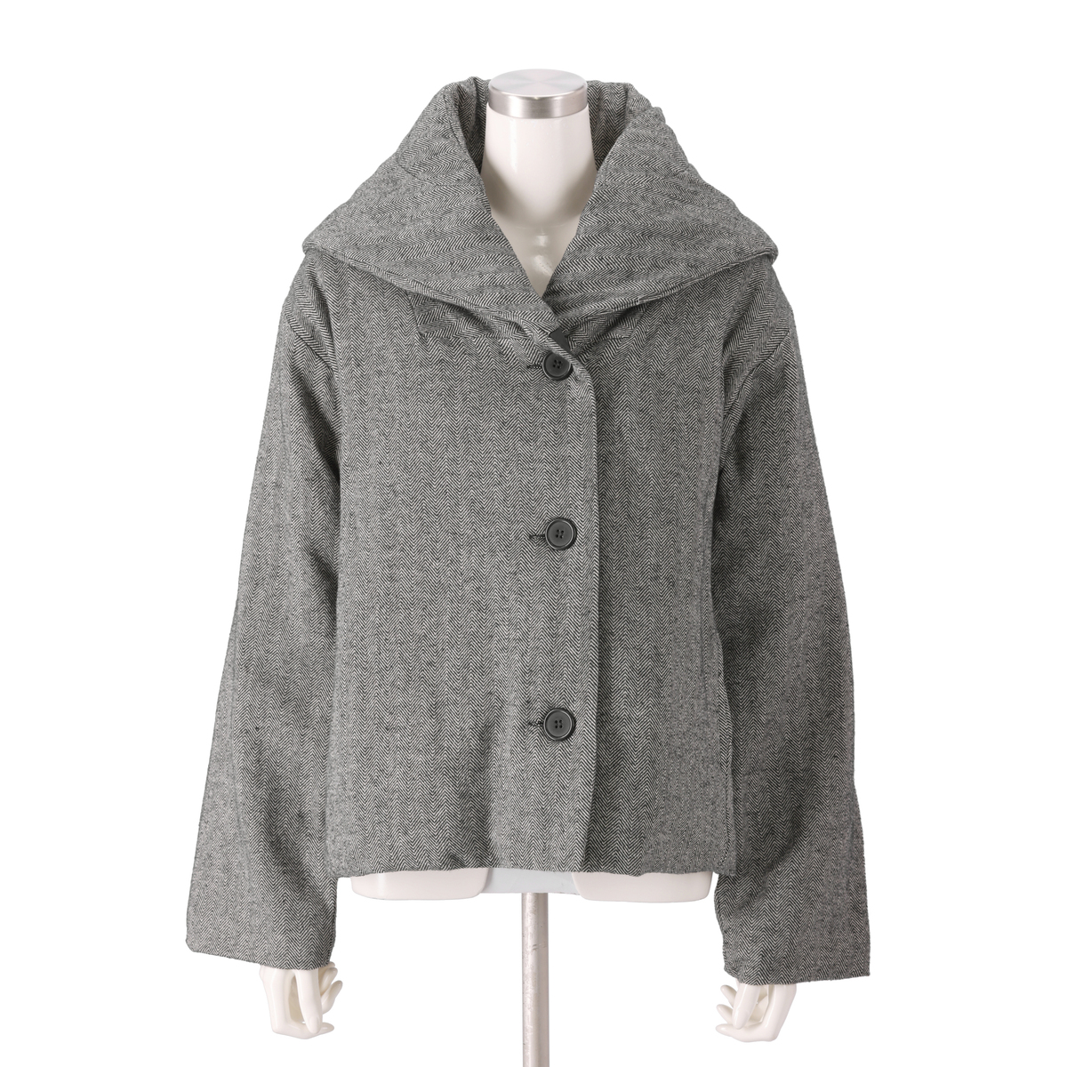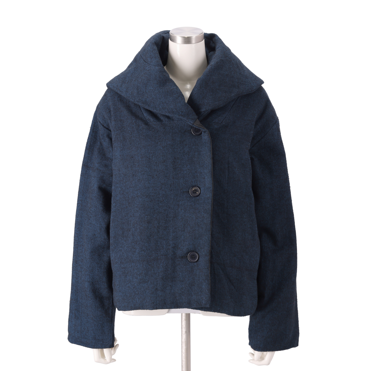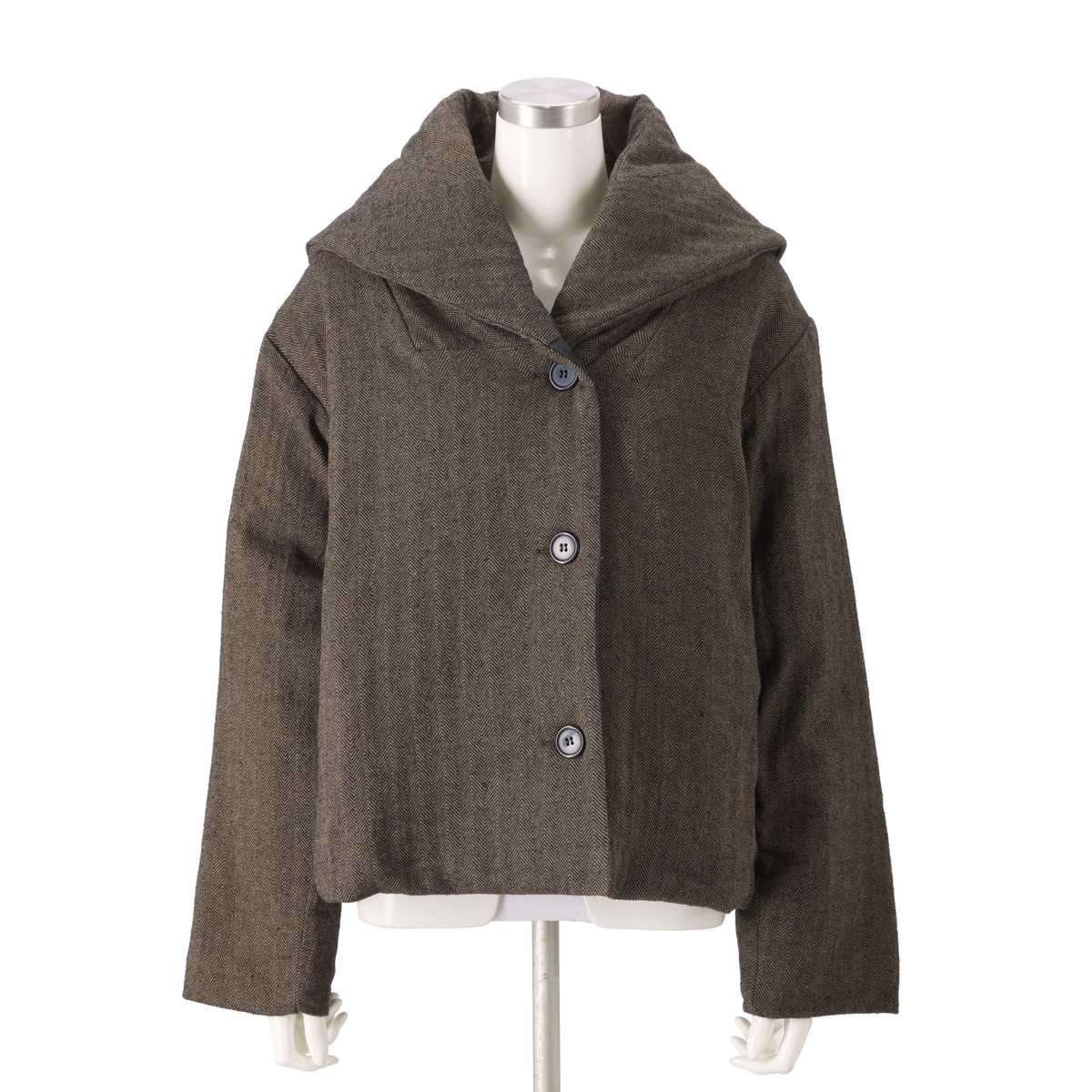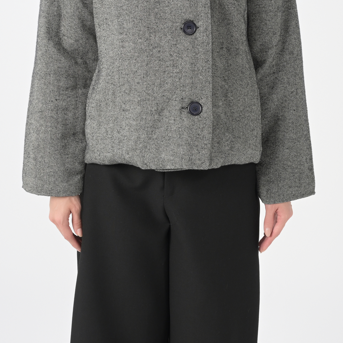 ワイドパンツやフレアースカートなどと相性が良いデザインのハーフコート。薄く中わたが入ったかさばり過ぎない厚みで、暖かく着こなしていただけます