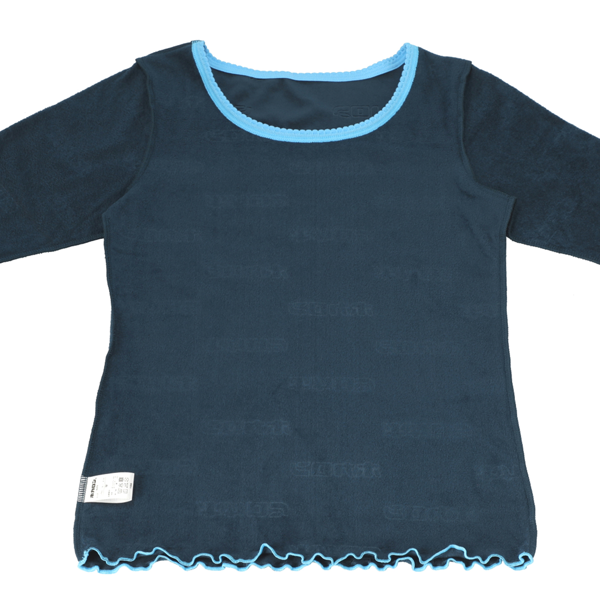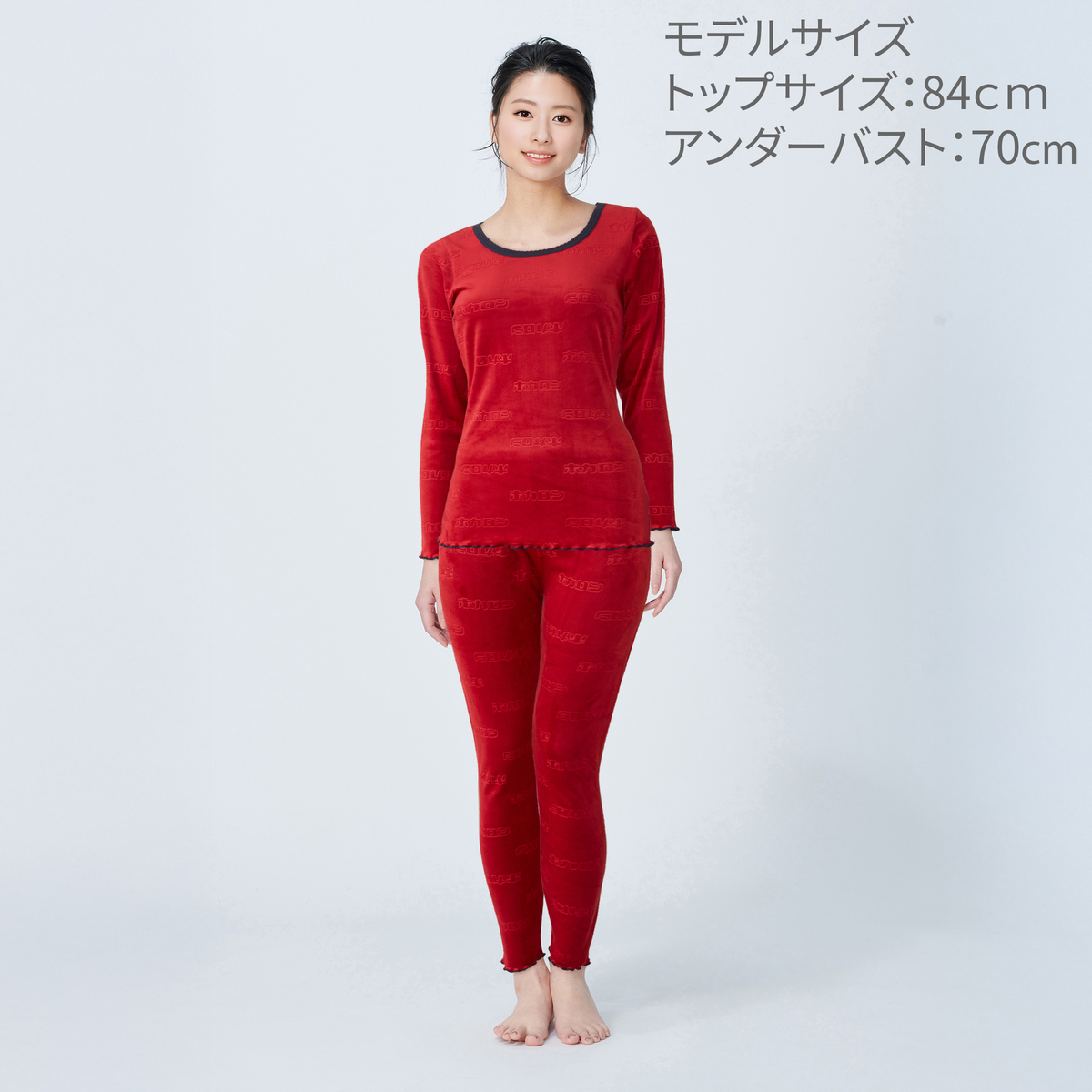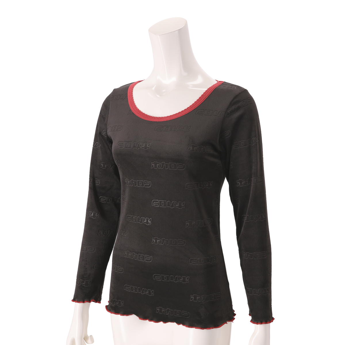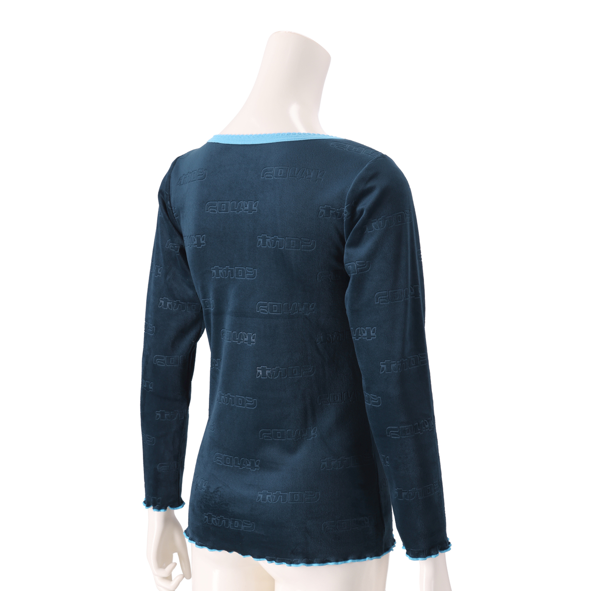 身生地にはエンボス加工で『ホカロン』のロゴを入れ、袖口と裾は配色メロー始末にした可愛らしいデザイン。寝るときも着用でき、ベロア調の厚手生地の為、1枚でも着られます