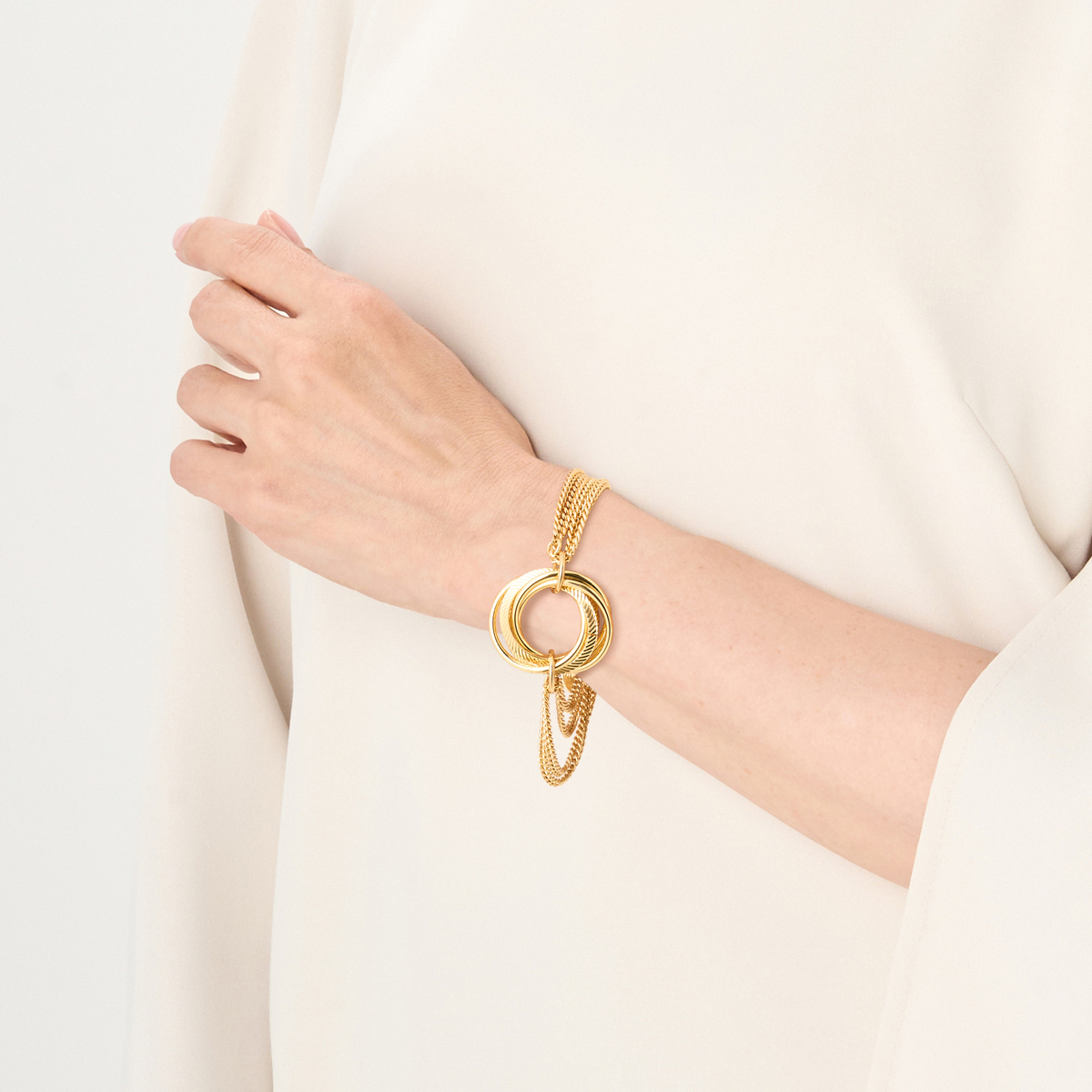 複数のサークルを組合せた印象的なモチーフのブレスレット。イタリア皮革の編み込み技法をオマージュしたデザインです。存在感のあるゴールドカラーとイタリアらしいデザインで、華やかにお手元を飾ります