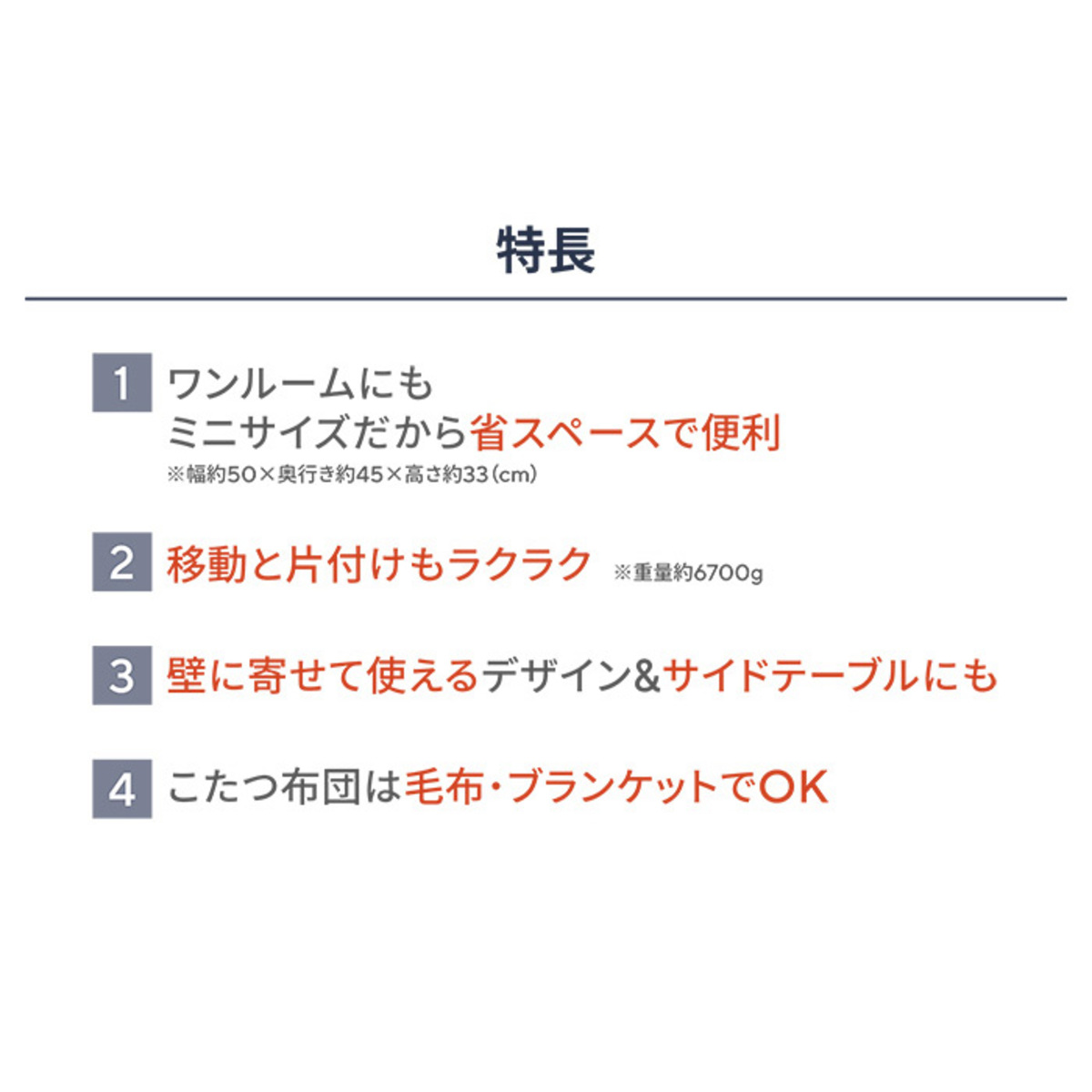 [商品内容] ・本体 ・電源コード ・天板固定ネジ2本 [サイズ(約)] 幅50×奥行45×高さ33cm [重量]6700g [コード長さ]約3m [消費電力]200W [材質] 甲板の表面材:中質繊維板 表面加工:UV塗装 [注意事項] ※ビニールクロスなどをテーブルに密着させて使用しない ※テーブルに熱いものを直接置かない ※天板が濡れたまま長時間放置しない ※コタツに強い振動や衝撃を与えない ※他の暖房器具と併用しない ※携帯型機器をコタツにいれない ※使用中にヒーターを見つめない ※天板とふとんが無い状態で使用しない ※コタツを引きずりながら移動しない ※お手入れにシンナーやベンジン、漂白剤やアルコールなどを使わない ※他の暖房器具から熱を取り入れるダクトを使用する場合には注意すること ※テーブルを傾きの有る場所に置かない ※テーブルをざらついたものでこすらない ※コタツを熱に弱い床材や敷物の上で使用する場合は断熱をする ※ふとんの材質に注意する ※電源コードが子供の足に引っかからないように行動範囲には注意してください ※天板が動かなくなるまで天板固定ネジを締め付けて下さい。完全に固定されていないと天板がずれるなどしてけがをする恐れがあります ※ヒーターの取付部やコタツの脚部に緩みやガタツキがないか定期的に点検してください ※コード釣り金具をヒートンにかけてご使用ください ※コタツへ出入りする際にコードを脚でひっかけケガや故障の原因となる恐れがあります ※ヒーターやコタツ脚に緩みやガタツキを感じたら脚を手で回し締め直してください ■取り扱い説明を充分にご確認の上、ご使用下さい 【ベトナム製(ヒータユニット:マレーシア製)】