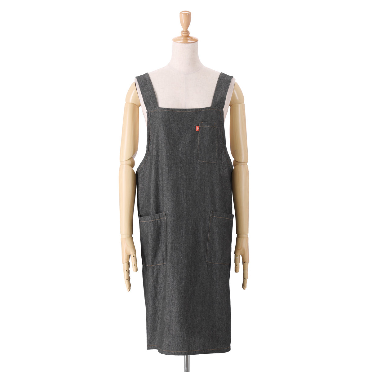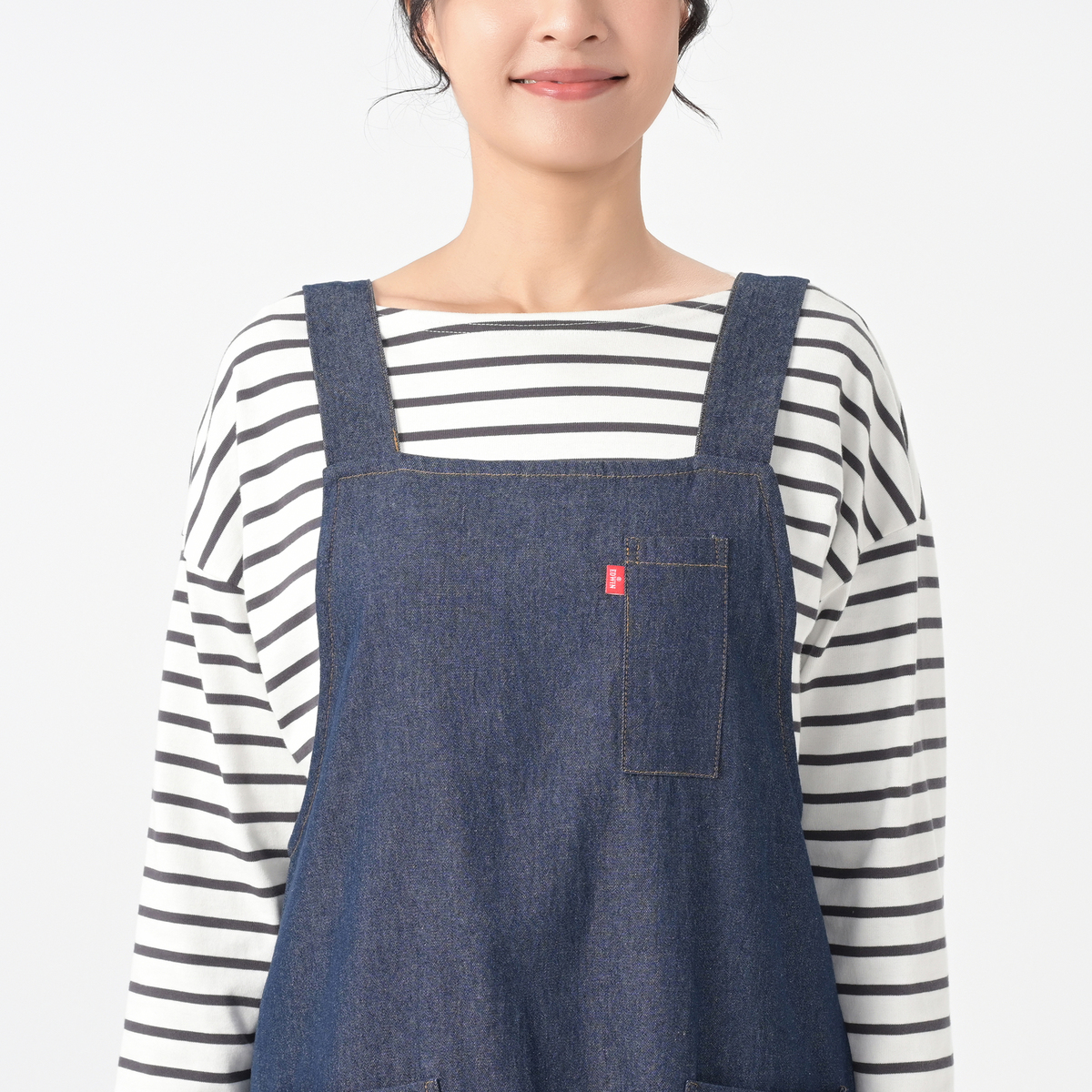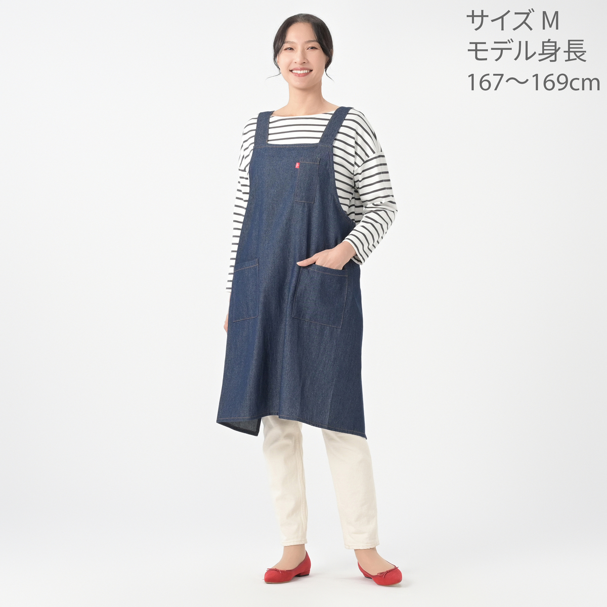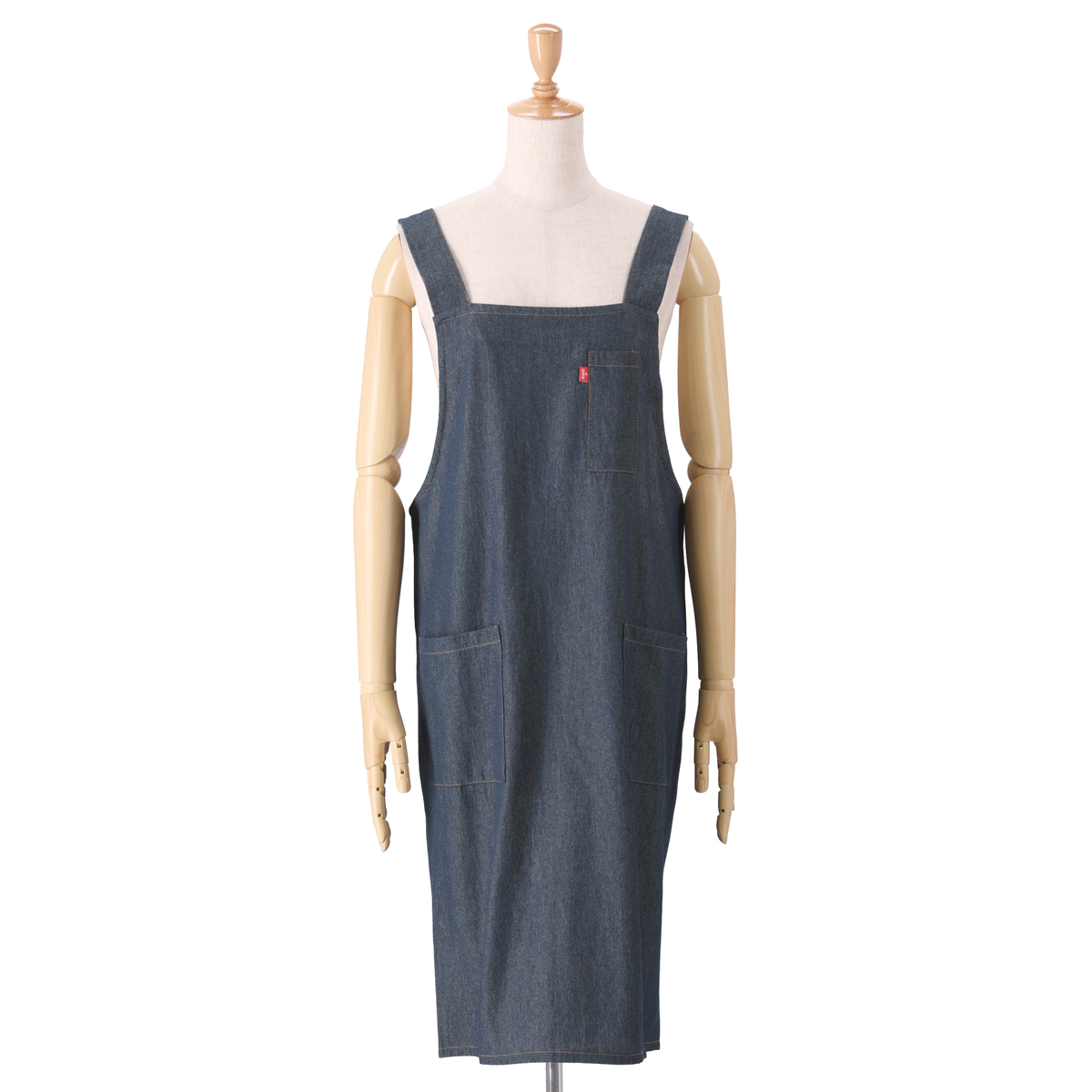 一年を通して使用できるデニム素材のエプロンです。身頃の左右に便利なポケットも付いています