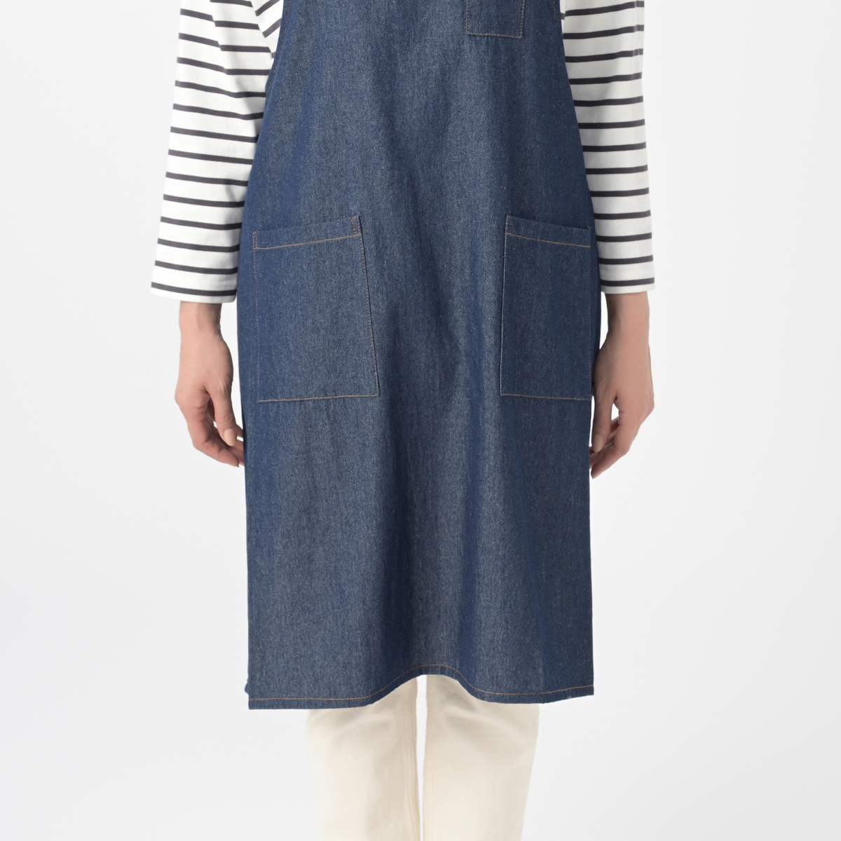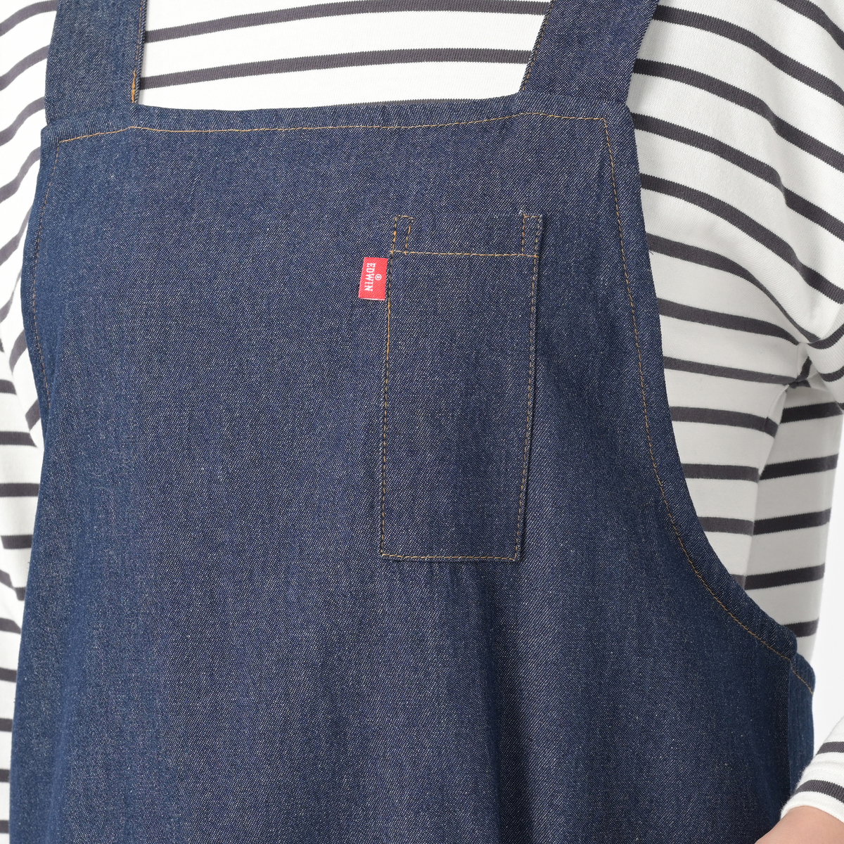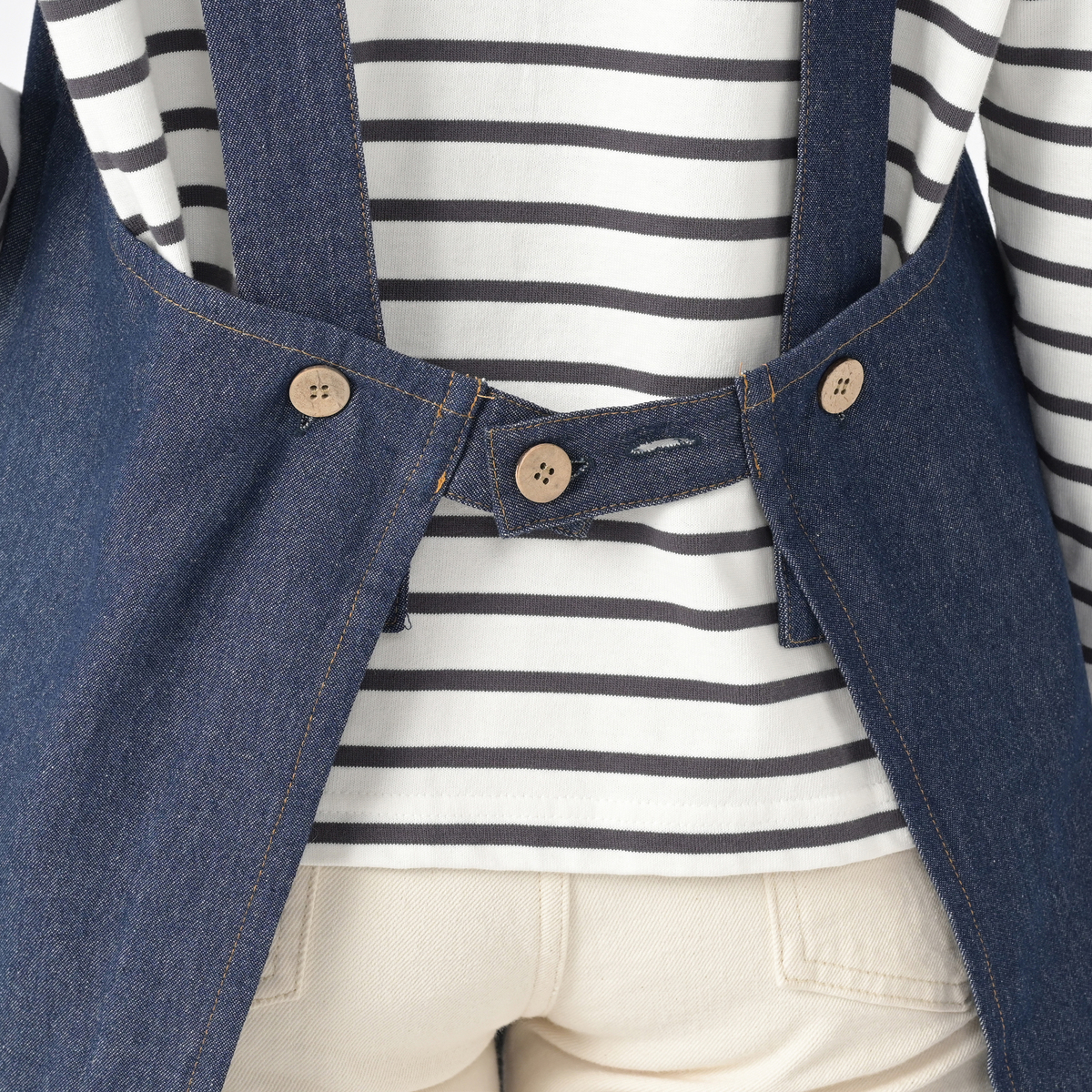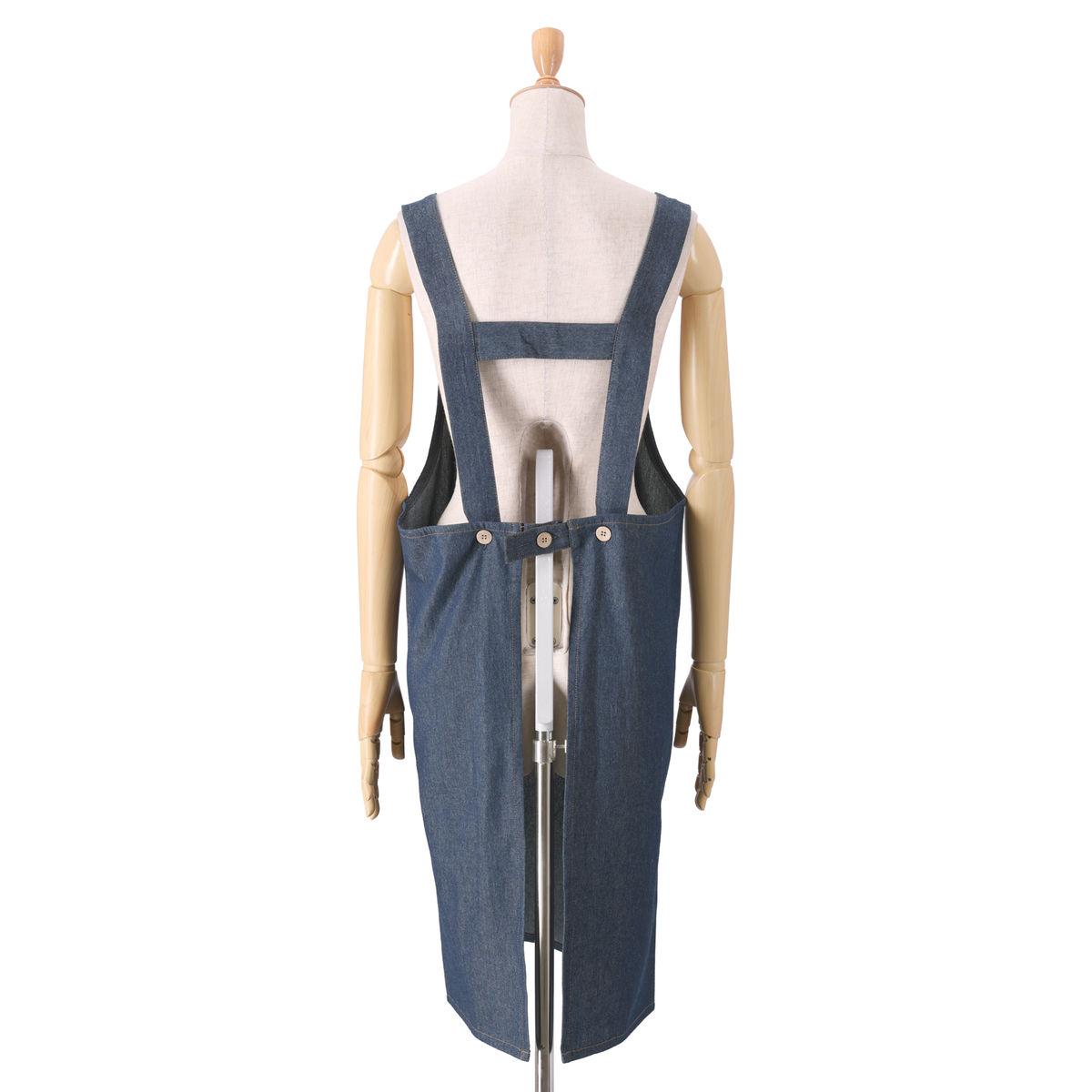 一年を通して使用できるデニム素材のエプロンです。身頃の左右に便利なポケットも付いています