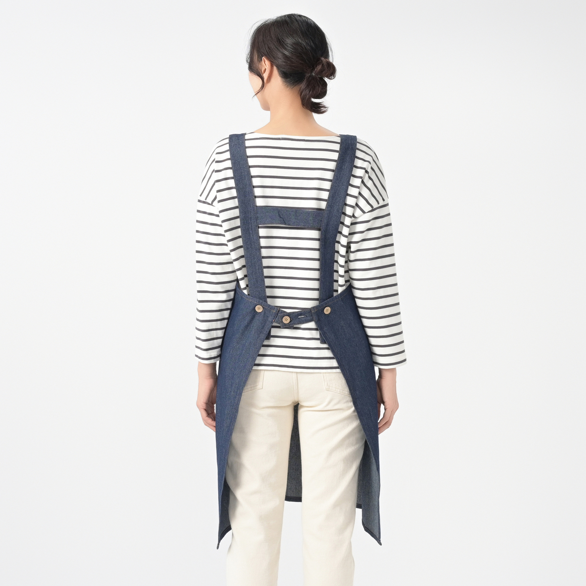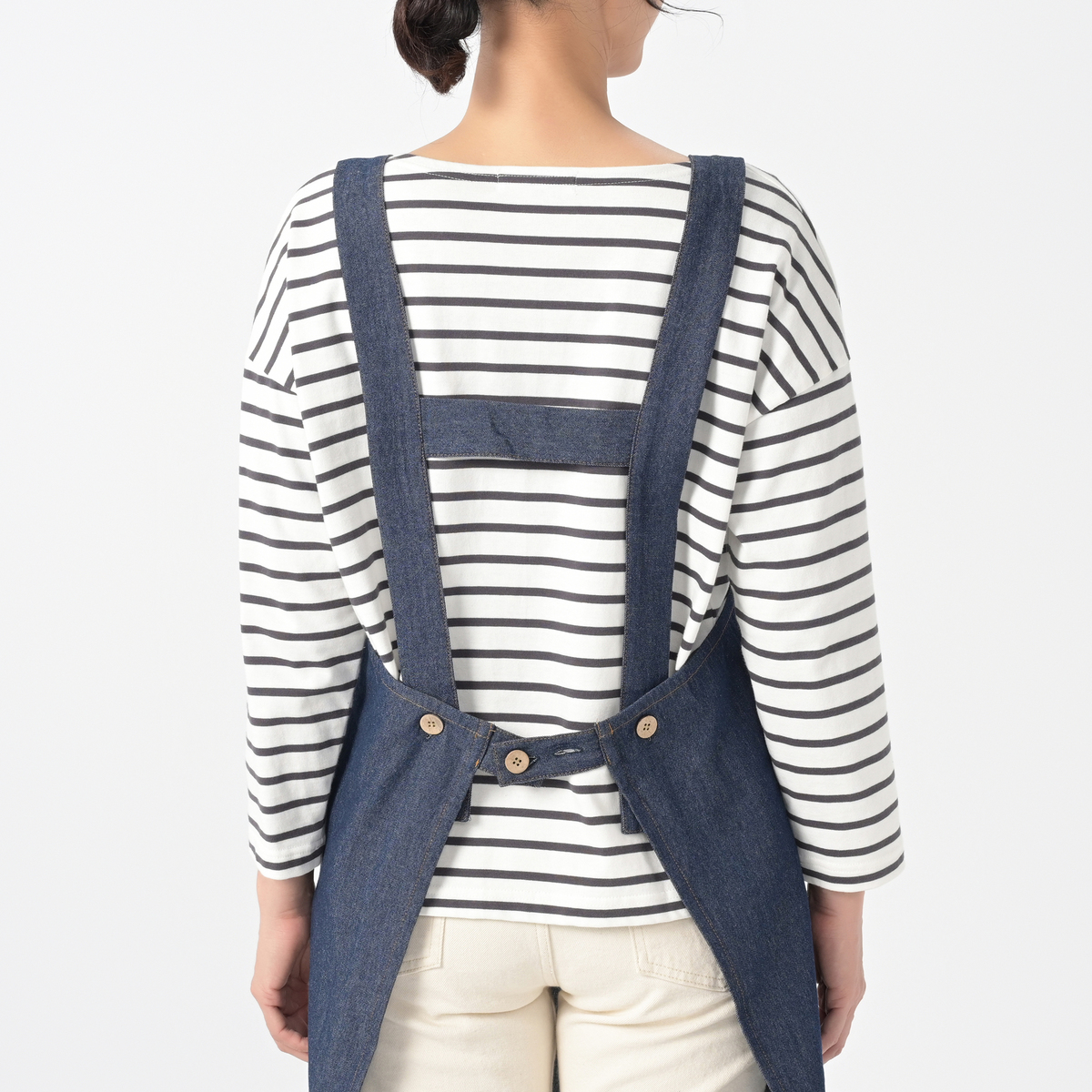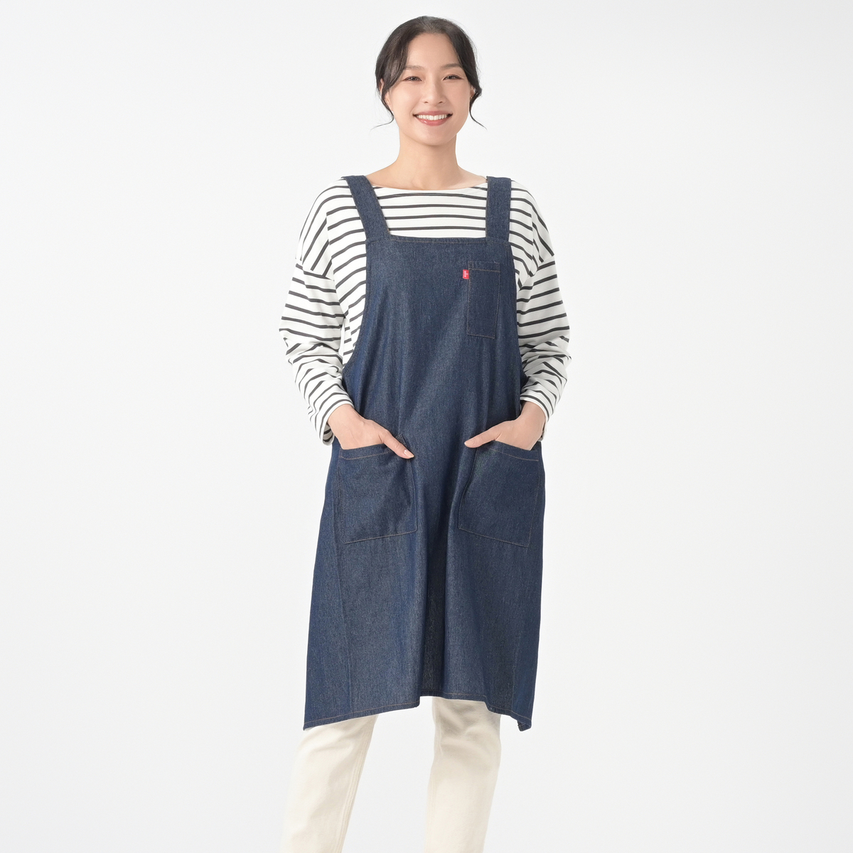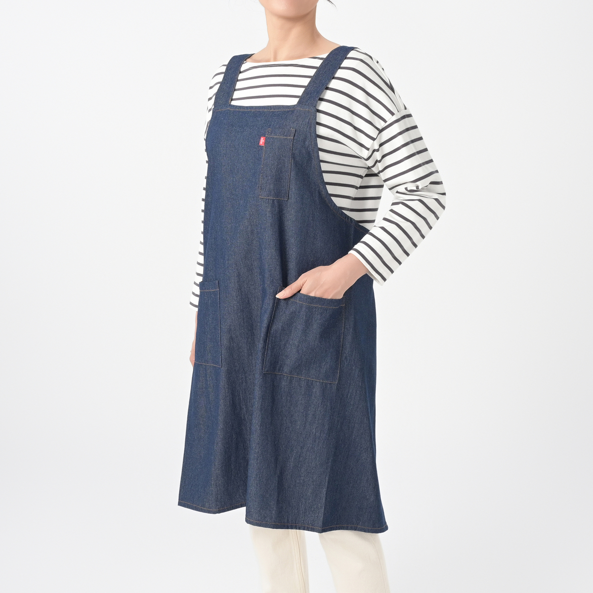 一年を通して使用できるデニム素材のエプロンです。身頃の左右に便利なポケットも付いています