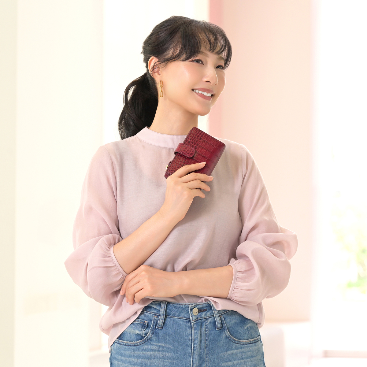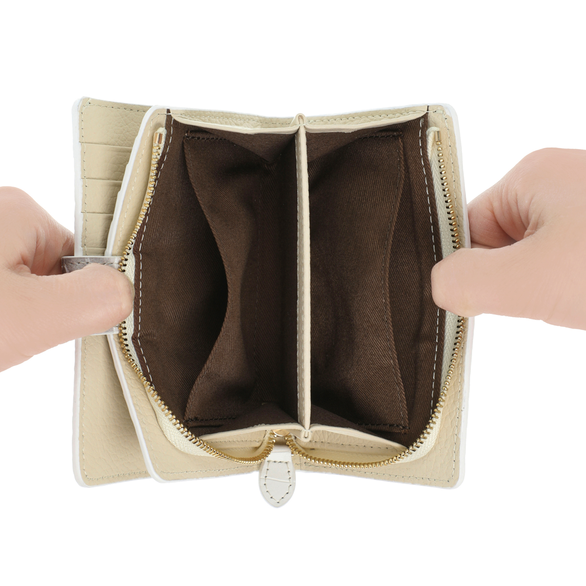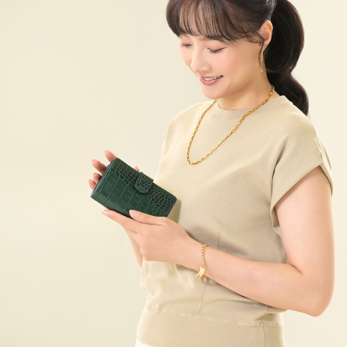 女性が持ちやすいサイズ感。表側にはクロコ型押し牛革を使用。センターベース仕上げで腑模様が最も美しく見えるように裁断しています。コインポケットと札入れ・カードポケット部分は別開閉の仕様に。カードポケットやオープンポケットも付き、しっかりと区分けして使うことができます