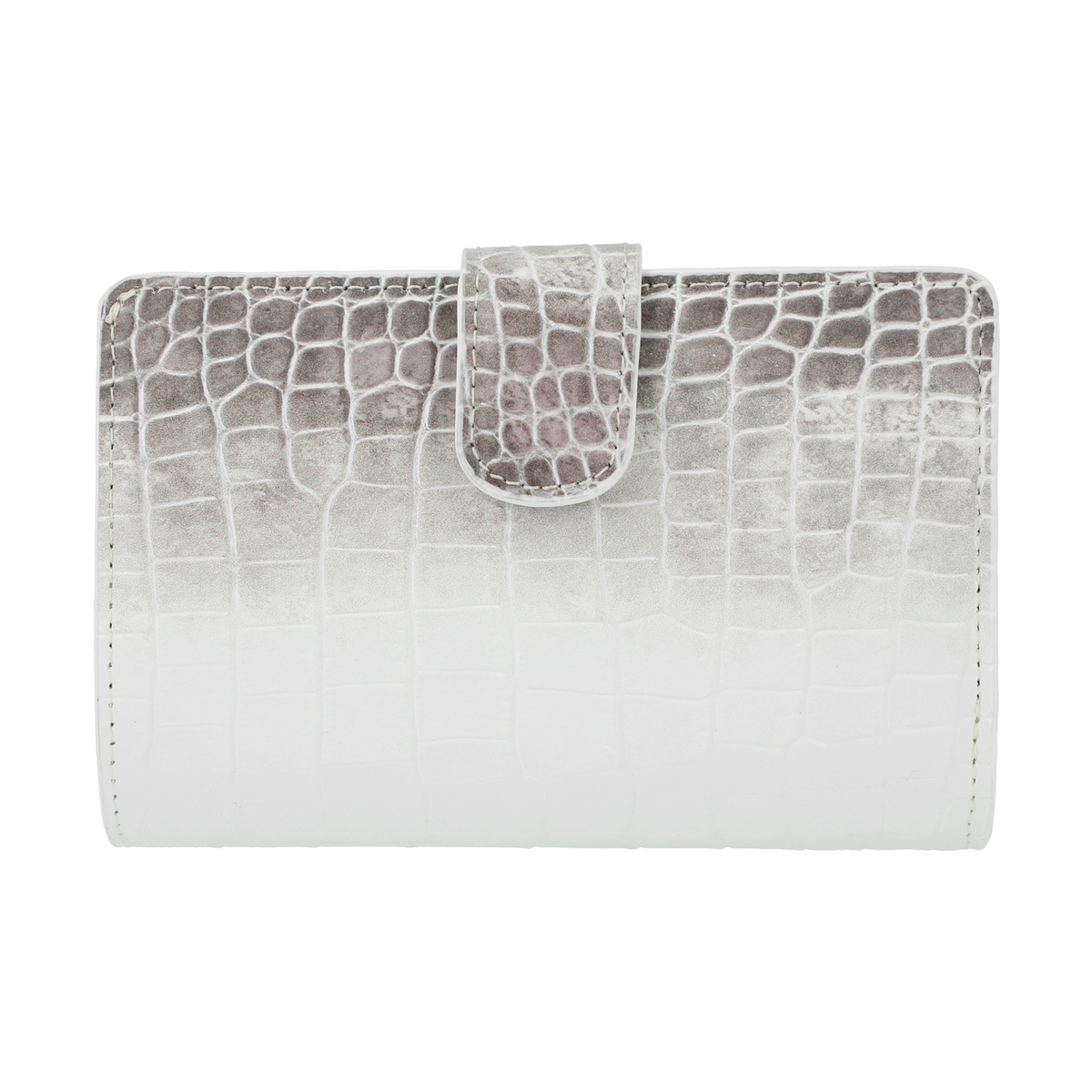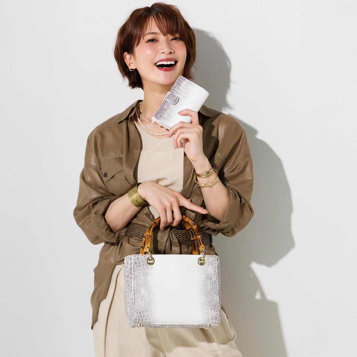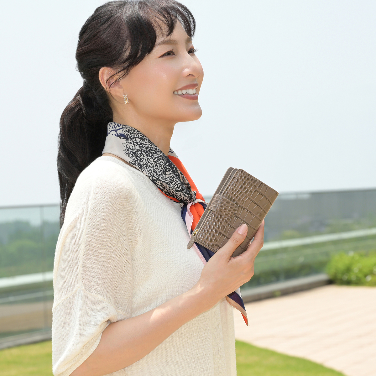 女性が持ちやすいサイズ感。表側にはクロコ型押し牛革を使用。センターベース仕上げで腑模様が最も美しく見えるように裁断しています。コインポケットと札入れ・カードポケット部分は別開閉の仕様に。カードポケットやオープンポケットも付き、しっかりと区分けして使うことができます