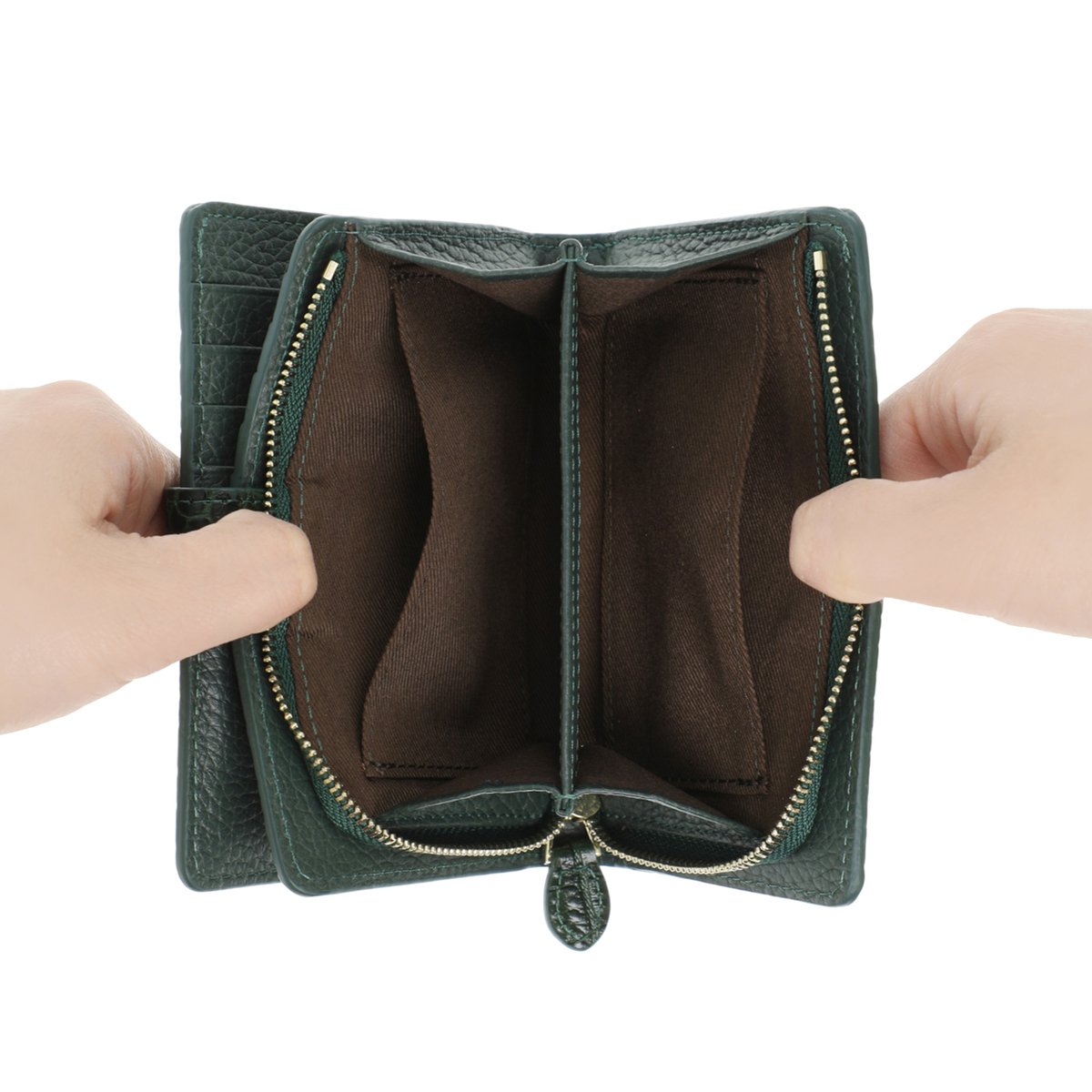 [サイズ(約)] 縦13.5×横9×厚み3.5cm [重量(約)] 130g [素材] 表地:牛革 内側:牛革 ポリエステル レーヨン ※裏地有 [仕様] 開閉:ファスナー/ベロスナップボタン式 [ポケット] 内側:オープンポケット×3 カードポケットx13(内4つはお札入れに4箇所) 外側:ファスナーポケットx1 カードポケットx2(ファスナーポケット内) 【ベトナム製】