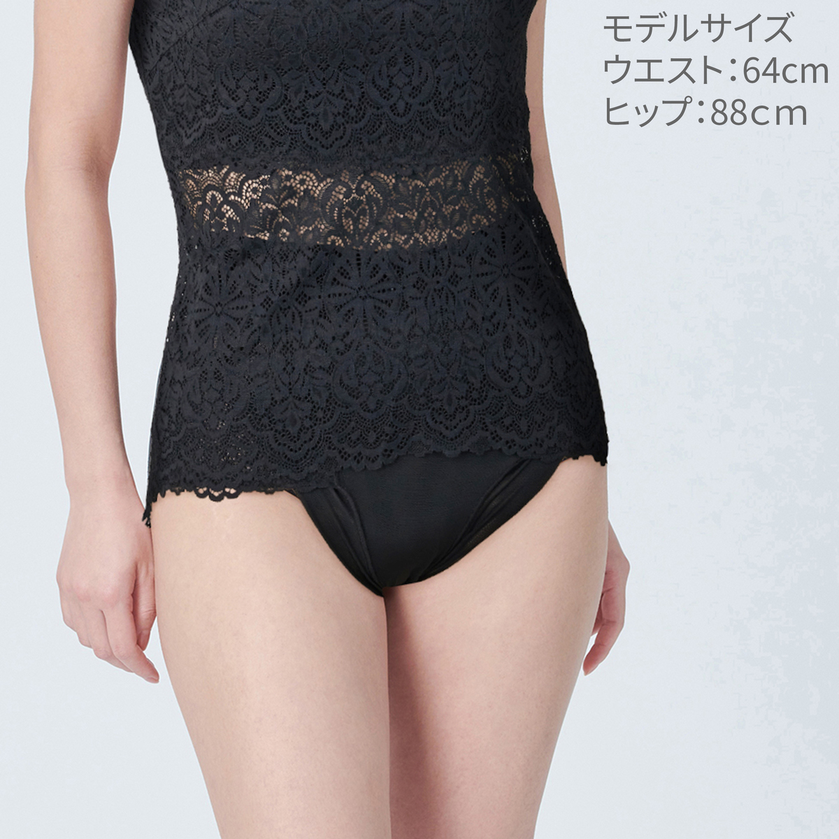 身生地はソフトでさらさらタッチのパワーネット素材。伸縮性があり締め付け過ぎず、お腹やヒップを補整します。メッシュ組織で通気性があり、接触冷感機能もあるのでオールシーズン快適で、クロッチの肌側には、綿100%天竺を使用しました