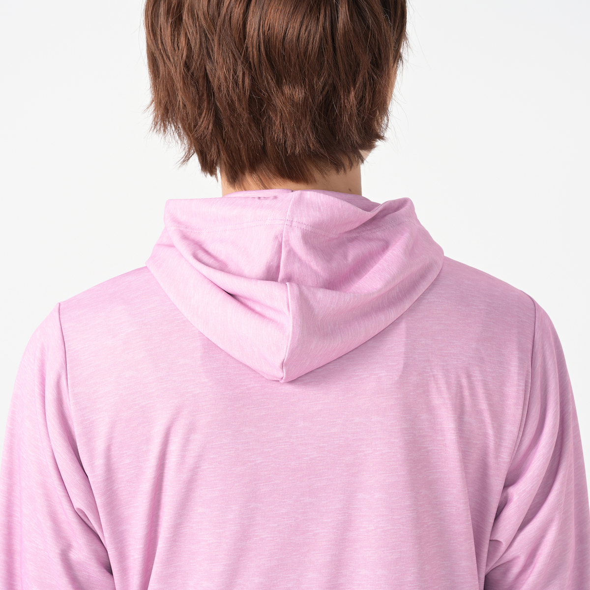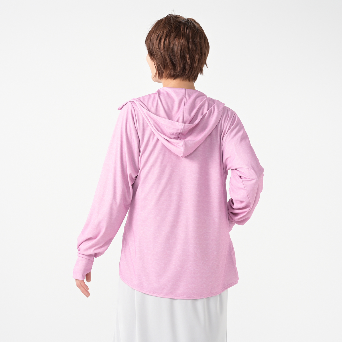 数年前から愛用しており、こちらで3代目です。 今回は杢ブラックを頂きました。 腕がゆったりしているので、風通しがよく張り付かなくて良いです。 後ろが長いデザインもいかにもUVカットパーカー感が無くて、私はとても好きです。
