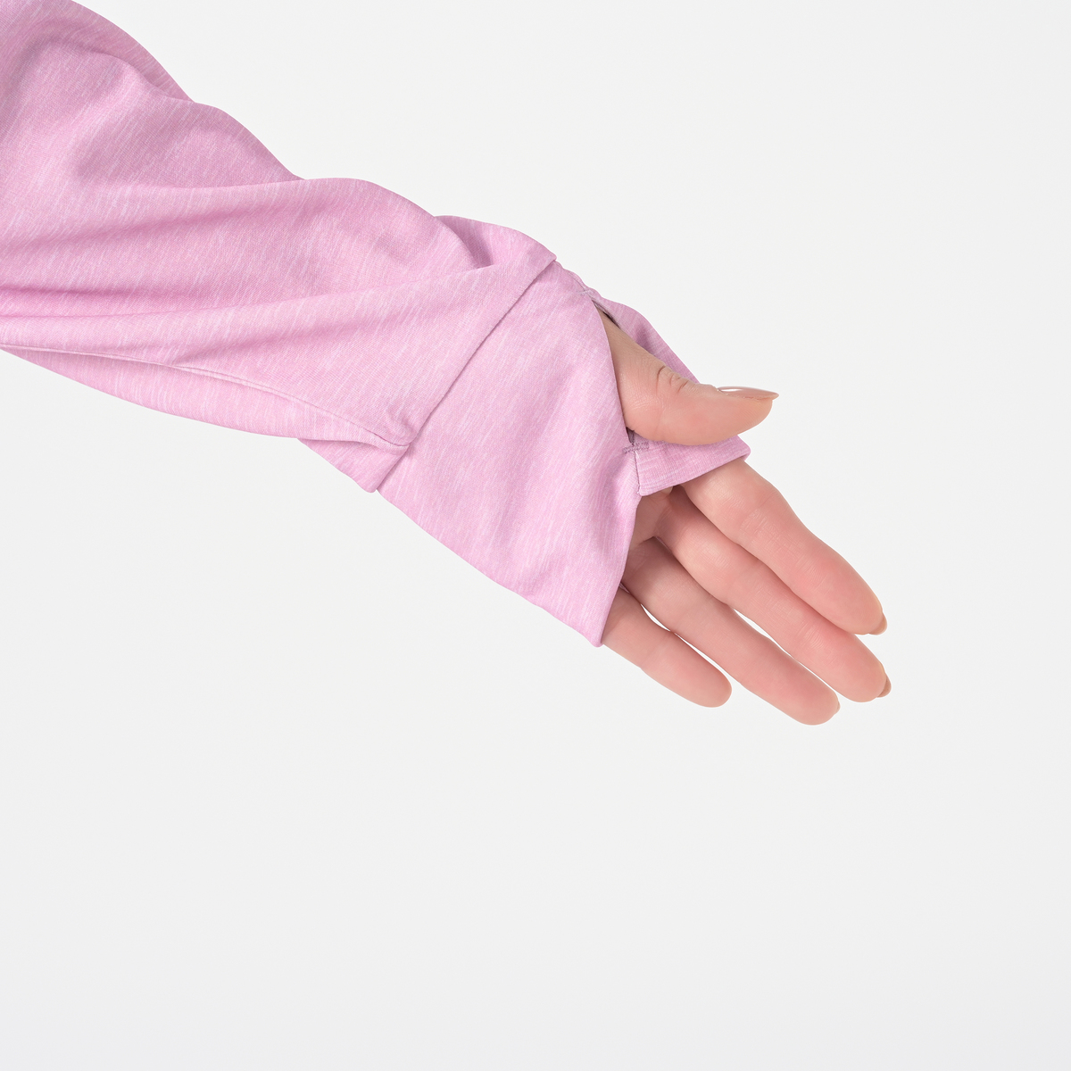 袖口はサムホール付きで手の甲までしっかりガードします。フード付きで、正面首元のボタンをとめることで、うっかり日焼けしやすい後ろの首元もカバー。薄手の生地でコンパクトにまとまり、シワにもなりにくく*、お出かけ時の持ち運びにも便利です
