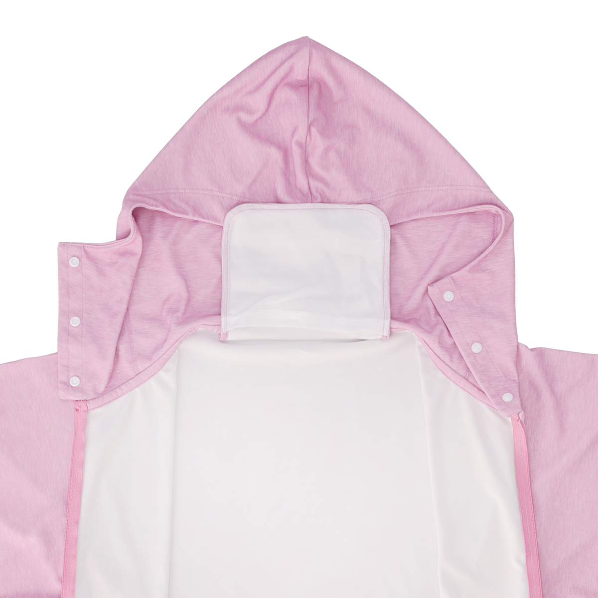 真夏はやはり涼しそうな色が良いですねとても爽やかで先に買った杢ピンクより出番多そうです私のお気に入りは襟元ですファスナーは開けてホックだけ止めて着ています今回はフードも共色袖もふんわりエレガント ただ首後ろの保冷剤入れるポケットは不要 その分安い方が良かったですね でも着る木陰大好きです
