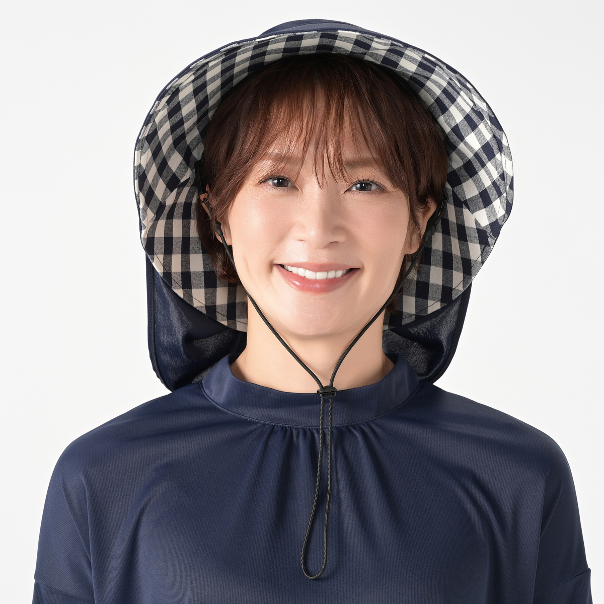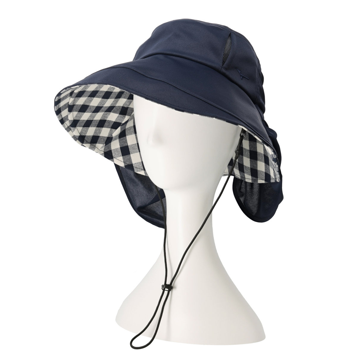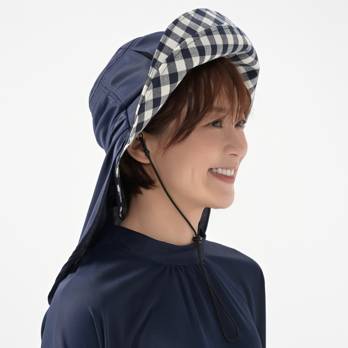 ネイビーを選んだのですが裏地のギンガムチェックが可愛いです。 後ろのリボンになっているところも可愛いです。 幅がゆったりしていて後ろもあるのでまさに木陰ですね、帽子の紐もついているので 強風にも対応できそう。自転車乗りにいいですね。