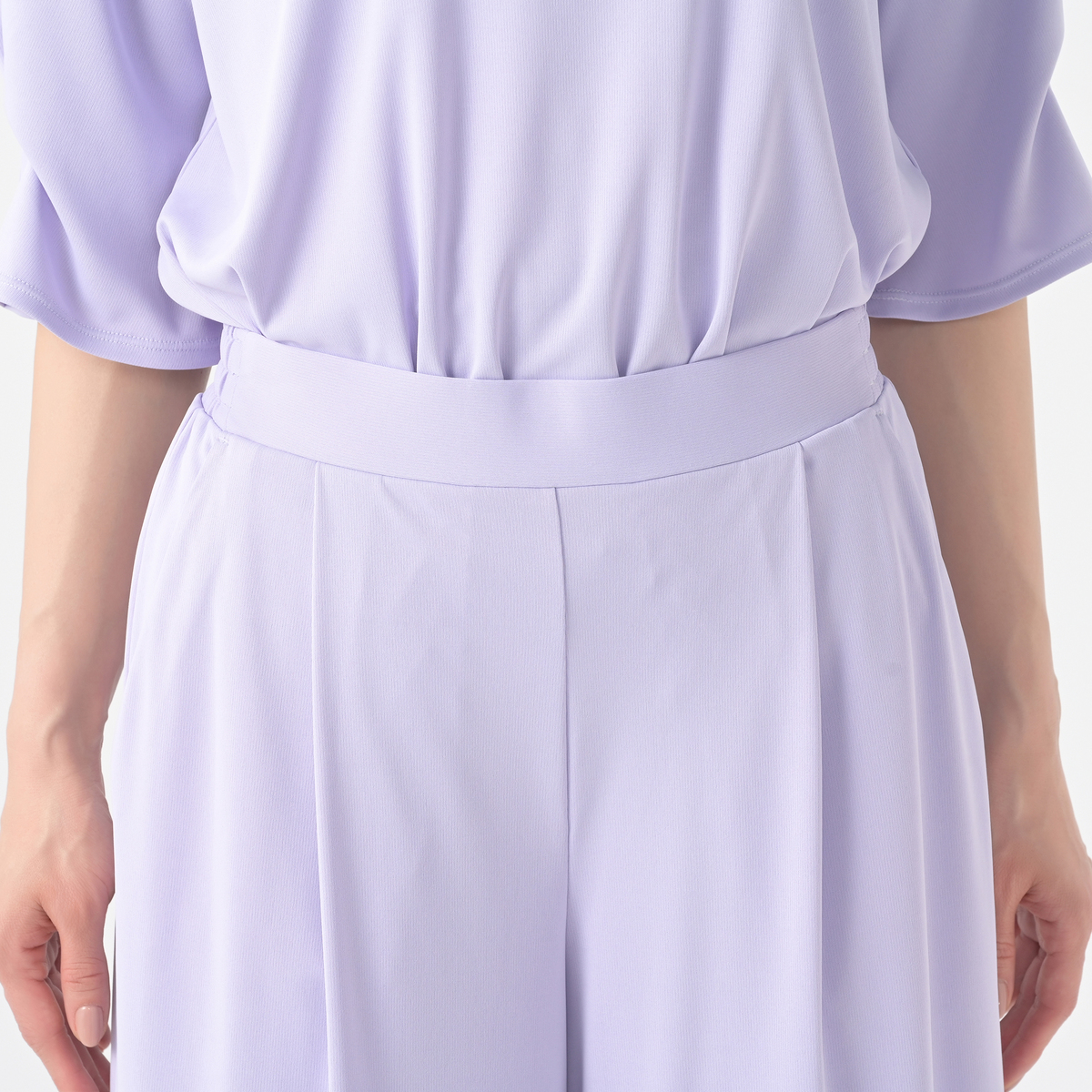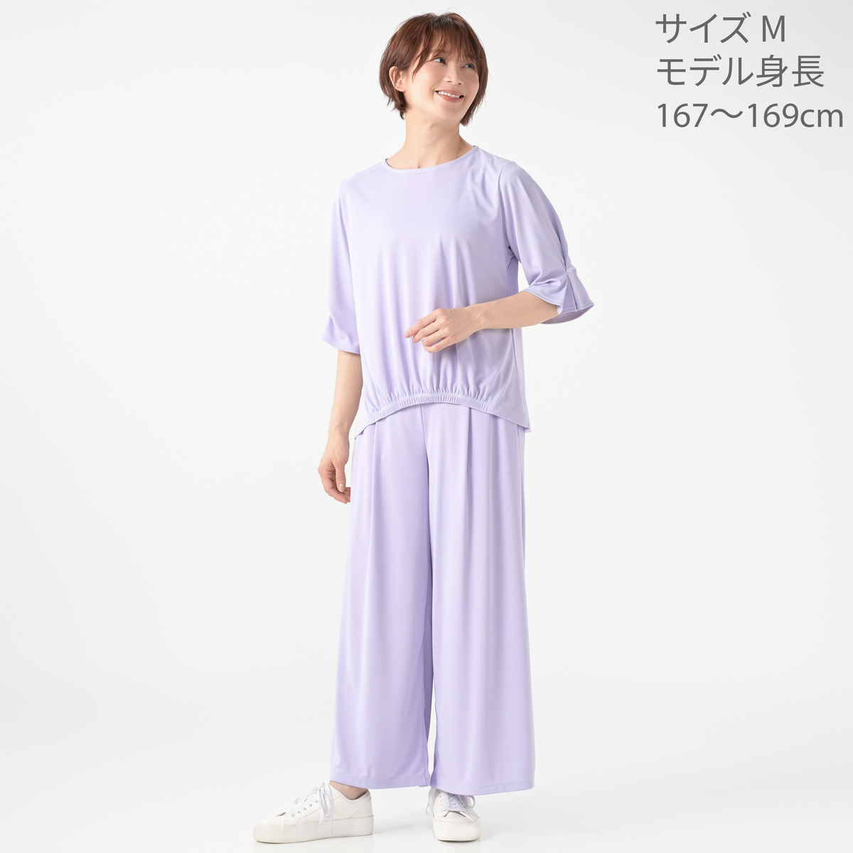 身長163cm、54キロ Mサイズで丈、ウエストがピッタリです ロングのパンツにもかかわらず清涼感あり 今年の暑さでも、とても着心地が良いです 独特な素材のドレープ感は品が良く、どんなカットソー、羽織り物でも合うのがうれしいです ネイビーが気に入りブラックも購入 秋物もぜひお願いします ※好みでしょうが全体的な広がりが気になり 両サイド6cmつめました 最高のラインです。