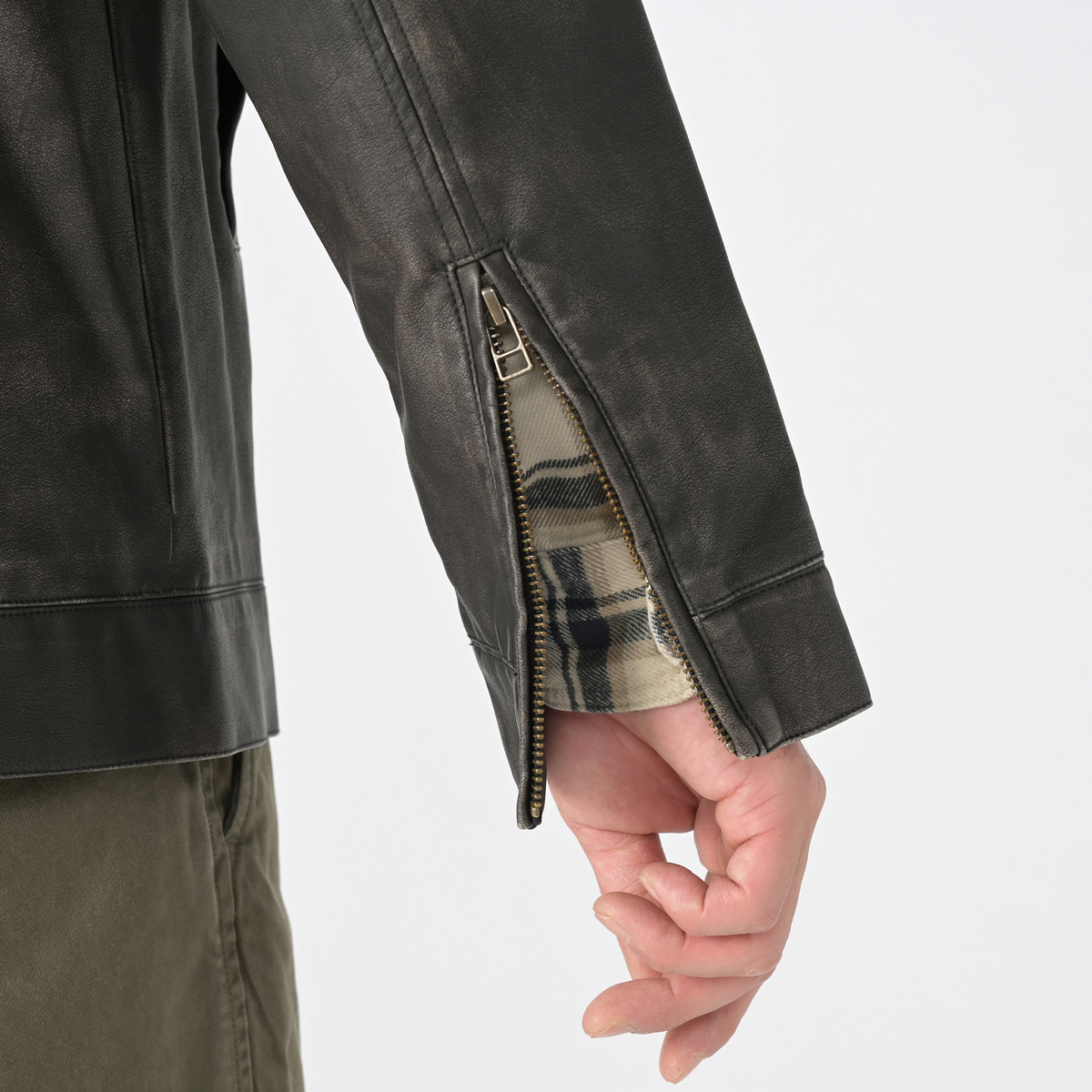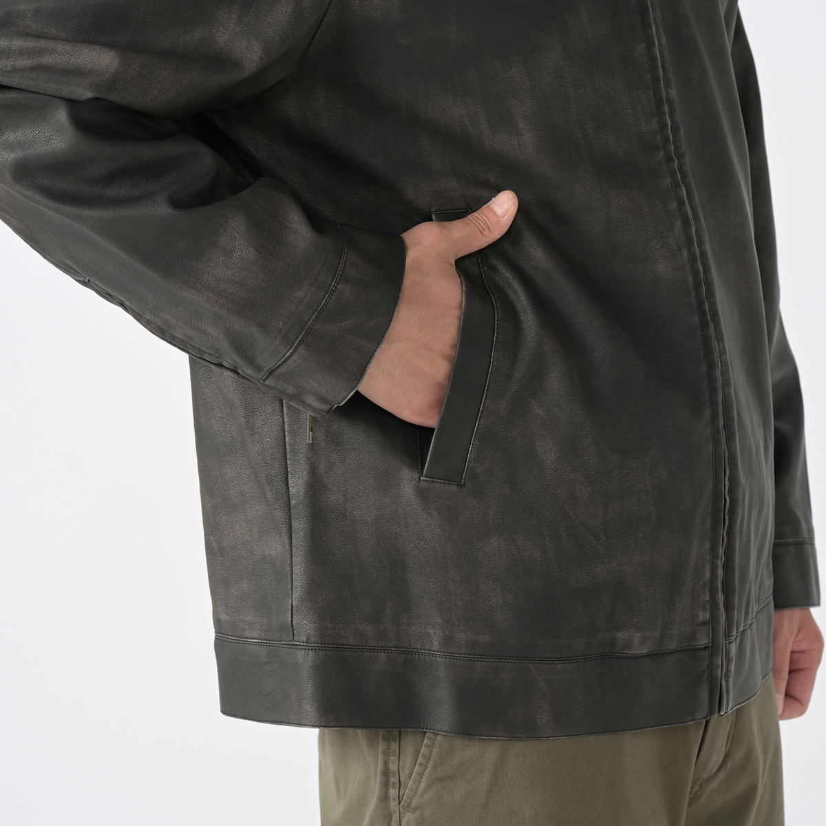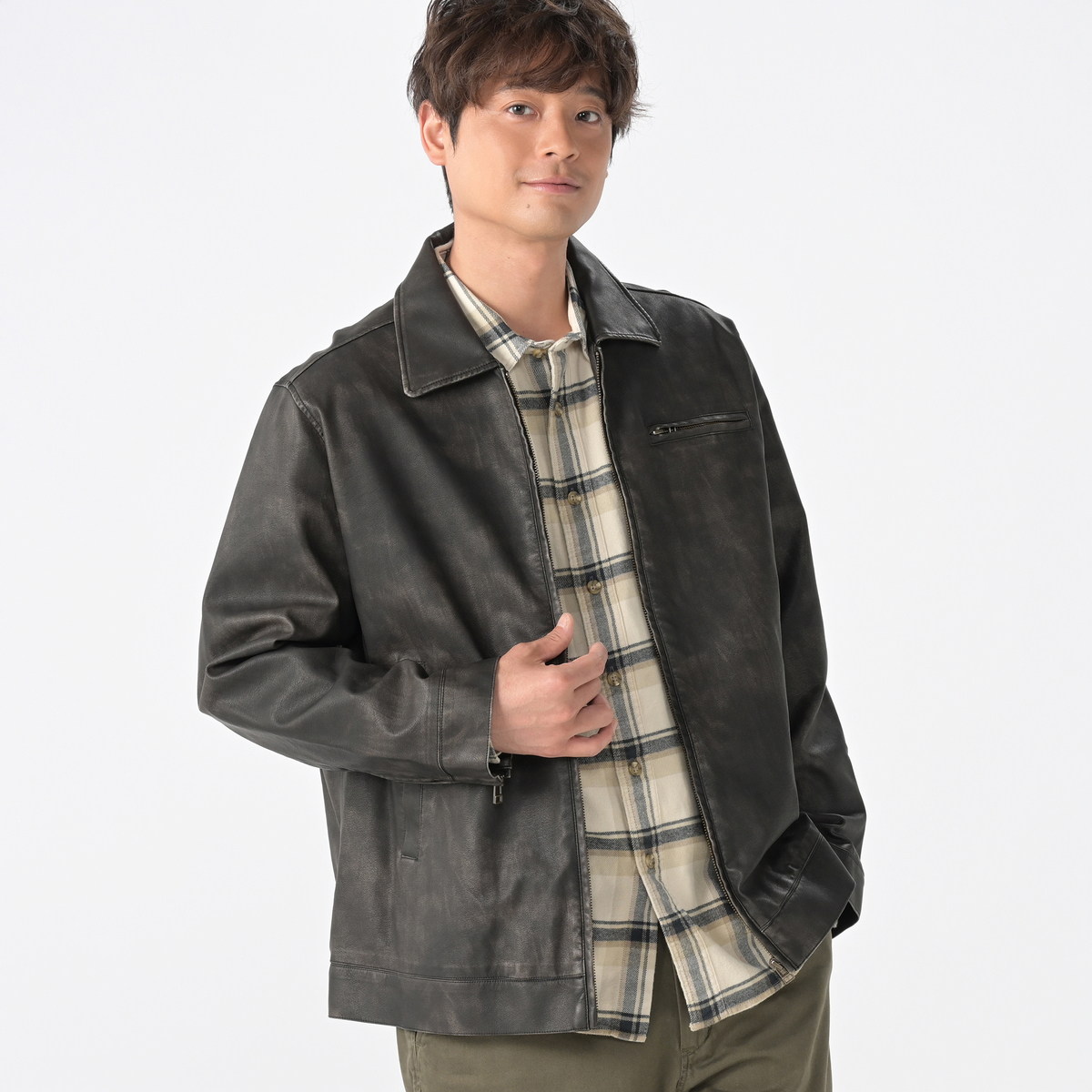 合皮素材を使用した、スタリッシュなジップアップジャケット。ヴィンテージ調の加工を施しているため、カジュアルな着こなしに。衿付きで胸元のポケットもポイントになっています