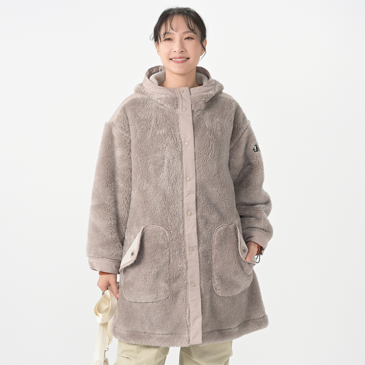 モコモコフリースの裏面に、更にフリースをボンディングした、あたたかな素材のベンチコート。フード周りと前立て、肩ヨークと袖口にはポリエステルタフタに中綿を抱かせた素材を使用し、同系色の異素材使いがさりげないポイントに。前立てには同色の小さなドットボタンを付け、袖口には丸ゴムを通してアジャスターで絞ることができるようになっています