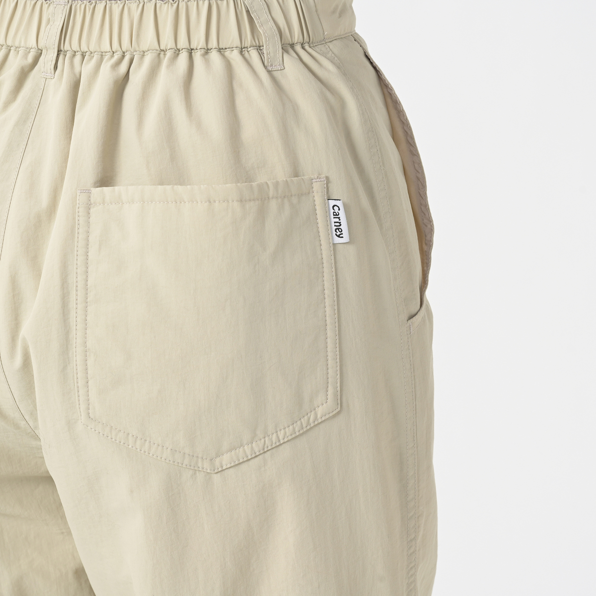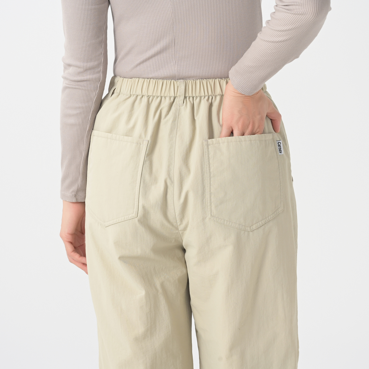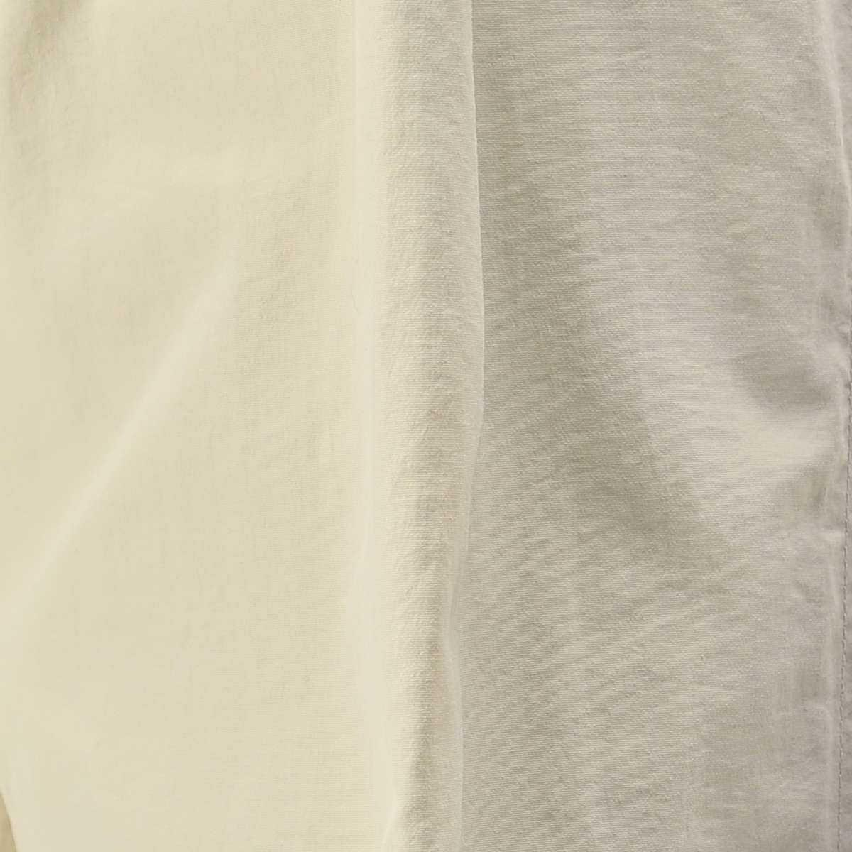 フロントはベルトですっきりと、後ろはゴムで穿きやすく仕上げたワークパンツです。両脇ポケットと後ろにはパッチポケットも配置。屈伸の動きをサポートする二ータックを入れ、裾は丸ゴムとアジャスターで絞ることができます