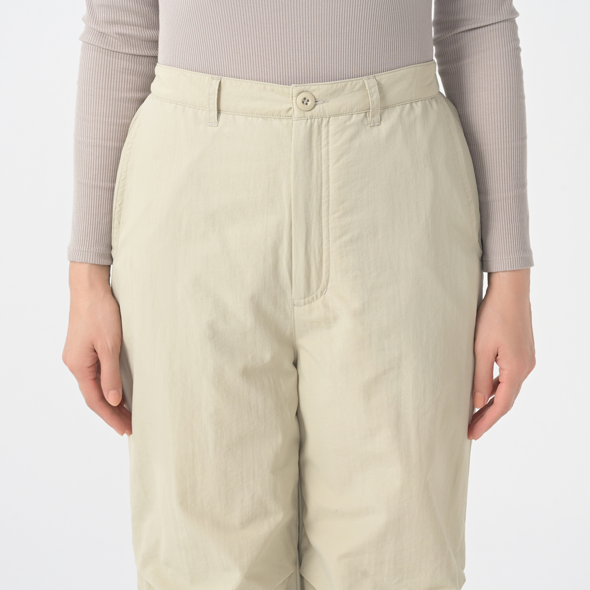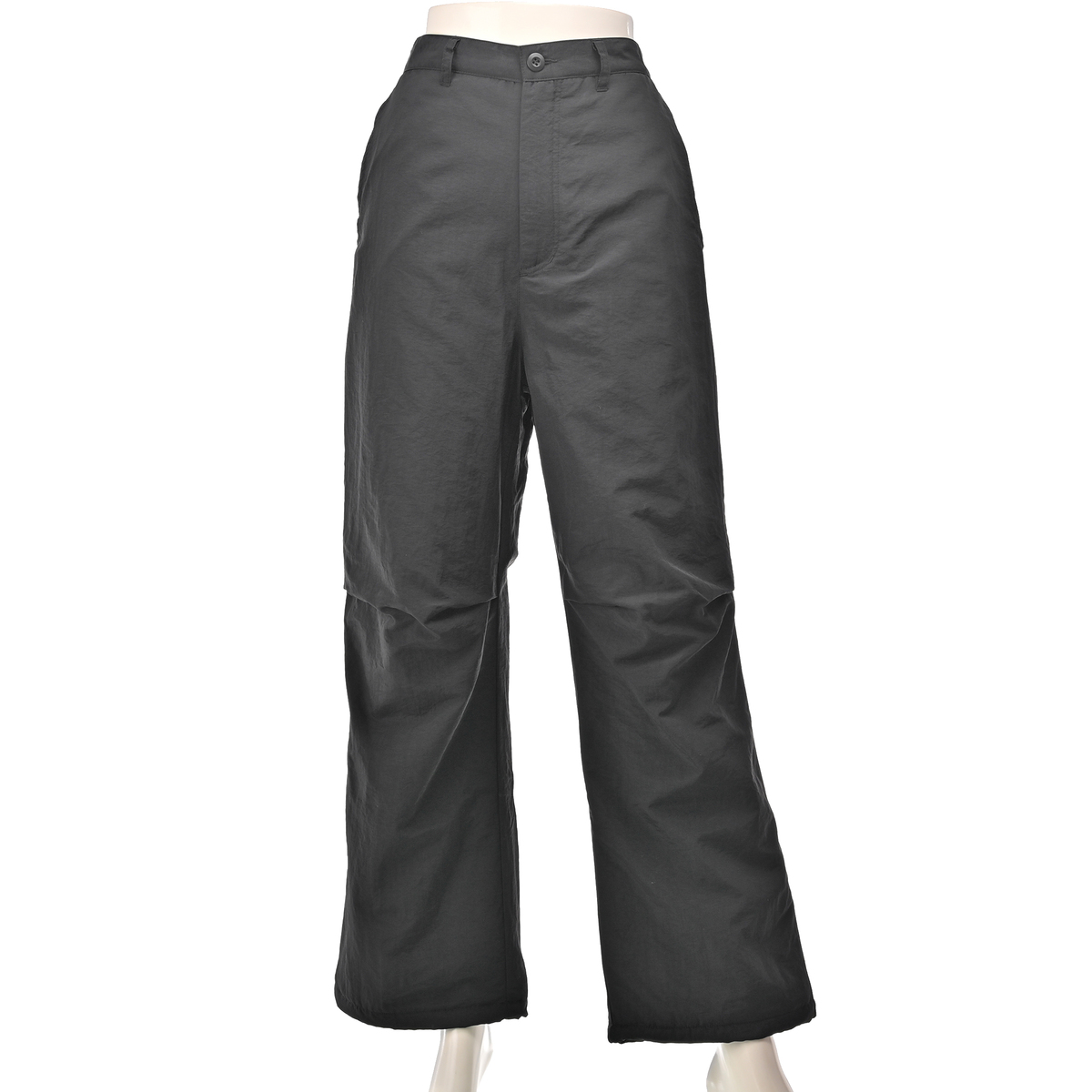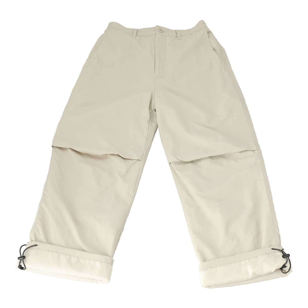 フロントはベルトですっきりと、後ろはゴムで穿きやすく仕上げたワークパンツです。両脇ポケットと後ろにはパッチポケットも配置。屈伸の動きをサポートする二ータックを入れ、裾は丸ゴムとアジャスターで絞ることができます