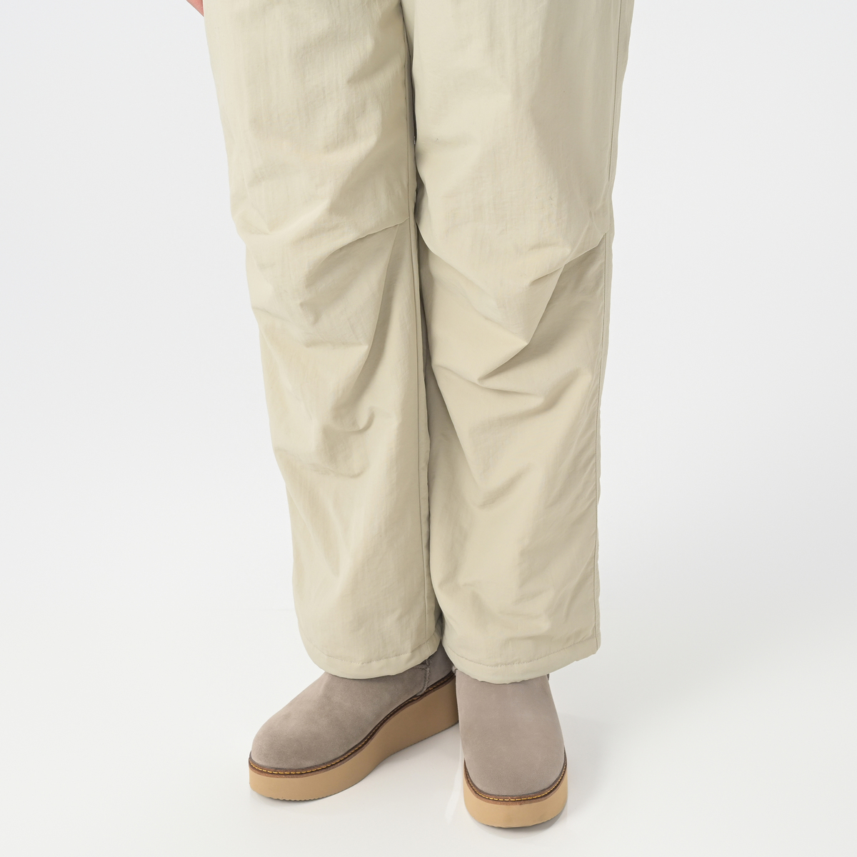 表は撥水加工を施したナイロンタフタを使用。裏地には、ごく薄い中わたを抱かせた、寒い季節のアウトドアにぴったりな仕立てです。ごく薄い中わたを使用することで、着ぶくれ感を軽減します