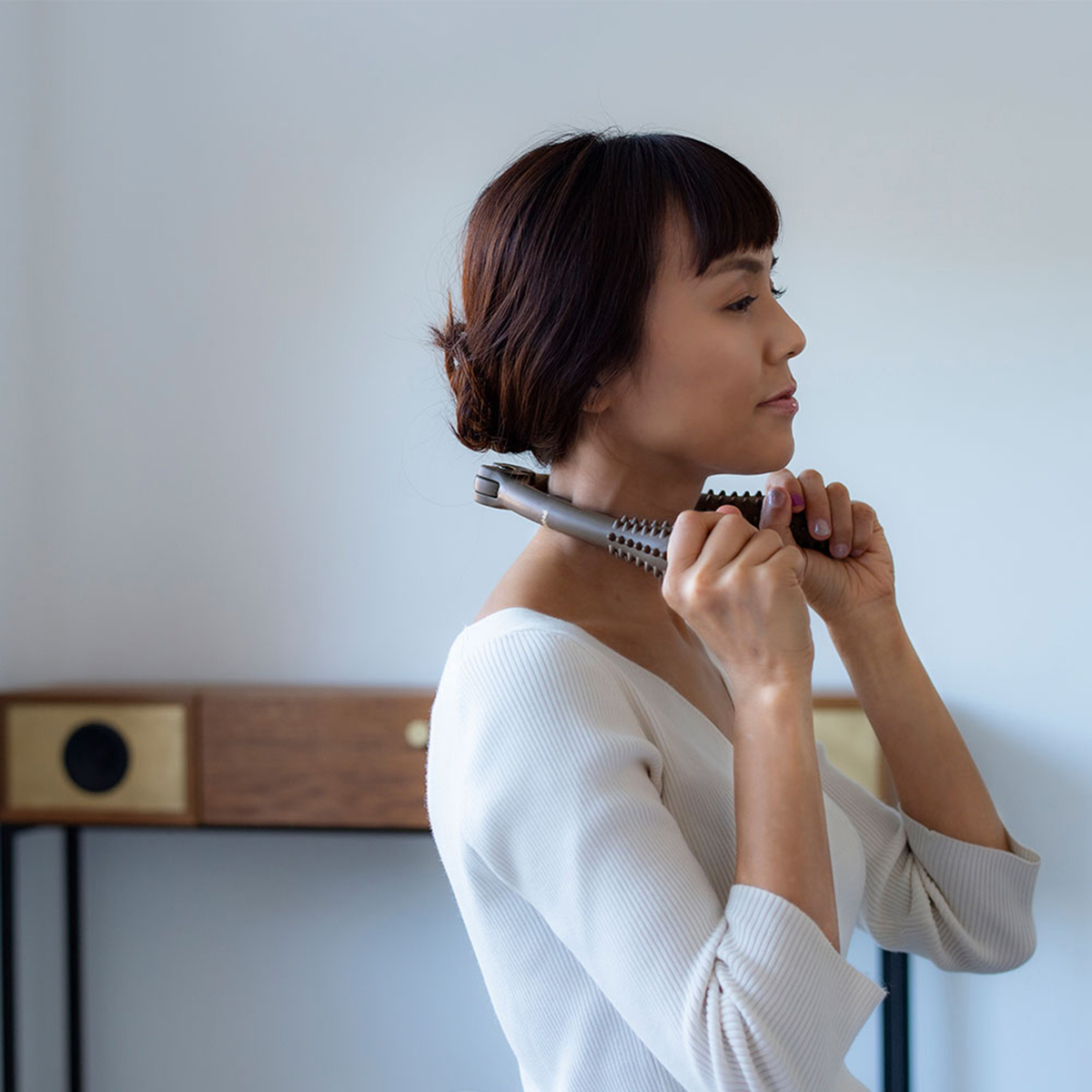 首を心地良く刺激するリセットバーNECK。開閉式で様々な部位に柔軟に対応します。角度や力加減は自身で調整可能。また、グリップにも突起があり手のひらも刺激します