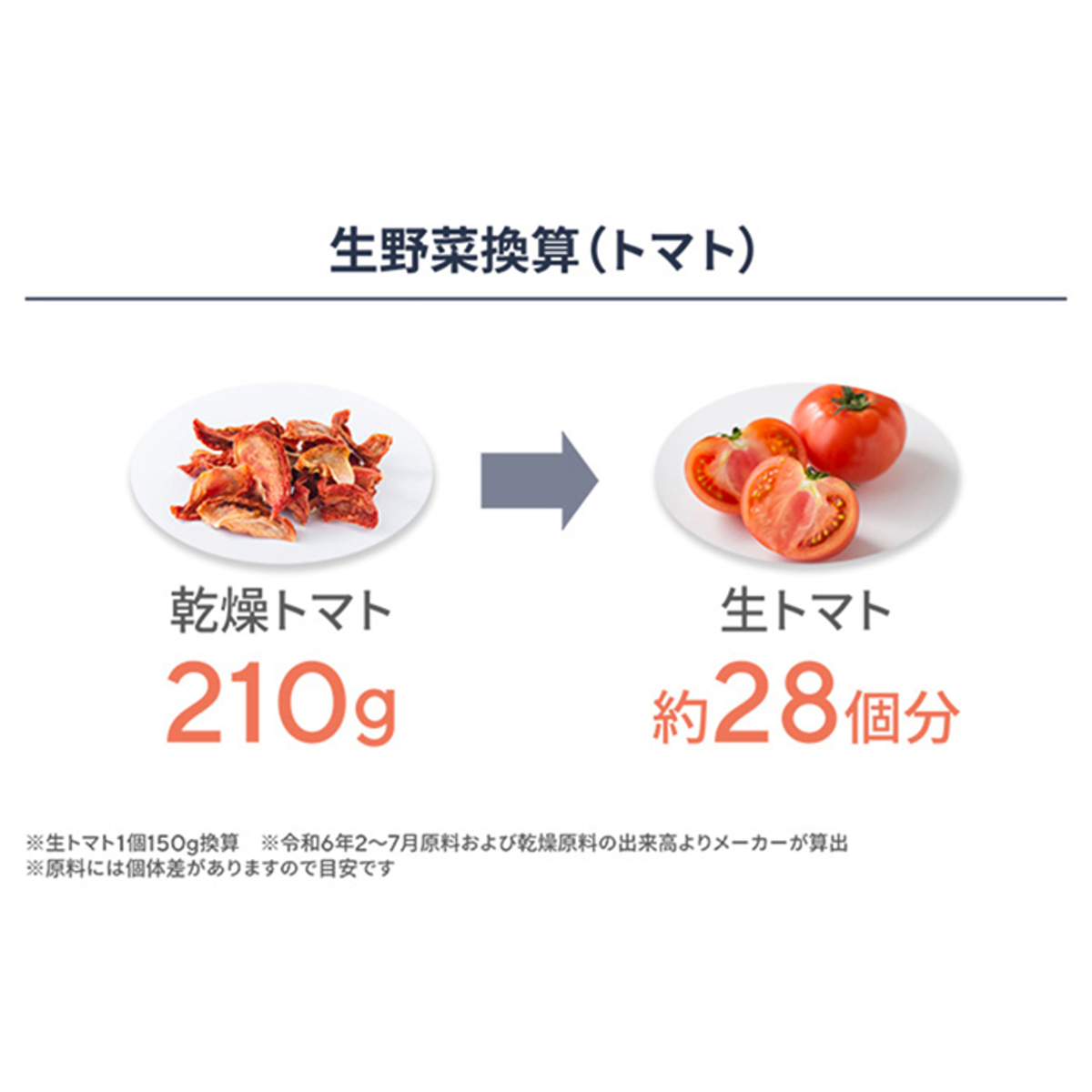水やお湯で戻すとトマトのジューシーな食感と酸味をお楽しみいただけます。乾燥トマト100gあたり生トマト約13.3個(トマト1個150g換算)、乾燥トマト210gだと生トマト約28個分です*。乾燥トマト1袋約70gあたりで約31.3mgのリコピンが含まれます**