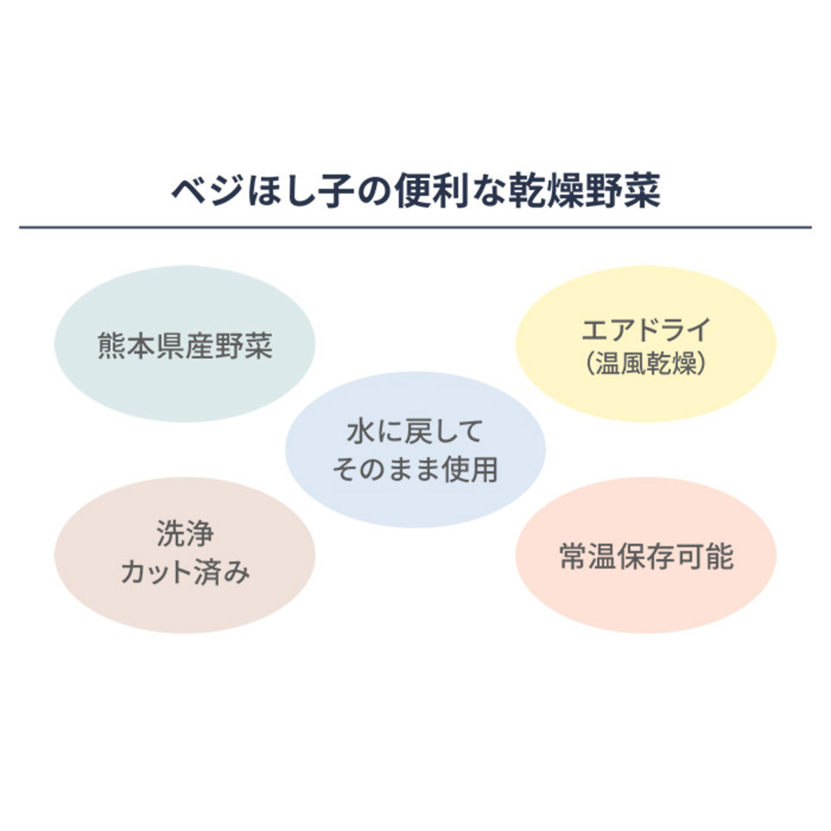 常温保存可能な乾燥野菜。水に戻して使ったり、そのまま使ったりと、面倒な洗浄や皮むきが不要で、生ごみも少なく常備野菜としてもおすすめです。スープやピクルス、主菜・副菜・米・麺・パスタ・お菓子・パンまで幅広い料理にお使いいただけます