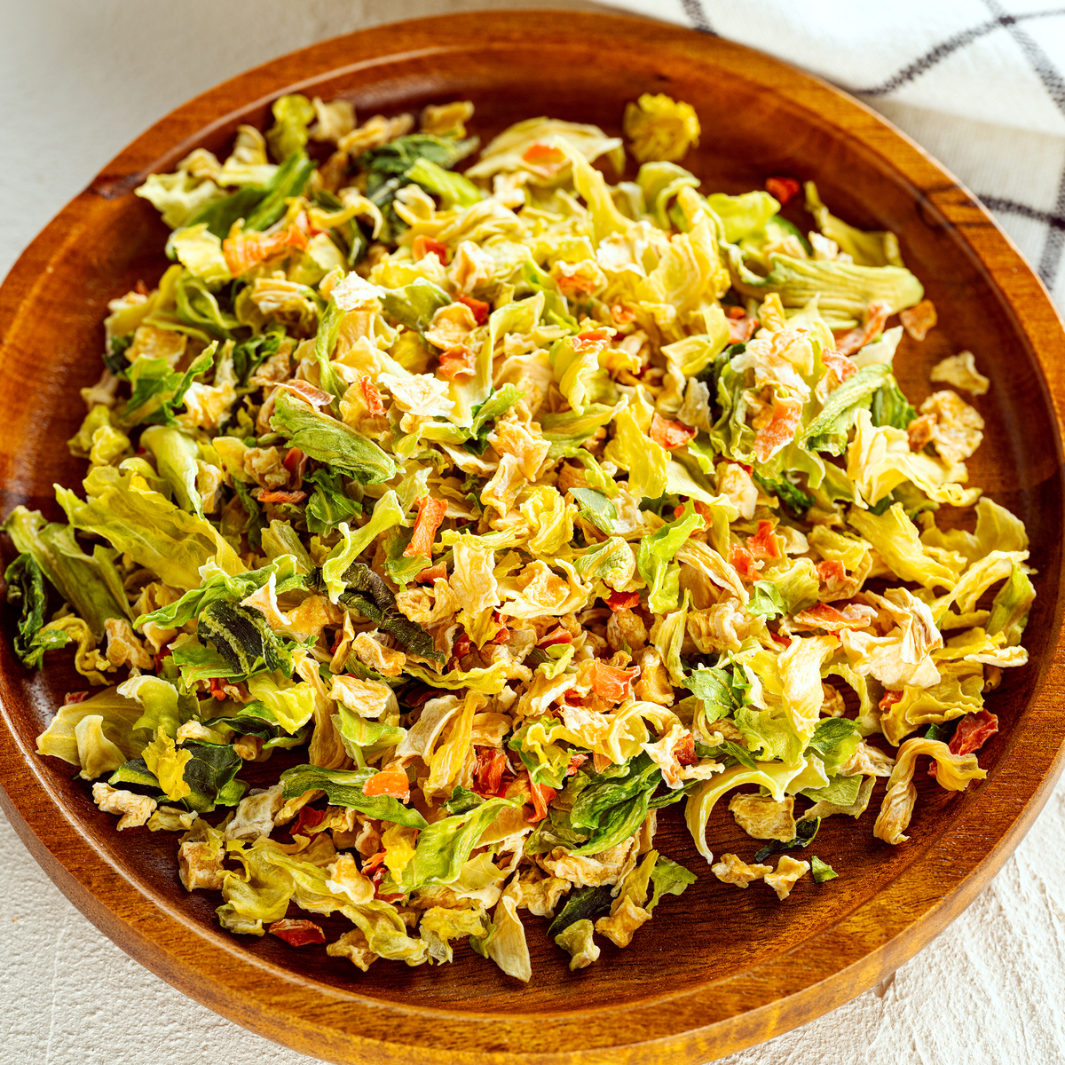 熊本県産の玉ねぎ、キャベツ、にんじんを使用した乾燥野菜MIXです。原料の野菜は熊本県産の野菜にこだわり、野菜を洗浄カットし、エアドライ(温風乾燥)しただけ。野菜本来の色だけでなく、旨味をギュッと閉じ込めています