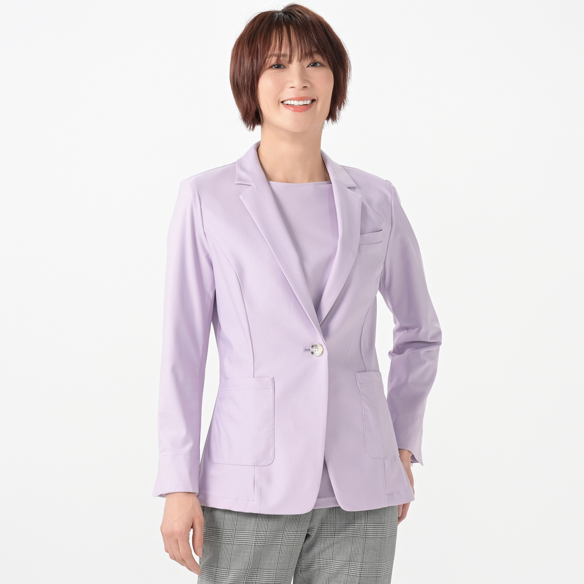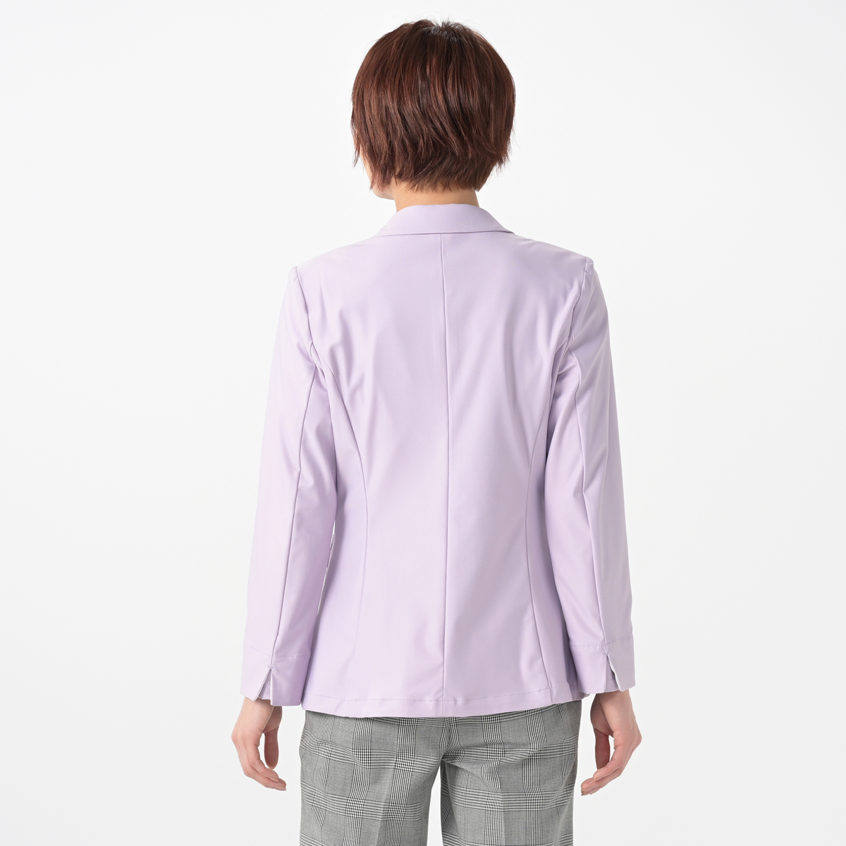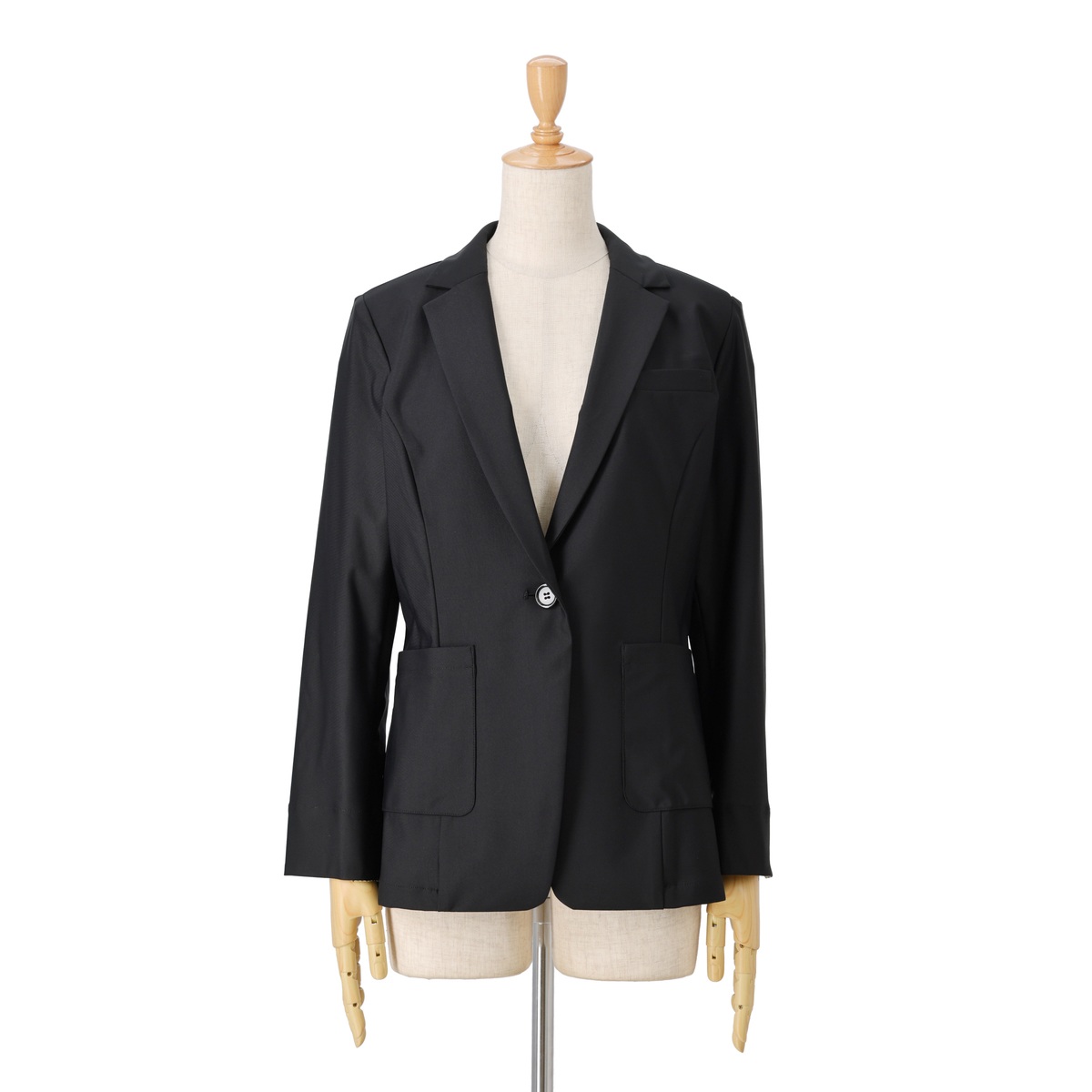 ベーシックな1つボタンのテーラーカラージャケットです。スリット入りの袖口は、折り返して袖丈の調節が可能。ターンバックした時に柄が見えるのもポイントです。生地が伸びるため、肩や背中、腕まわりもラクラク。肩は型崩れしにくいよう薄めの肩パットを付けました
