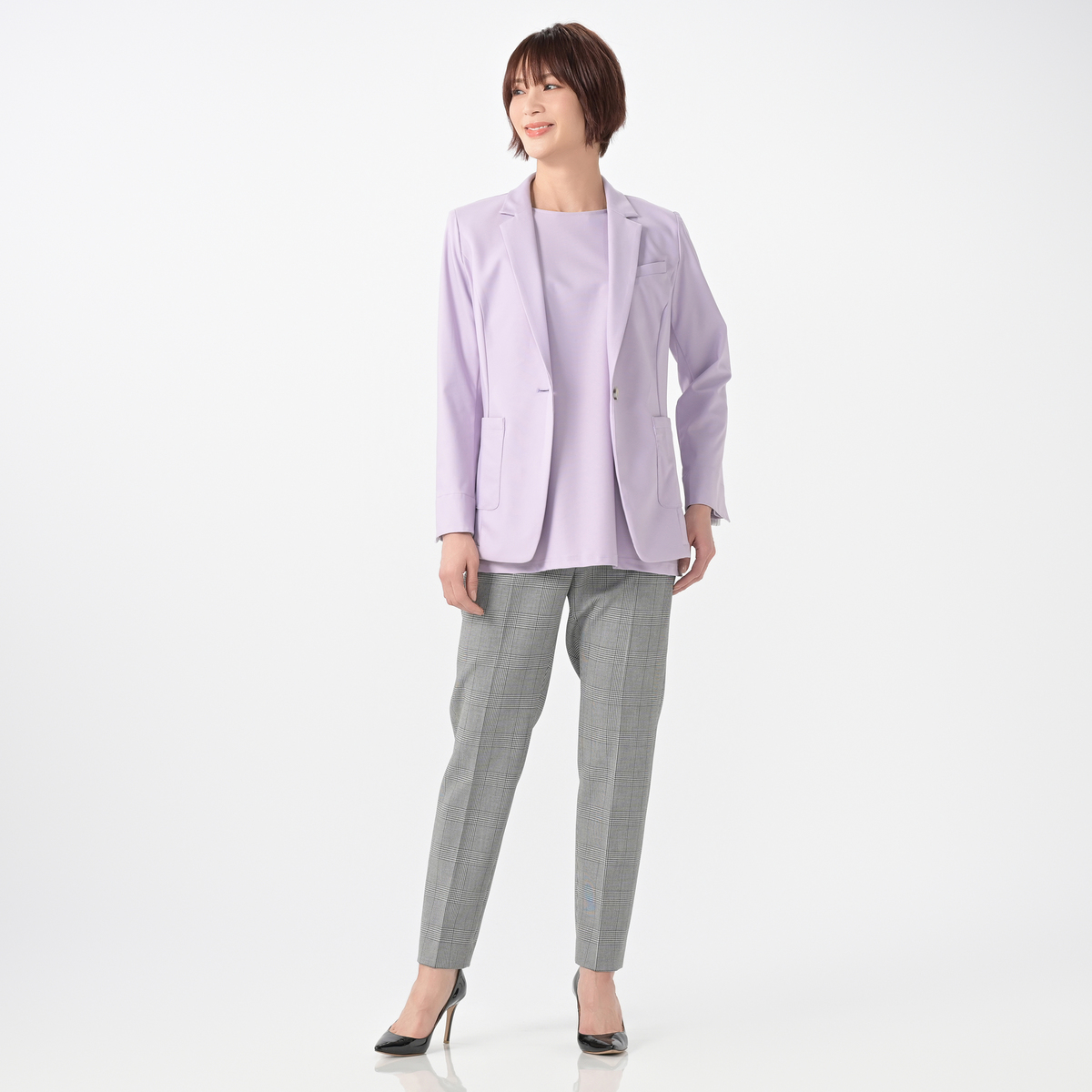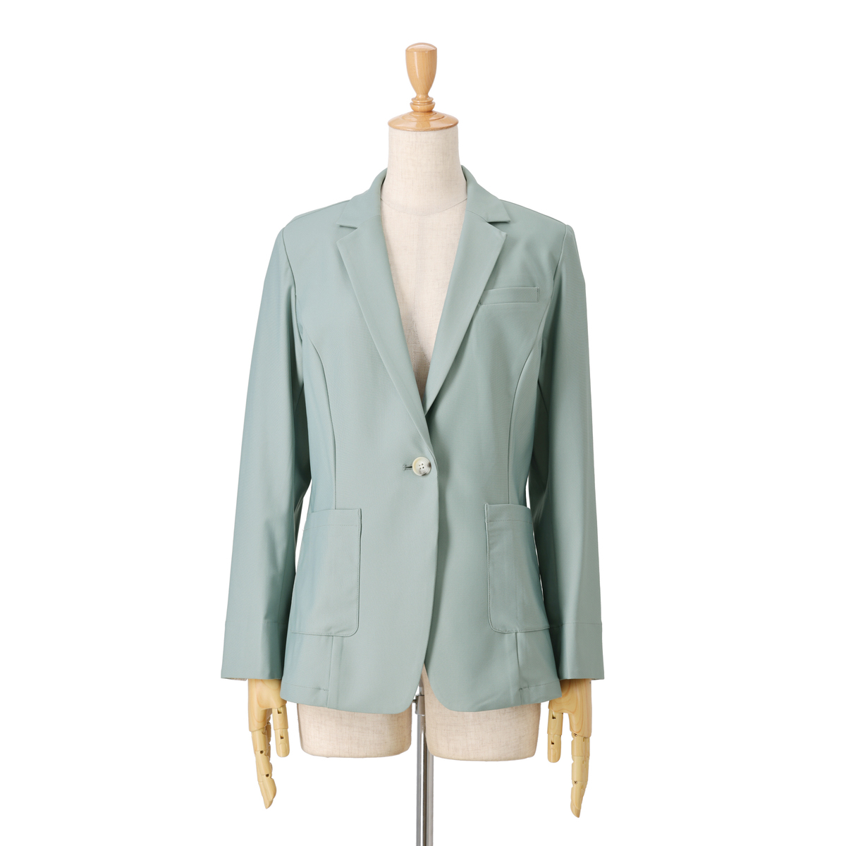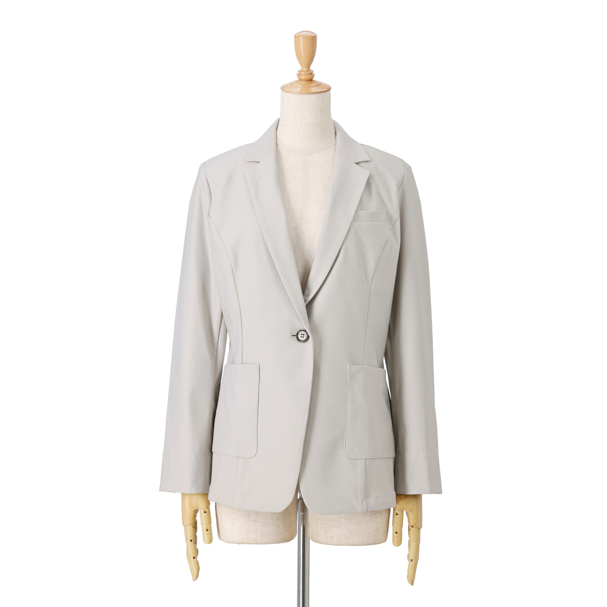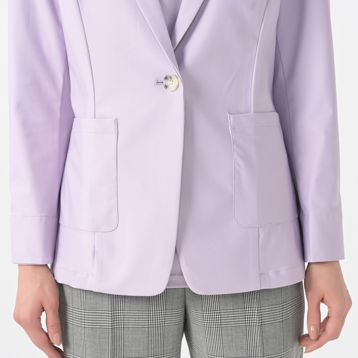 ベーシックな1つボタンのテーラーカラージャケットです。スリット入りの袖口は、折り返して袖丈の調節が可能。ターンバックした時に柄が見えるのもポイントです。生地が伸びるため、肩や背中、腕まわりもラクラク。肩は型崩れしにくいよう薄めの肩パットを付けました