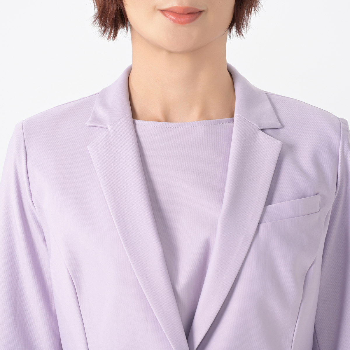 ストレッチ性があり、布帛見えなのに伸縮性のある素材です。脱ぎ着がしやすく、肩や背中、腕周りも楽々な着心地です。