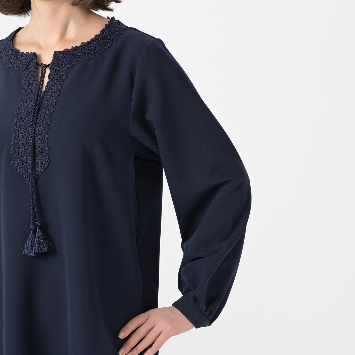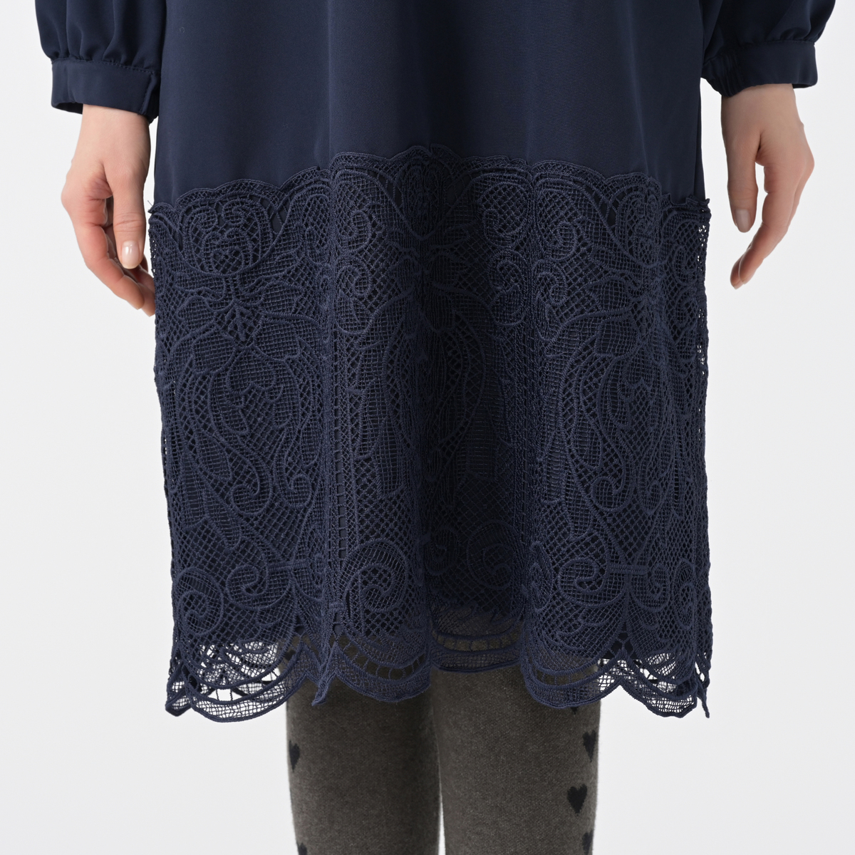 衿ぐり、裾を&LOVEオリジナルレースで飾ったワンピース。レースの柄にはハートが描かれ、カフタン風の衿にはタッセル付きのヒモがついたデザインです。微ストレッチの効いた布帛素材で、肌触りはさらっとしていて、ふくらみのある中肉の生地感によってボディラインを拾いにくくなっています。本体裾のレース部分にのみ裏地を付けました