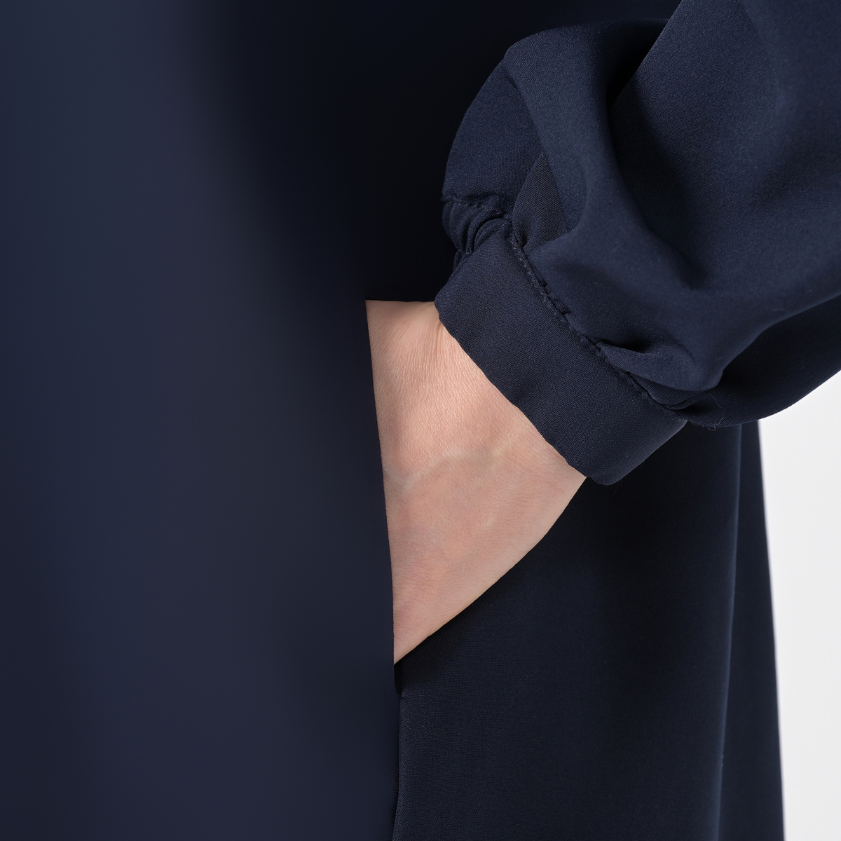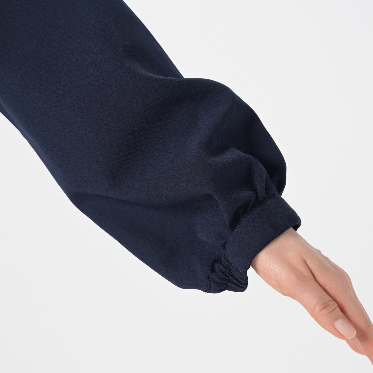 全体は緩やかなAラインで、裾の広がりを控えめにしたすっきりシルエット。セットインの肩が華奢な印象を与え、バストダーツは女性らしい立体感を演出します。袖口はバルーンで、カフス見えの内側ゴム仕様なので腕まくりも楽々。両脇には便利なポケット付きです