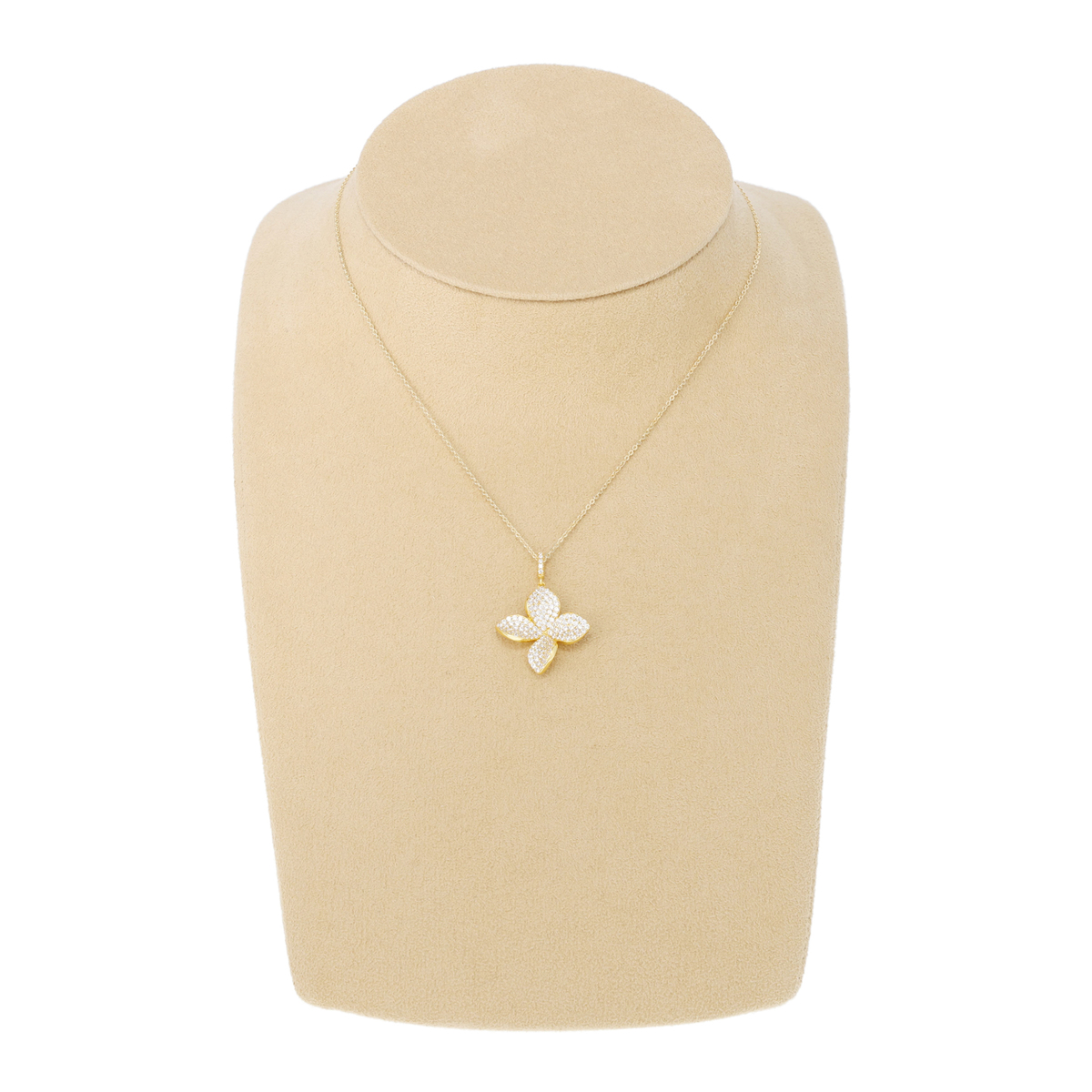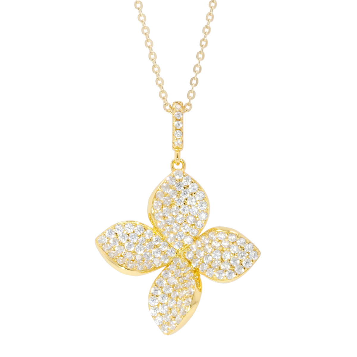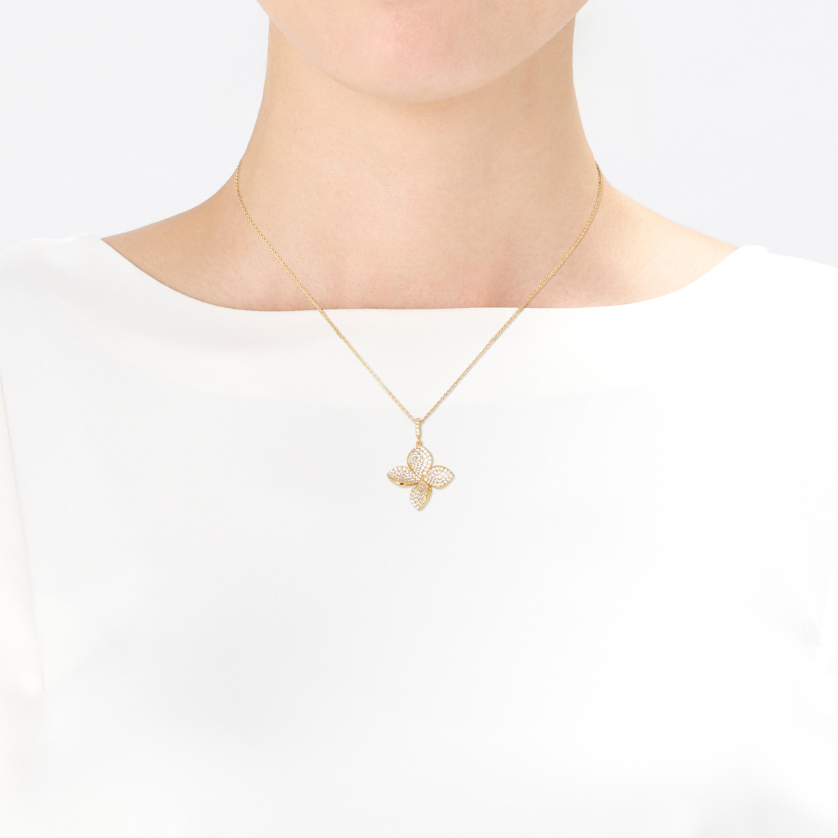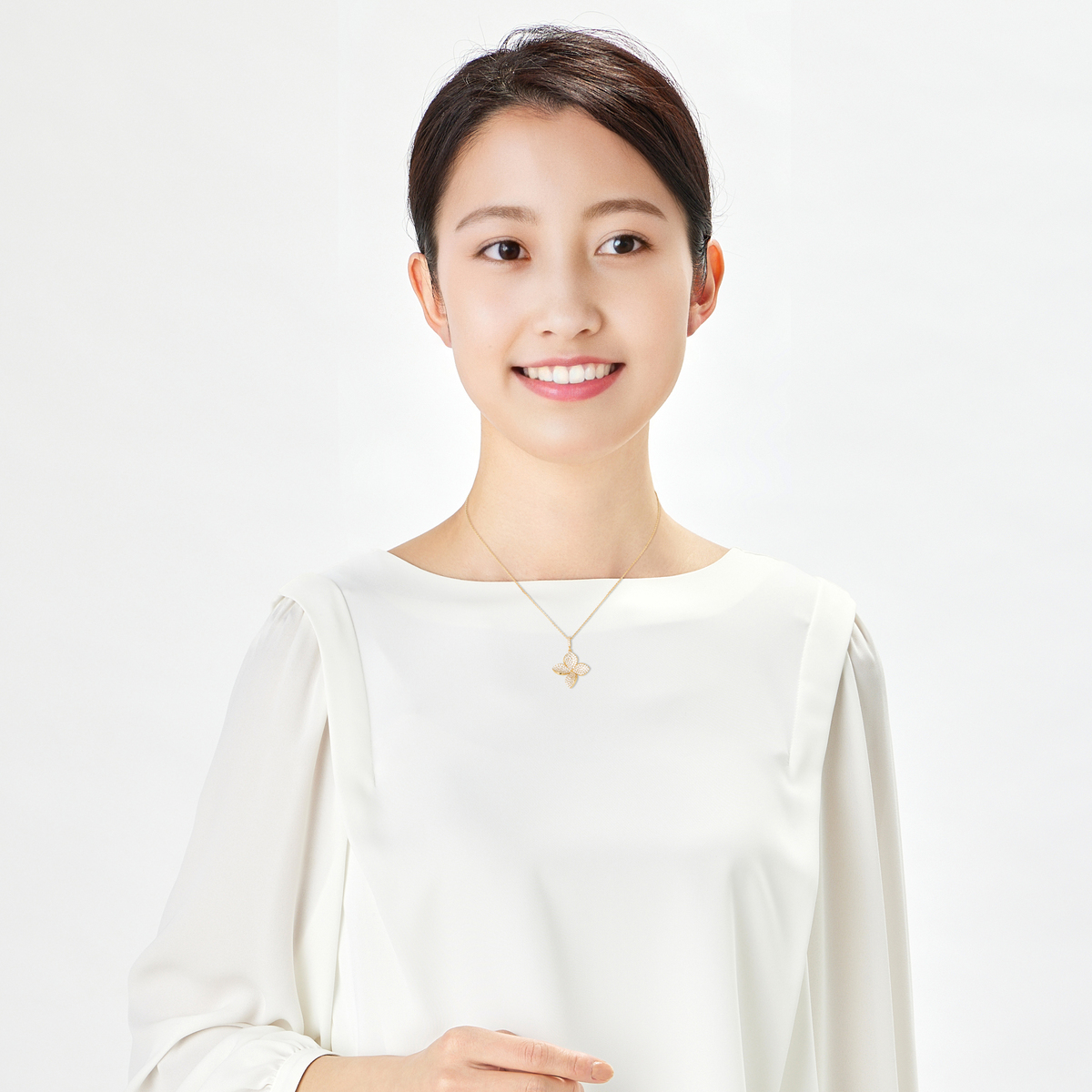 胸元を美しく演出してくれるユリのモチーフのペンダント。存在感あふれる煌めきが魅力です