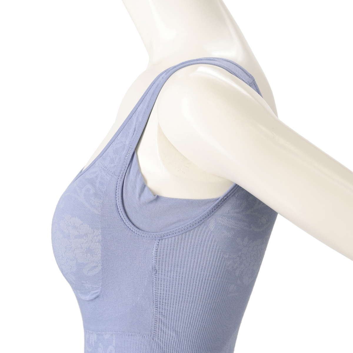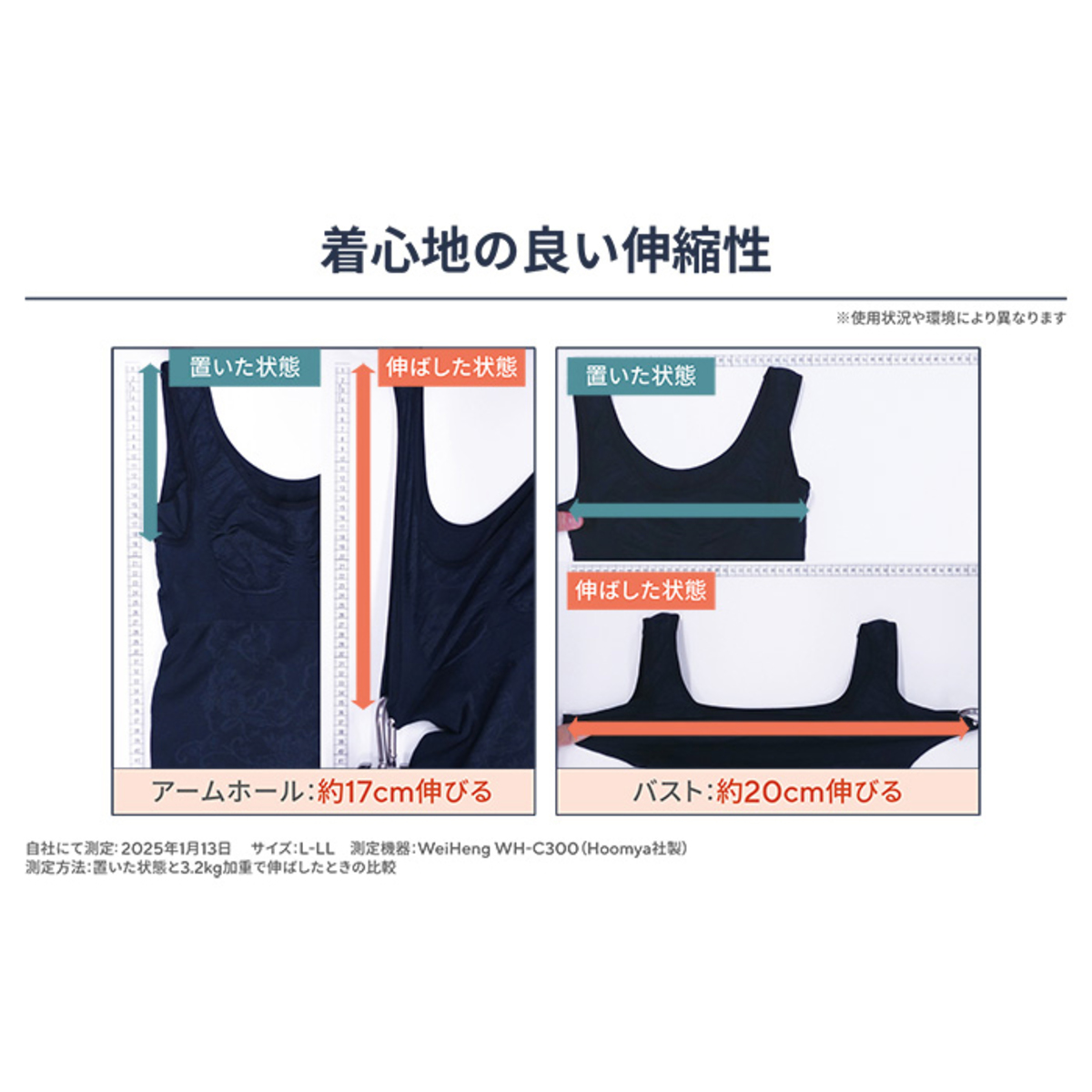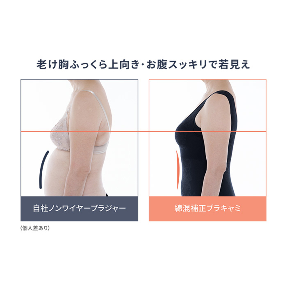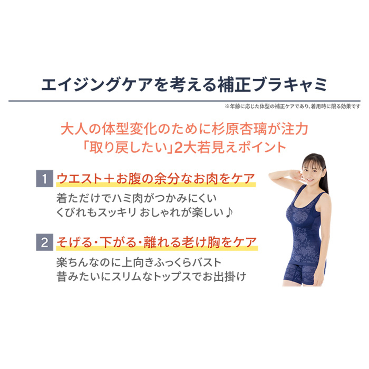 杉原杏璃さんがプロデュースする、エレガントなブラキャミです。下腹部まですっぽりとサポートしながら、ブーケ柄で華やかさも演出。毎日着られるよう身体に無理なくフィットする、ソフト補正タイプです。ノンワイヤーブラとソフトシェイパー、アウター感覚のキャミソールの3役が1枚に詰まっています