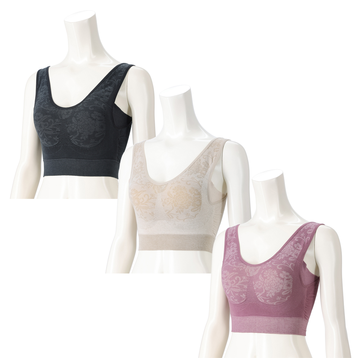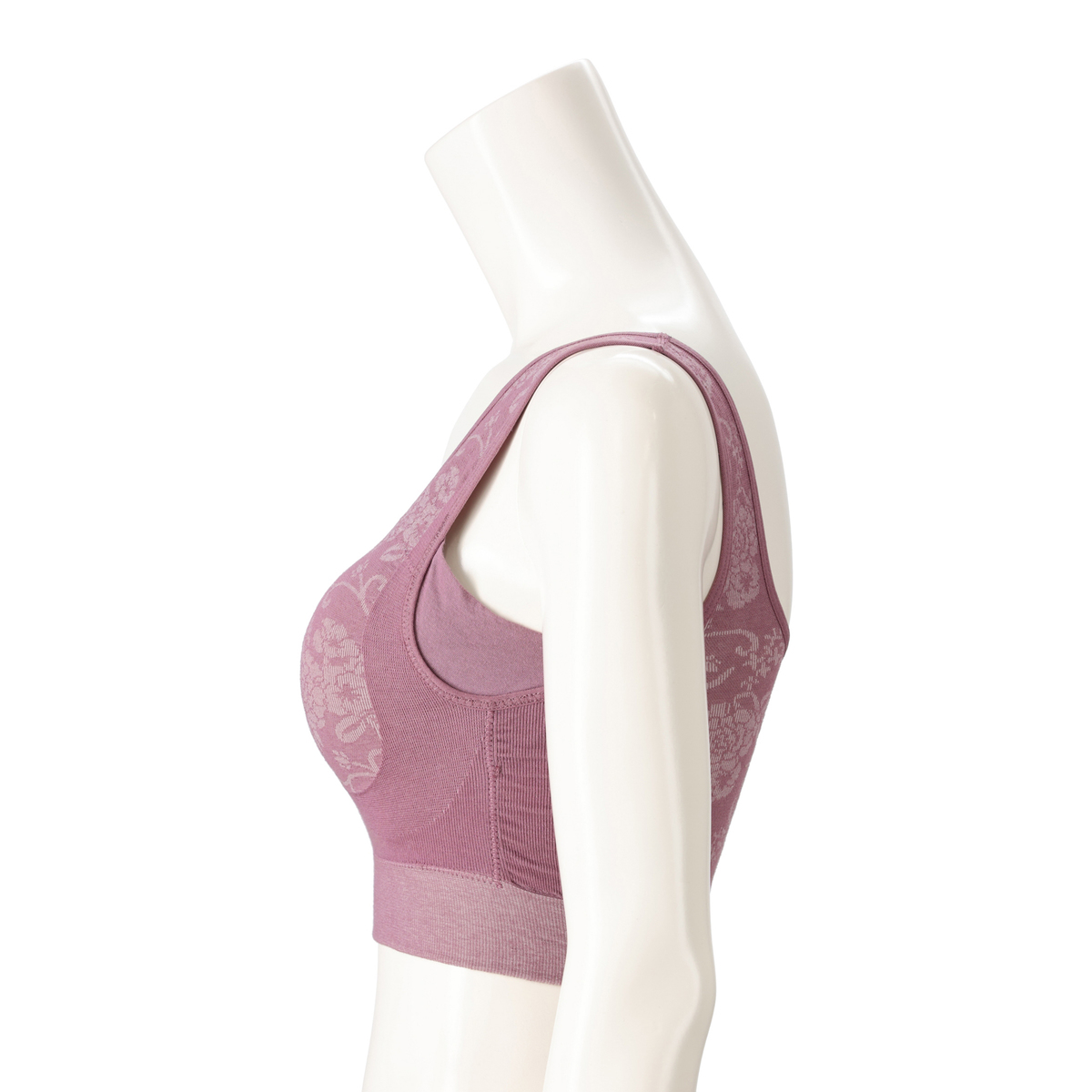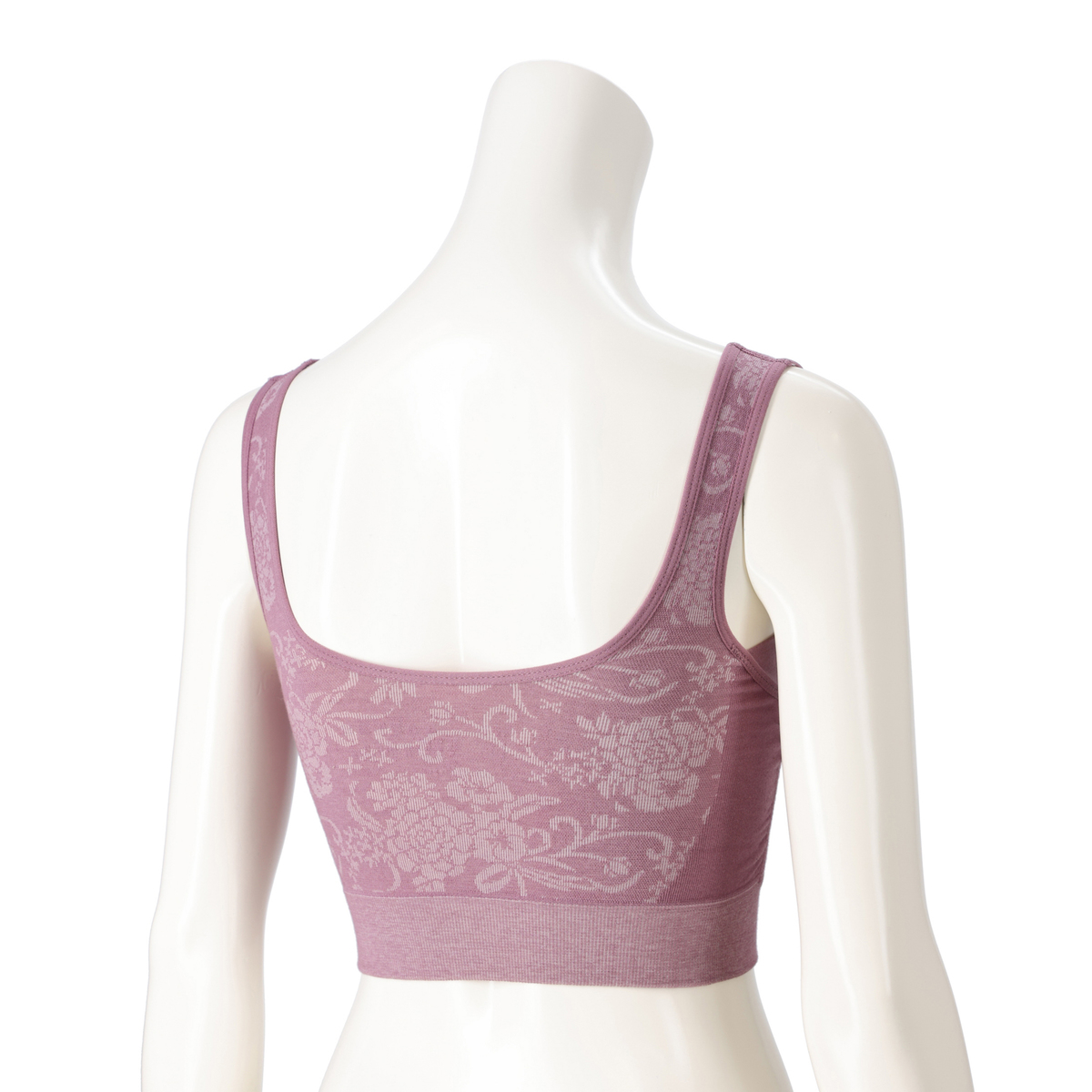 華やかなジャカード柄の補正ブラ。着るときは足元から履き上げ、身体に無理なくフィットするソフト補正タイプ。下からお肉を持ち上げながら着用するためバストをリフトアップしやすく、気軽にボディメイクできる機能性と楽な着心地が魅力。ノンワイヤーブラとしてデイリー使いしながら、スポーツやリラックスタイムのブラとしてもご活用いただけます