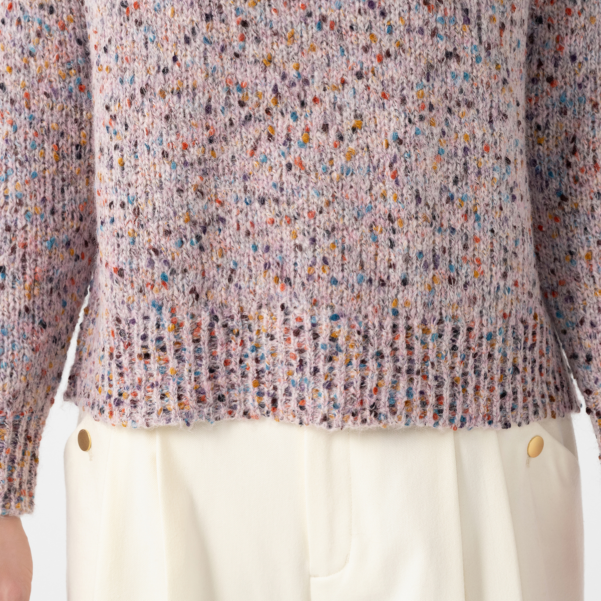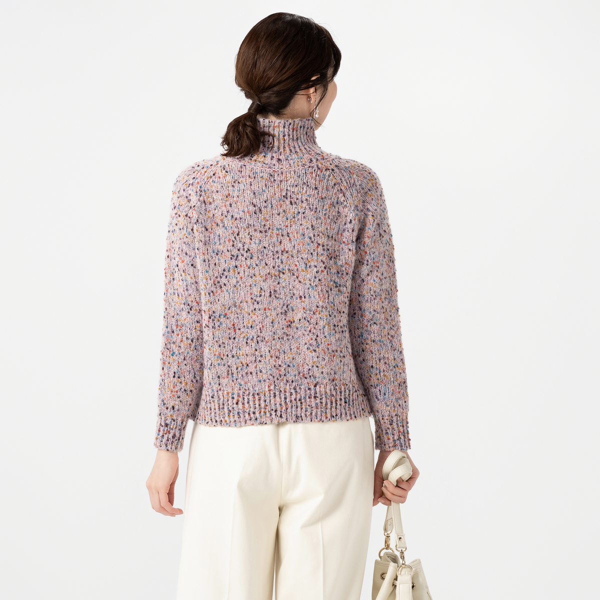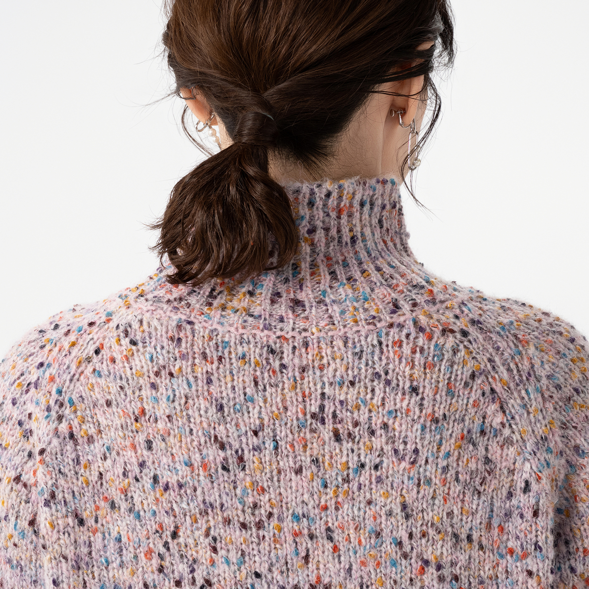 遊び心のあるキャンディカラーにレトロ感があるプルオーバー。ネップカラーの多色使いが冬の装いに明るい華やぎを与えます。ポリエステル混紡のためローゲージで軽く、ウールと混紡しているため、ふっくら暖かみのある素材です