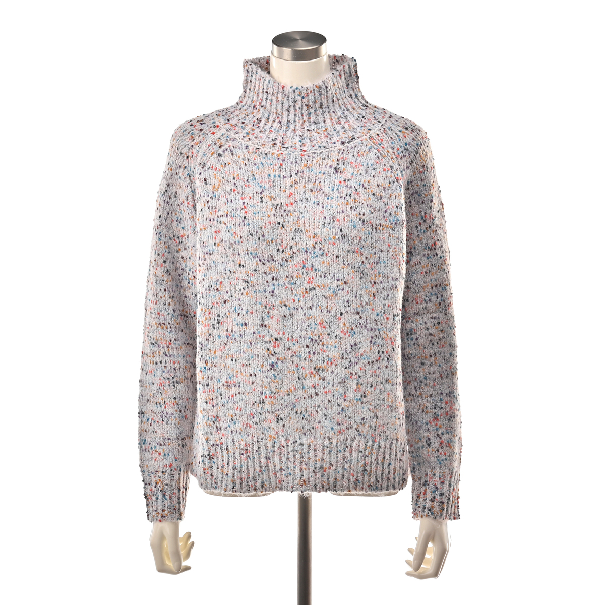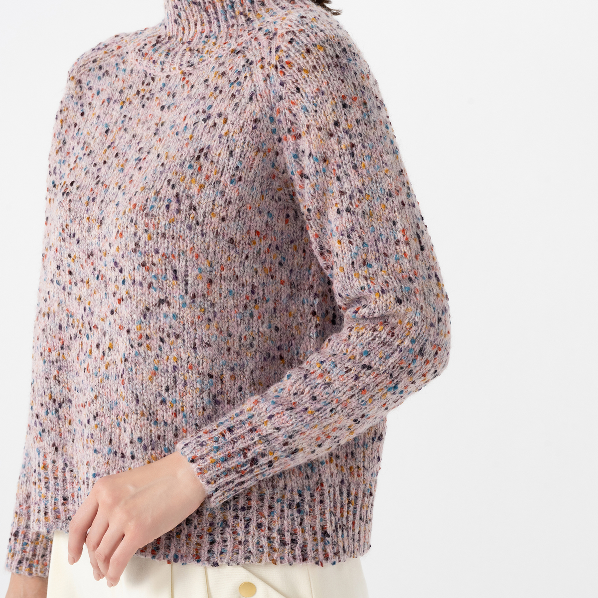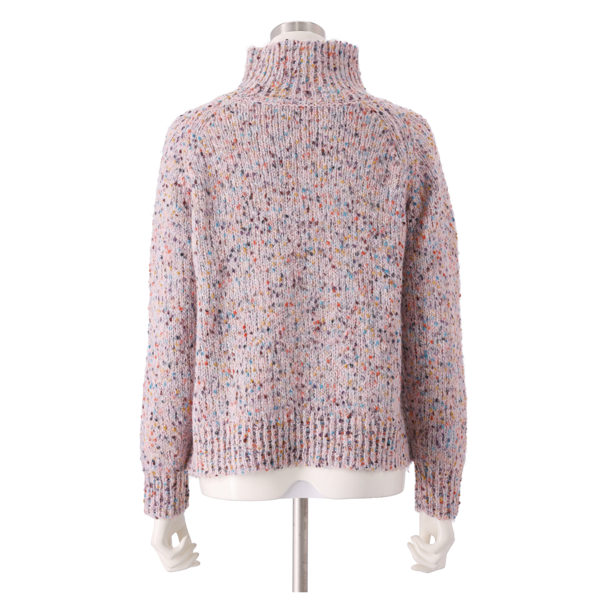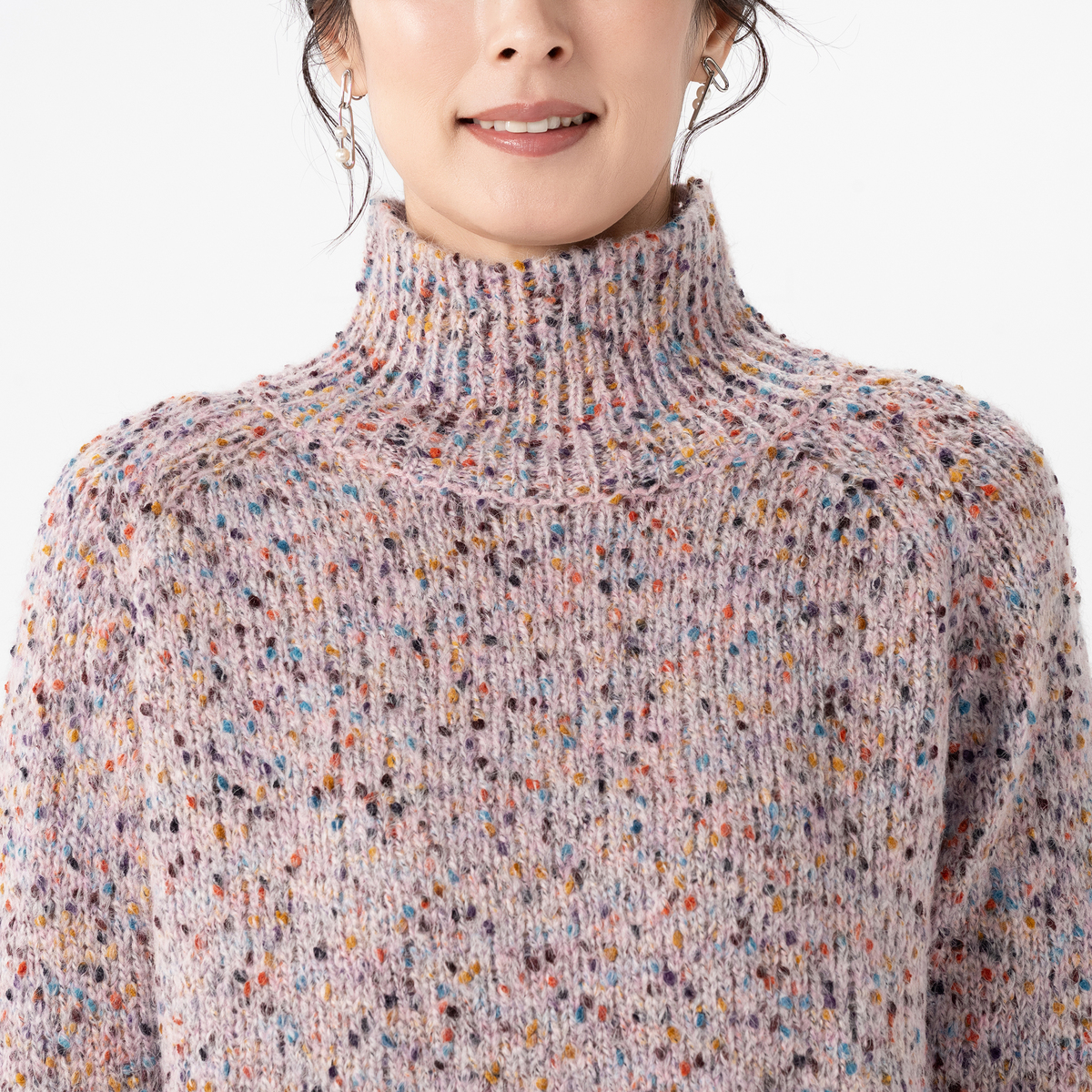 遊び心のあるキャンディカラーにレトロ感があるプルオーバー。ネップカラーの多色使いが冬の装いに明るい華やぎを与えます。ポリエステル混紡のためローゲージで軽く、ウールと混紡しているため、ふっくら暖かみのある素材です