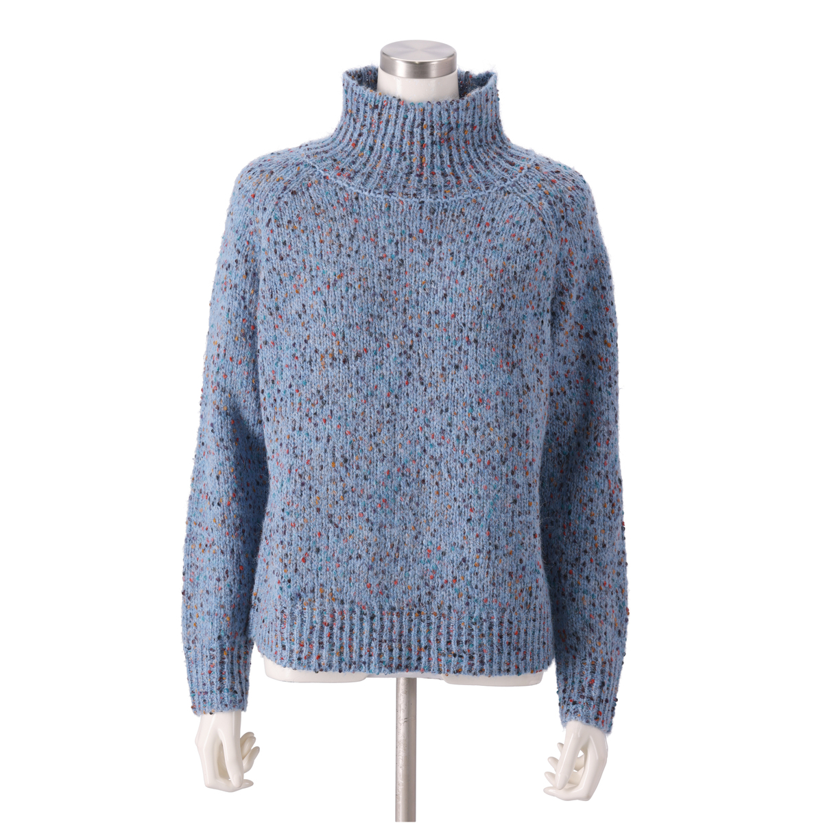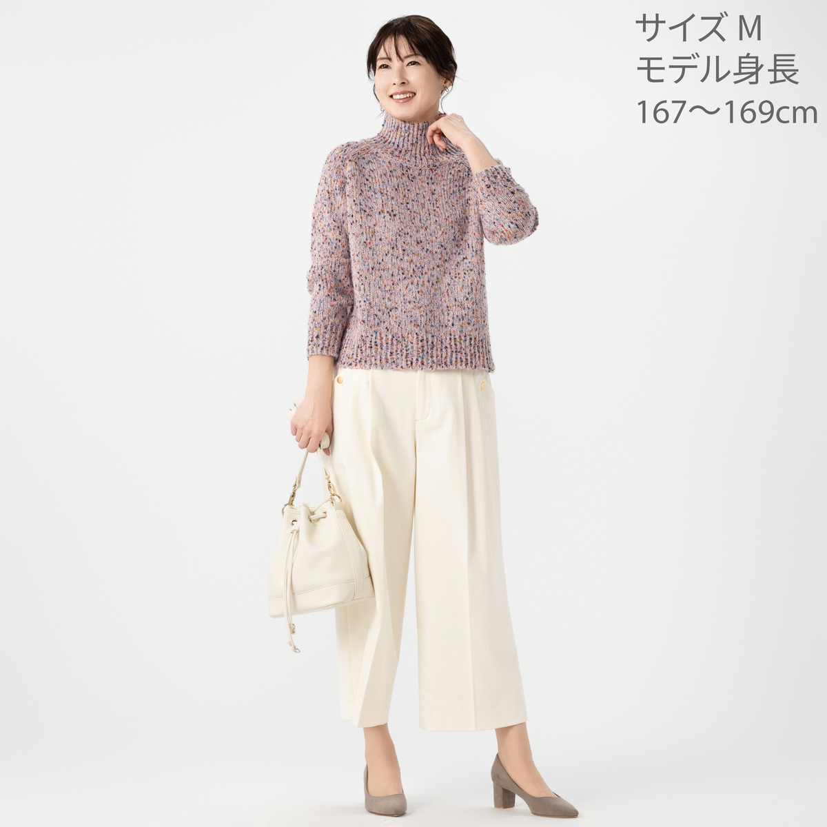 首元をすっぽり包むハイネックで締め付けを感じにくく、程よいゆとりのあるシルエット。ざっくりとした編立てで、袖口、裾、衿はリブ仕様で太いリブが可愛く、袖はラグラン仕立てでアームホールはゆったり。ウエストはややくびれたラインで、細見え効果にも期待できます