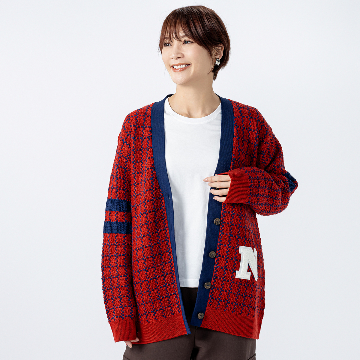 適度なV開きで着回しやすいアイテム。袖のラインと前立てが同色で、左前身頃に配色のサガラ刺繍のロゴを入れ、カレッジスタイルを元にしたレタードカーディガンを、大人風にアレンジしたスタイルです